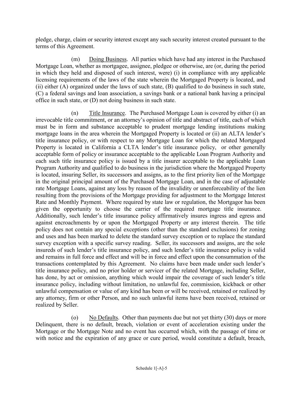 pledge, charge, claim or security interest except any such security interest created pursuant to the terms of this Agreement. (m) Doing Business. All parties which have had any interest in the Purchased Mortgage Loan, whether as mortgagee, assignee, pledgee or otherwise, are (or, during the period in which they held and disposed of such interest, were) (i) in compliance with any applicable licensing requirements of the laws of the state wherein the Mortgaged Property is located, and (ii) either (A) organized under the laws of such state, (B) qualified to do business in such state, (C) a federal savings and loan association, a savings bank or a national bank having a principal office in such state, or (D) not doing business in such state. (n) Title Insurance. The Purchased Mortgage Loan is covered by either (i) an irrevocable title commitment, or an attorney’s opinion of title and abstract of title, each of which must be in form and substance acceptable to prudent mortgage lending institutions making mortgage loans in the area wherein the Mortgaged Property is located or (ii) an ALTA lender’s title insurance policy, or with respect to any Mortgage Loan for which the related Mortgaged Property is located in California a CLTA lender’s title insurance policy, or other generally acceptable form of policy or insurance acceptable to the applicable Loan Program Authority and each such title insurance policy is issued by a title insurer acceptable to the applicable Loan Program Authority and qualified to do business in the jurisdiction where the Mortgaged Property is located, insuring Seller, its successors and assigns, as to the first priority lien of the Mortgage in the original principal amount of the Purchased Mortgage Loan, and in the case of adjustable rate Mortgage Loans, against any loss by reason of the invalidity or unenforceability of the lien resulting from the provisions of the Mortgage providing for adjustment to the Mortgage Interest Rate and Monthly Payment. Where required by state law or regulation, the Mortgagor has been given the opportunity to choose the carrier of the required mortgage title insurance. Additionally, such lender’s title insurance policy affirmatively insures ingress and egress and against encroachments by or upon the Mortgaged Property or any interest therein. The title policy does not contain any special exceptions (other than the standard exclusions) for zoning and uses and has been marked to delete the standard survey exception or to replace the standard survey exception with a specific survey reading. Seller, its successors and assigns, are the sole insureds of such lender’s title insurance policy, and such lender’s title insurance policy is valid and remains in full force and effect and will be in force and effect upon the consummation of the transactions contemplated by this Agreement. No claims have been made under such lender’s title insurance policy, and no prior holder or servicer of the related Mortgage, including Seller, has done, by act or omission, anything which would impair the coverage of such lender’s title insurance policy, including without limitation, no unlawful fee, commission, kickback or other unlawful compensation or value of any kind has been or will be received, retained or realized by any attorney, firm or other Person, and no such unlawful items have been received, retained or realized by Seller. (o) No Defaults. Other than payments due but not yet thirty (30) days or more Delinquent, there is no default, breach, violation or event of acceleration existing under the Mortgage or the Mortgage Note and no event has occurred which, with the passage of time or with notice and the expiration of any grace or cure period, would constitute a default, breach, Schedule 1[-A]-5