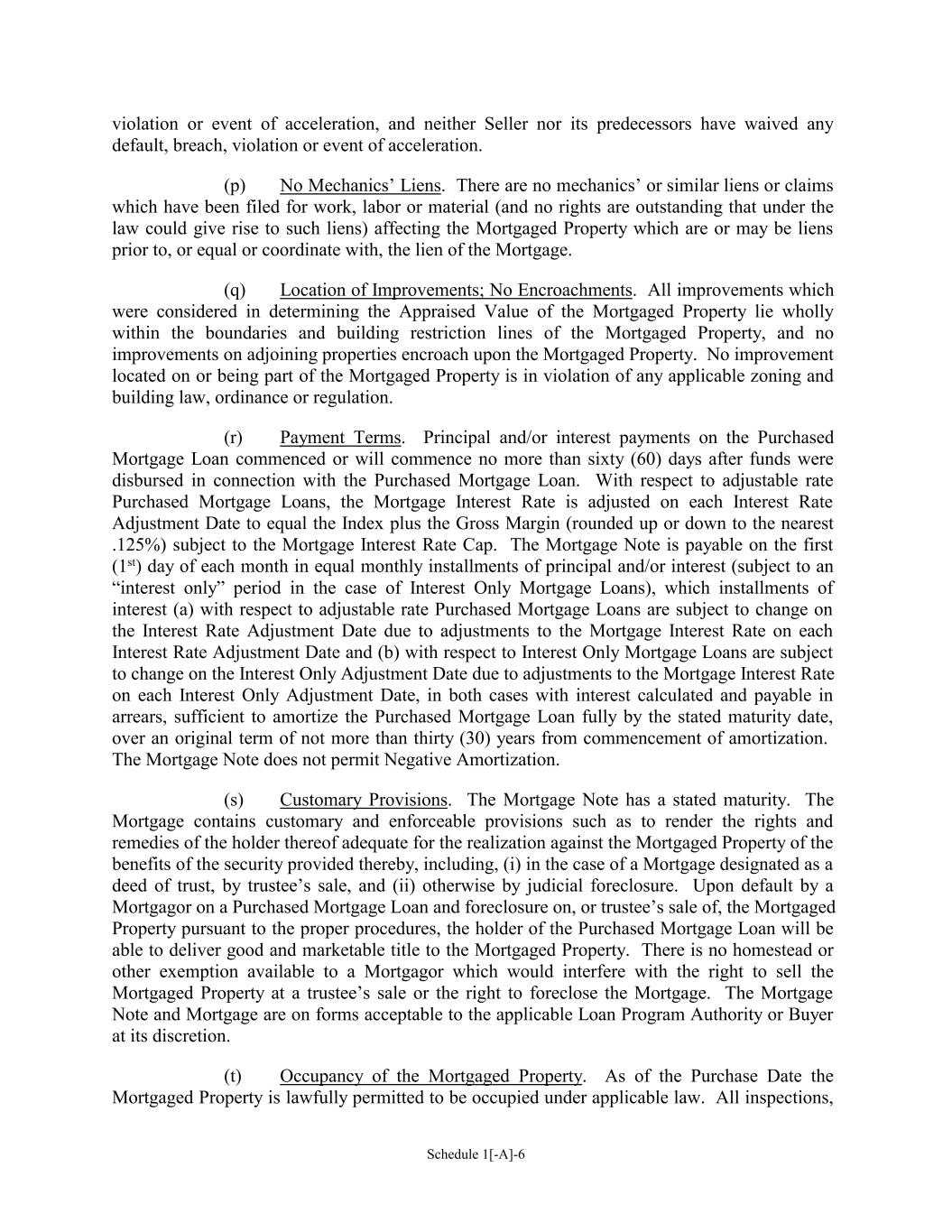 violation or event of acceleration, and neither Seller nor its predecessors have waived any default, breach, violation or event of acceleration. (p) No Mechanics’ Liens. There are no mechanics’ or similar liens or claims which have been filed for work, labor or material (and no rights are outstanding that under the law could give rise to such liens) affecting the Mortgaged Property which are or may be liens prior to, or equal or coordinate with, the lien of the Mortgage. (q) Location of Improvements; No Encroachments. All improvements which were considered in determining the Appraised Value of the Mortgaged Property lie wholly within the boundaries and building restriction lines of the Mortgaged Property, and no improvements on adjoining properties encroach upon the Mortgaged Property. No improvement located on or being part of the Mortgaged Property is in violation of any applicable zoning and building law, ordinance or regulation. (r) Payment Terms. Principal and/or interest payments on the Purchased Mortgage Loan commenced or will commence no more than sixty (60) days after funds were disbursed in connection with the Purchased Mortgage Loan. With respect to adjustable rate Purchased Mortgage Loans, the Mortgage Interest Rate is adjusted on each Interest Rate Adjustment Date to equal the Index plus the Gross Margin (rounded up or down to the nearest .125%) subject to the Mortgage Interest Rate Cap. The Mortgage Note is payable on the first (1st) day of each month in equal monthly installments of principal and/or interest (subject to an “interest only” period in the case of Interest Only Mortgage Loans), which installments of interest (a) with respect to adjustable rate Purchased Mortgage Loans are subject to change on the Interest Rate Adjustment Date due to adjustments to the Mortgage Interest Rate on each Interest Rate Adjustment Date and (b) with respect to Interest Only Mortgage Loans are subject to change on the Interest Only Adjustment Date due to adjustments to the Mortgage Interest Rate on each Interest Only Adjustment Date, in both cases with interest calculated and payable in arrears, sufficient to amortize the Purchased Mortgage Loan fully by the stated maturity date, over an original term of not more than thirty (30) years from commencement of amortization. The Mortgage Note does not permit Negative Amortization. (s) Customary Provisions. The Mortgage Note has a stated maturity. The Mortgage contains customary and enforceable provisions such as to render the rights and remedies of the holder thereof adequate for the realization against the Mortgaged Property of the benefits of the security provided thereby, including, (i) in the case of a Mortgage designated as a deed of trust, by trustee’s sale, and (ii) otherwise by judicial foreclosure. Upon default by a Mortgagor on a Purchased Mortgage Loan and foreclosure on, or trustee’s sale of, the Mortgaged Property pursuant to the proper procedures, the holder of the Purchased Mortgage Loan will be able to deliver good and marketable title to the Mortgaged Property. There is no homestead or other exemption available to a Mortgagor which would interfere with the right to sell the Mortgaged Property at a trustee’s sale or the right to foreclose the Mortgage. The Mortgage Note and Mortgage are on forms acceptable to the applicable Loan Program Authority or Buyer at its discretion. (t) Occupancy of the Mortgaged Property. As of the Purchase Date the Mortgaged Property is lawfully permitted to be occupied under applicable law. All inspections, Schedule 1[-A]-6