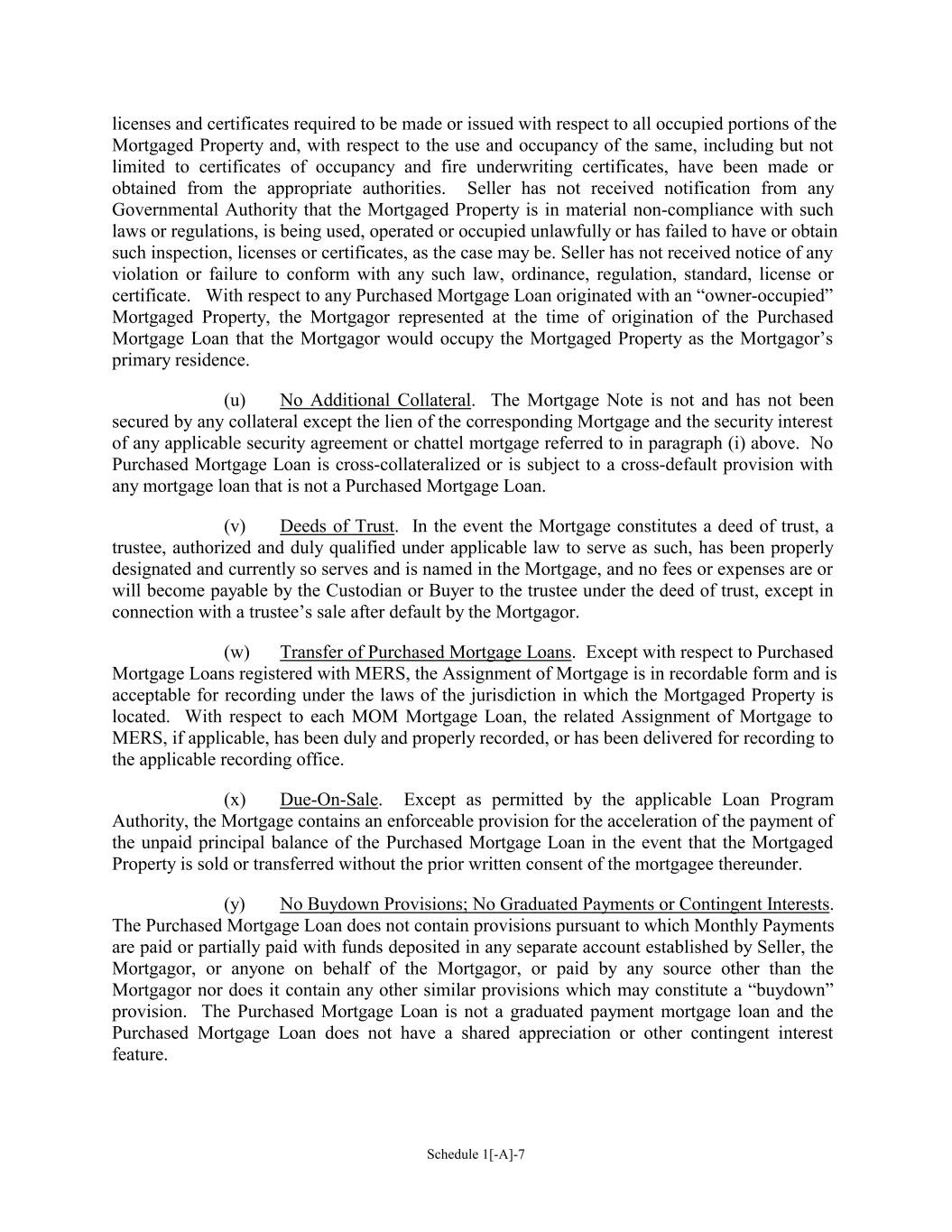 licenses and certificates required to be made or issued with respect to all occupied portions of the Mortgaged Property and, with respect to the use and occupancy of the same, including but not limited to certificates of occupancy and fire underwriting certificates, have been made or obtained from the appropriate authorities. Seller has not received notification from any Governmental Authority that the Mortgaged Property is in material non-compliance with such laws or regulations, is being used, operated or occupied unlawfully or has failed to have or obtain such inspection, licenses or certificates, as the case may be. Seller has not received notice of any violation or failure to conform with any such law, ordinance, regulation, standard, license or certificate. With respect to any Purchased Mortgage Loan originated with an “owner-occupied” Mortgaged Property, the Mortgagor represented at the time of origination of the Purchased Mortgage Loan that the Mortgagor would occupy the Mortgaged Property as the Mortgagor’s primary residence. (u) No Additional Collateral. The Mortgage Note is not and has not been secured by any collateral except the lien of the corresponding Mortgage and the security interest of any applicable security agreement or chattel mortgage referred to in paragraph (i) above. No Purchased Mortgage Loan is cross-collateralized or is subject to a cross-default provision with any mortgage loan that is not a Purchased Mortgage Loan. (v) Deeds of Trust. In the event the Mortgage constitutes a deed of trust, a trustee, authorized and duly qualified under applicable law to serve as such, has been properly designated and currently so serves and is named in the Mortgage, and no fees or expenses are or will become payable by the Custodian or Buyer to the trustee under the deed of trust, except in connection with a trustee’s sale after default by the Mortgagor. (w) Transfer of Purchased Mortgage Loans. Except with respect to Purchased Mortgage Loans registered with MERS, the Assignment of Mortgage is in recordable form and is acceptable for recording under the laws of the jurisdiction in which the Mortgaged Property is located. With respect to each MOM Mortgage Loan, the related Assignment of Mortgage to MERS, if applicable, has been duly and properly recorded, or has been delivered for recording to the applicable recording office. (x) Due-On-Sale. Except as permitted by the applicable Loan Program Authority, the Mortgage contains an enforceable provision for the acceleration of the payment of the unpaid principal balance of the Purchased Mortgage Loan in the event that the Mortgaged Property is sold or transferred without the prior written consent of the mortgagee thereunder. (y) No Buydown Provisions; No Graduated Payments or Contingent Interests. The Purchased Mortgage Loan does not contain provisions pursuant to which Monthly Payments are paid or partially paid with funds deposited in any separate account established by Seller, the Mortgagor, or anyone on behalf of the Mortgagor, or paid by any source other than the Mortgagor nor does it contain any other similar provisions which may constitute a “buydown” provision. The Purchased Mortgage Loan is not a graduated payment mortgage loan and the Purchased Mortgage Loan does not have a shared appreciation or other contingent interest feature. Schedule 1[-A]-7