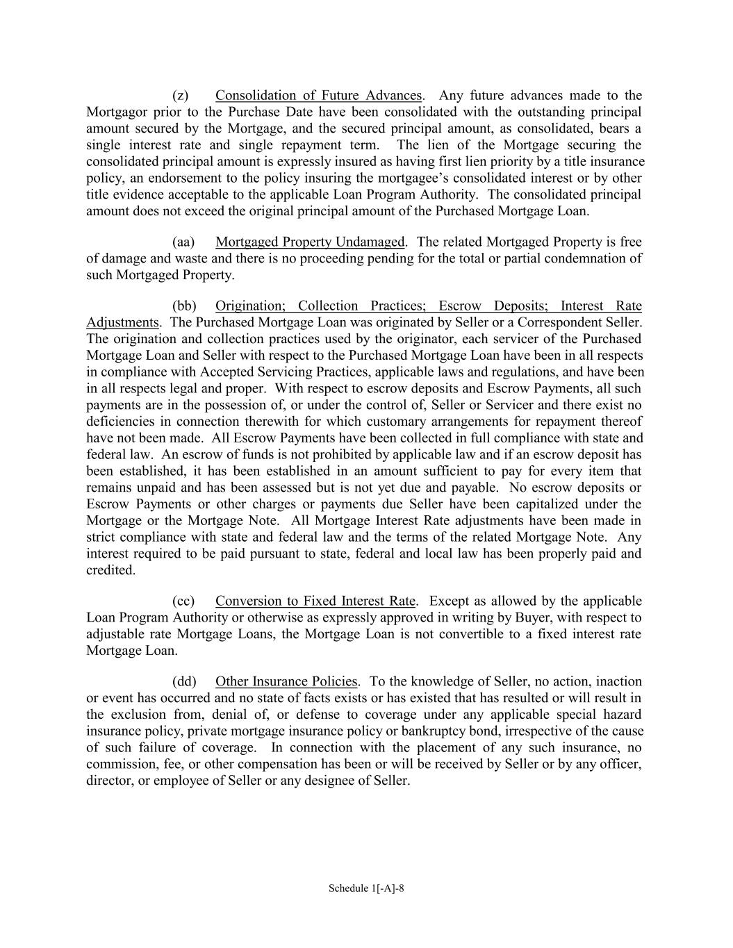(z) Consolidation of Future Advances. Any future advances made to the Mortgagor prior to the Purchase Date have been consolidated with the outstanding principal amount secured by the Mortgage, and the secured principal amount, as consolidated, bears a single interest rate and single repayment term. The lien of the Mortgage securing the consolidated principal amount is expressly insured as having first lien priority by a title insurance policy, an endorsement to the policy insuring the mortgagee’s consolidated interest or by other title evidence acceptable to the applicable Loan Program Authority. The consolidated principal amount does not exceed the original principal amount of the Purchased Mortgage Loan. (aa) Mortgaged Property Undamaged. The related Mortgaged Property is free of damage and waste and there is no proceeding pending for the total or partial condemnation of such Mortgaged Property. (bb) Origination; Collection Practices; Escrow Deposits; Interest Rate Adjustments. The Purchased Mortgage Loan was originated by Seller or a Correspondent Seller. The origination and collection practices used by the originator, each servicer of the Purchased Mortgage Loan and Seller with respect to the Purchased Mortgage Loan have been in all respects in compliance with Accepted Servicing Practices, applicable laws and regulations, and have been in all respects legal and proper. With respect to escrow deposits and Escrow Payments, all such payments are in the possession of, or under the control of, Seller or Servicer and there exist no deficiencies in connection therewith for which customary arrangements for repayment thereof have not been made. All Escrow Payments have been collected in full compliance with state and federal law. An escrow of funds is not prohibited by applicable law and if an escrow deposit has been established, it has been established in an amount sufficient to pay for every item that remains unpaid and has been assessed but is not yet due and payable. No escrow deposits or Escrow Payments or other charges or payments due Seller have been capitalized under the Mortgage or the Mortgage Note. All Mortgage Interest Rate adjustments have been made in strict compliance with state and federal law and the terms of the related Mortgage Note. Any interest required to be paid pursuant to state, federal and local law has been properly paid and credited. (cc) Conversion to Fixed Interest Rate. Except as allowed by the applicable Loan Program Authority or otherwise as expressly approved in writing by Buyer, with respect to adjustable rate Mortgage Loans, the Mortgage Loan is not convertible to a fixed interest rate Mortgage Loan. (dd) Other Insurance Policies. To the knowledge of Seller, no action, inaction or event has occurred and no state of facts exists or has existed that has resulted or will result in the exclusion from, denial of, or defense to coverage under any applicable special hazard insurance policy, private mortgage insurance policy or bankruptcy bond, irrespective of the cause of such failure of coverage. In connection with the placement of any such insurance, no commission, fee, or other compensation has been or will be received by Seller or by any officer, director, or employee of Seller or any designee of Seller. Schedule 1[-A]-8