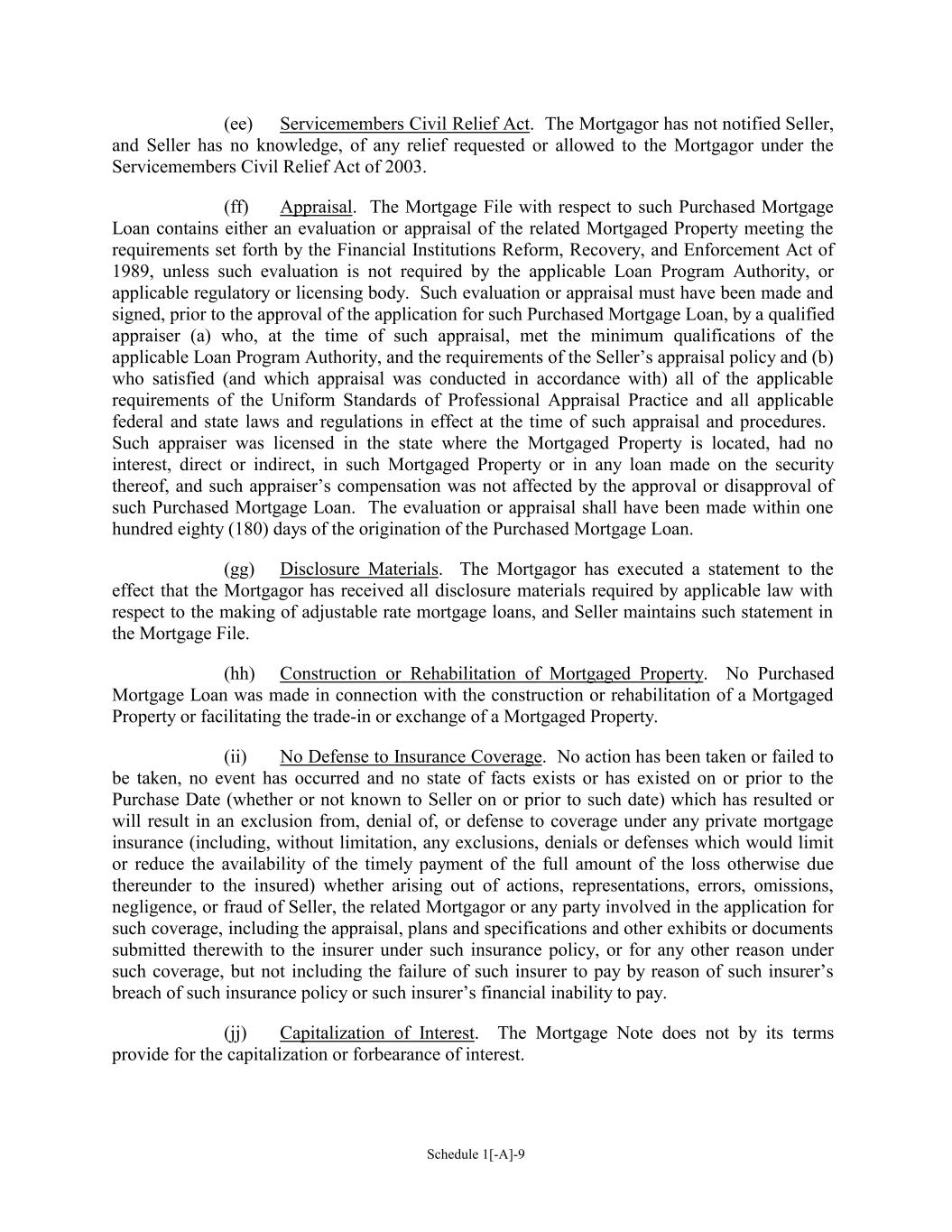 (ee) Servicemembers Civil Relief Act. The Mortgagor has not notified Seller, and Seller has no knowledge, of any relief requested or allowed to the Mortgagor under the Servicemembers Civil Relief Act of 2003. (ff) Appraisal. The Mortgage File with respect to such Purchased Mortgage Loan contains either an evaluation or appraisal of the related Mortgaged Property meeting the requirements set forth by the Financial Institutions Reform, Recovery, and Enforcement Act of 1989, unless such evaluation is not required by the applicable Loan Program Authority, or applicable regulatory or licensing body. Such evaluation or appraisal must have been made and signed, prior to the approval of the application for such Purchased Mortgage Loan, by a qualified appraiser (a) who, at the time of such appraisal, met the minimum qualifications of the applicable Loan Program Authority, and the requirements of the Seller’s appraisal policy and (b) who satisfied (and which appraisal was conducted in accordance with) all of the applicable requirements of the Uniform Standards of Professional Appraisal Practice and all applicable federal and state laws and regulations in effect at the time of such appraisal and procedures. Such appraiser was licensed in the state where the Mortgaged Property is located, had no interest, direct or indirect, in such Mortgaged Property or in any loan made on the security thereof, and such appraiser’s compensation was not affected by the approval or disapproval of such Purchased Mortgage Loan. The evaluation or appraisal shall have been made within one hundred eighty (180) days of the origination of the Purchased Mortgage Loan. (gg) Disclosure Materials. The Mortgagor has executed a statement to the effect that the Mortgagor has received all disclosure materials required by applicable law with respect to the making of adjustable rate mortgage loans, and Seller maintains such statement in the Mortgage File. (hh) Construction or Rehabilitation of Mortgaged Property. No Purchased Mortgage Loan was made in connection with the construction or rehabilitation of a Mortgaged Property or facilitating the trade-in or exchange of a Mortgaged Property. (ii) No Defense to Insurance Coverage. No action has been taken or failed to be taken, no event has occurred and no state of facts exists or has existed on or prior to the Purchase Date (whether or not known to Seller on or prior to such date) which has resulted or will result in an exclusion from, denial of, or defense to coverage under any private mortgage insurance (including, without limitation, any exclusions, denials or defenses which would limit or reduce the availability of the timely payment of the full amount of the loss otherwise due thereunder to the insured) whether arising out of actions, representations, errors, omissions, negligence, or fraud of Seller, the related Mortgagor or any party involved in the application for such coverage, including the appraisal, plans and specifications and other exhibits or documents submitted therewith to the insurer under such insurance policy, or for any other reason under such coverage, but not including the failure of such insurer to pay by reason of such insurer’s breach of such insurance policy or such insurer’s financial inability to pay. (jj) Capitalization of Interest. The Mortgage Note does not by its terms provide for the capitalization or forbearance of interest. Schedule 1[-A]-9