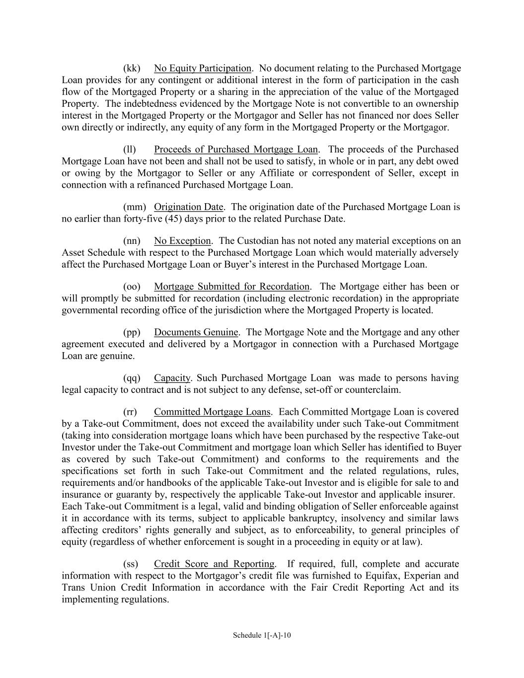 (kk) No Equity Participation. No document relating to the Purchased Mortgage Loan provides for any contingent or additional interest in the form of participation in the cash flow of the Mortgaged Property or a sharing in the appreciation of the value of the Mortgaged Property. The indebtedness evidenced by the Mortgage Note is not convertible to an ownership interest in the Mortgaged Property or the Mortgagor and Seller has not financed nor does Seller own directly or indirectly, any equity of any form in the Mortgaged Property or the Mortgagor. (ll) Proceeds of Purchased Mortgage Loan. The proceeds of the Purchased Mortgage Loan have not been and shall not be used to satisfy, in whole or in part, any debt owed or owing by the Mortgagor to Seller or any Affiliate or correspondent of Seller, except in connection with a refinanced Purchased Mortgage Loan. (mm) Origination Date. The origination date of the Purchased Mortgage Loan is no earlier than forty-five (45) days prior to the related Purchase Date. (nn) No Exception. The Custodian has not noted any material exceptions on an Asset Schedule with respect to the Purchased Mortgage Loan which would materially adversely affect the Purchased Mortgage Loan or Buyer’s interest in the Purchased Mortgage Loan. (oo) Mortgage Submitted for Recordation. The Mortgage either has been or will promptly be submitted for recordation (including electronic recordation) in the appropriate governmental recording office of the jurisdiction where the Mortgaged Property is located. (pp) Documents Genuine. The Mortgage Note and the Mortgage and any other agreement executed and delivered by a Mortgagor in connection with a Purchased Mortgage Loan are genuine. (qq) Capacity. Such Purchased Mortgage Loan was made to persons having legal capacity to contract and is not subject to any defense, set-off or counterclaim. (rr) Committed Mortgage Loans. Each Committed Mortgage Loan is covered by a Take-out Commitment, does not exceed the availability under such Take-out Commitment (taking into consideration mortgage loans which have been purchased by the respective Take-out Investor under the Take-out Commitment and mortgage loan which Seller has identified to Buyer as covered by such Take-out Commitment) and conforms to the requirements and the specifications set forth in such Take-out Commitment and the related regulations, rules, requirements and/or handbooks of the applicable Take-out Investor and is eligible for sale to and insurance or guaranty by, respectively the applicable Take-out Investor and applicable insurer. Each Take-out Commitment is a legal, valid and binding obligation of Seller enforceable against it in accordance with its terms, subject to applicable bankruptcy, insolvency and similar laws affecting creditors’ rights generally and subject, as to enforceability, to general principles of equity (regardless of whether enforcement is sought in a proceeding in equity or at law). (ss) Credit Score and Reporting. If required, full, complete and accurate information with respect to the Mortgagor’s credit file was furnished to Equifax, Experian and Trans Union Credit Information in accordance with the Fair Credit Reporting Act and its implementing regulations. Schedule 1[-A]-10