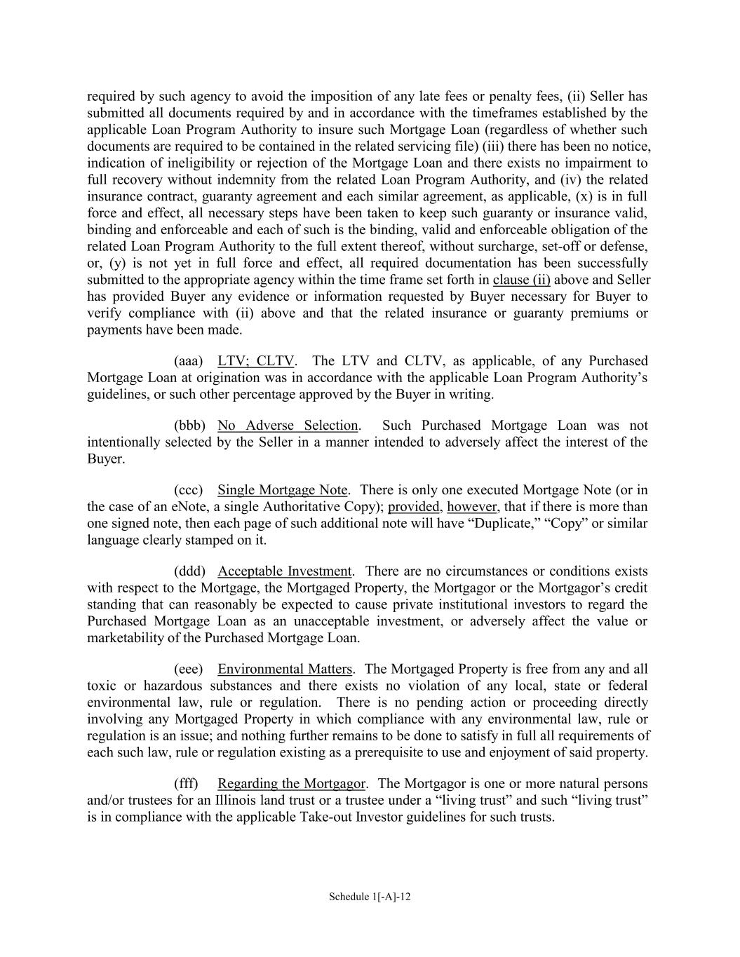 required by such agency to avoid the imposition of any late fees or penalty fees, (ii) Seller has submitted all documents required by and in accordance with the timeframes established by the applicable Loan Program Authority to insure such Mortgage Loan (regardless of whether such documents are required to be contained in the related servicing file) (iii) there has been no notice, indication of ineligibility or rejection of the Mortgage Loan and there exists no impairment to full recovery without indemnity from the related Loan Program Authority, and (iv) the related insurance contract, guaranty agreement and each similar agreement, as applicable, (x) is in full force and effect, all necessary steps have been taken to keep such guaranty or insurance valid, binding and enforceable and each of such is the binding, valid and enforceable obligation of the related Loan Program Authority to the full extent thereof, without surcharge, set-off or defense, or, (y) is not yet in full force and effect, all required documentation has been successfully submitted to the appropriate agency within the time frame set forth in clause (ii) above and Seller has provided Buyer any evidence or information requested by Buyer necessary for Buyer to verify compliance with (ii) above and that the related insurance or guaranty premiums or payments have been made. (aaa) LTV; CLTV. The LTV and CLTV, as applicable, of any Purchased Mortgage Loan at origination was in accordance with the applicable Loan Program Authority’s guidelines, or such other percentage approved by the Buyer in writing. (bbb) No Adverse Selection. Such Purchased Mortgage Loan was not intentionally selected by the Seller in a manner intended to adversely affect the interest of the Buyer. (ccc) Single Mortgage Note. There is only one executed Mortgage Note (or in the case of an eNote, a single Authoritative Copy); provided, however, that if there is more than one signed note, then each page of such additional note will have “Duplicate,” “Copy” or similar language clearly stamped on it. (ddd) Acceptable Investment. There are no circumstances or conditions exists with respect to the Mortgage, the Mortgaged Property, the Mortgagor or the Mortgagor’s credit standing that can reasonably be expected to cause private institutional investors to regard the Purchased Mortgage Loan as an unacceptable investment, or adversely affect the value or marketability of the Purchased Mortgage Loan. (eee) Environmental Matters. The Mortgaged Property is free from any and all toxic or hazardous substances and there exists no violation of any local, state or federal environmental law, rule or regulation. There is no pending action or proceeding directly involving any Mortgaged Property in which compliance with any environmental law, rule or regulation is an issue; and nothing further remains to be done to satisfy in full all requirements of each such law, rule or regulation existing as a prerequisite to use and enjoyment of said property. (fff) Regarding the Mortgagor. The Mortgagor is one or more natural persons and/or trustees for an Illinois land trust or a trustee under a “living trust” and such “living trust” is in compliance with the applicable Take-out Investor guidelines for such trusts. Schedule 1[-A]-12