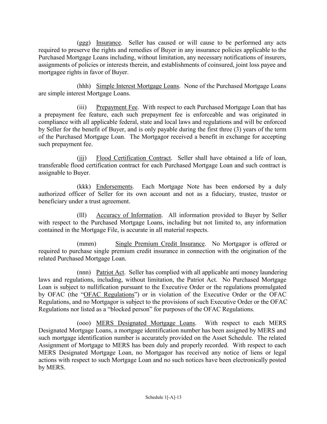 (ggg) Insurance. Seller has caused or will cause to be performed any acts required to preserve the rights and remedies of Buyer in any insurance policies applicable to the Purchased Mortgage Loans including, without limitation, any necessary notifications of insurers, assignments of policies or interests therein, and establishments of coinsured, joint loss payee and mortgagee rights in favor of Buyer. (hhh) Simple Interest Mortgage Loans. None of the Purchased Mortgage Loans are simple interest Mortgage Loans. (iii) Prepayment Fee. With respect to each Purchased Mortgage Loan that has a prepayment fee feature, each such prepayment fee is enforceable and was originated in compliance with all applicable federal, state and local laws and regulations and will be enforced by Seller for the benefit of Buyer, and is only payable during the first three (3) years of the term of the Purchased Mortgage Loan. The Mortgagor received a benefit in exchange for accepting such prepayment fee. (jjj) Flood Certification Contract. Seller shall have obtained a life of loan, transferable flood certification contract for each Purchased Mortgage Loan and such contract is assignable to Buyer. (kkk) Endorsements. Each Mortgage Note has been endorsed by a duly authorized officer of Seller for its own account and not as a fiduciary, trustee, trustor or beneficiary under a trust agreement. (lll) Accuracy of Information. All information provided to Buyer by Seller with respect to the Purchased Mortgage Loans, including but not limited to, any information contained in the Mortgage File, is accurate in all material respects. (mmm) Single Premium Credit Insurance. No Mortgagor is offered or required to purchase single premium credit insurance in connection with the origination of the related Purchased Mortgage Loan. (nnn) Patriot Act. Seller has complied with all applicable anti money laundering laws and regulations, including, without limitation, the Patriot Act. No Purchased Mortgage Loan is subject to nullification pursuant to the Executive Order or the regulations promulgated by OFAC (the “OFAC Regulations”) or in violation of the Executive Order or the OFAC Regulations, and no Mortgagor is subject to the provisions of such Executive Order or the OFAC Regulations nor listed as a “blocked person” for purposes of the OFAC Regulations. (ooo) MERS Designated Mortgage Loans. With respect to each MERS Designated Mortgage Loans, a mortgage identification number has been assigned by MERS and such mortgage identification number is accurately provided on the Asset Schedule. The related Assignment of Mortgage to MERS has been duly and properly recorded. With respect to each MERS Designated Mortgage Loan, no Mortgagor has received any notice of liens or legal actions with respect to such Mortgage Loan and no such notices have been electronically posted by MERS. Schedule 1[-A]-13