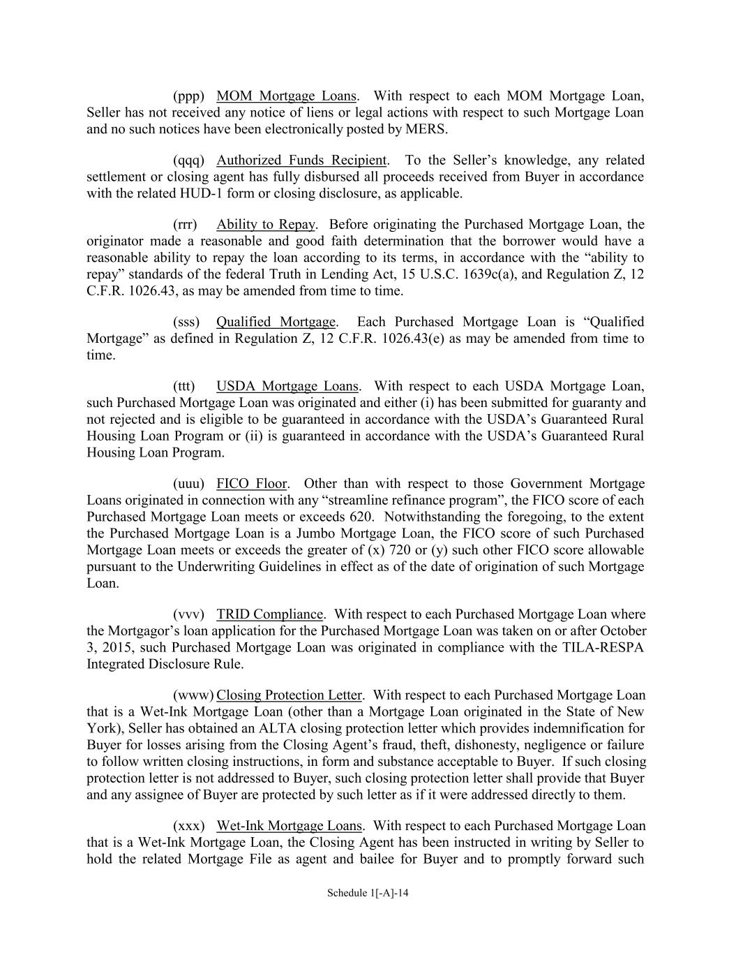 (ppp) MOM Mortgage Loans. With respect to each MOM Mortgage Loan, Seller has not received any notice of liens or legal actions with respect to such Mortgage Loan and no such notices have been electronically posted by MERS. (qqq) Authorized Funds Recipient. To the Seller’s knowledge, any related settlement or closing agent has fully disbursed all proceeds received from Buyer in accordance with the related HUD-1 form or closing disclosure, as applicable. (rrr) Ability to Repay. Before originating the Purchased Mortgage Loan, the originator made a reasonable and good faith determination that the borrower would have a reasonable ability to repay the loan according to its terms, in accordance with the “ability to repay” standards of the federal Truth in Lending Act, 15 U.S.C. 1639c(a), and Regulation Z, 12 C.F.R. 1026.43, as may be amended from time to time. (sss) Qualified Mortgage. Each Purchased Mortgage Loan is “Qualified Mortgage” as defined in Regulation Z, 12 C.F.R. 1026.43(e) as may be amended from time to time. (ttt) USDA Mortgage Loans. With respect to each USDA Mortgage Loan, such Purchased Mortgage Loan was originated and either (i) has been submitted for guaranty and not rejected and is eligible to be guaranteed in accordance with the USDA’s Guaranteed Rural Housing Loan Program or (ii) is guaranteed in accordance with the USDA’s Guaranteed Rural Housing Loan Program. (uuu) FICO Floor. Other than with respect to those Government Mortgage Loans originated in connection with any “streamline refinance program”, the FICO score of each Purchased Mortgage Loan meets or exceeds 620. Notwithstanding the foregoing, to the extent the Purchased Mortgage Loan is a Jumbo Mortgage Loan, the FICO score of such Purchased Mortgage Loan meets or exceeds the greater of (x) 720 or (y) such other FICO score allowable pursuant to the Underwriting Guidelines in effect as of the date of origination of such Mortgage Loan. (vvv) TRID Compliance. With respect to each Purchased Mortgage Loan where the Mortgagor’s loan application for the Purchased Mortgage Loan was taken on or after October 3, 2015, such Purchased Mortgage Loan was originated in compliance with the TILA-RESPA Integrated Disclosure Rule. (www) Closing Protection Letter. With respect to each Purchased Mortgage Loan that is a Wet-Ink Mortgage Loan (other than a Mortgage Loan originated in the State of New York), Seller has obtained an ALTA closing protection letter which provides indemnification for Buyer for losses arising from the Closing Agent’s fraud, theft, dishonesty, negligence or failure to follow written closing instructions, in form and substance acceptable to Buyer. If such closing protection letter is not addressed to Buyer, such closing protection letter shall provide that Buyer and any assignee of Buyer are protected by such letter as if it were addressed directly to them. (xxx) Wet-Ink Mortgage Loans. With respect to each Purchased Mortgage Loan that is a Wet-Ink Mortgage Loan, the Closing Agent has been instructed in writing by Seller to hold the related Mortgage File as agent and bailee for Buyer and to promptly forward such Schedule 1[-A]-14