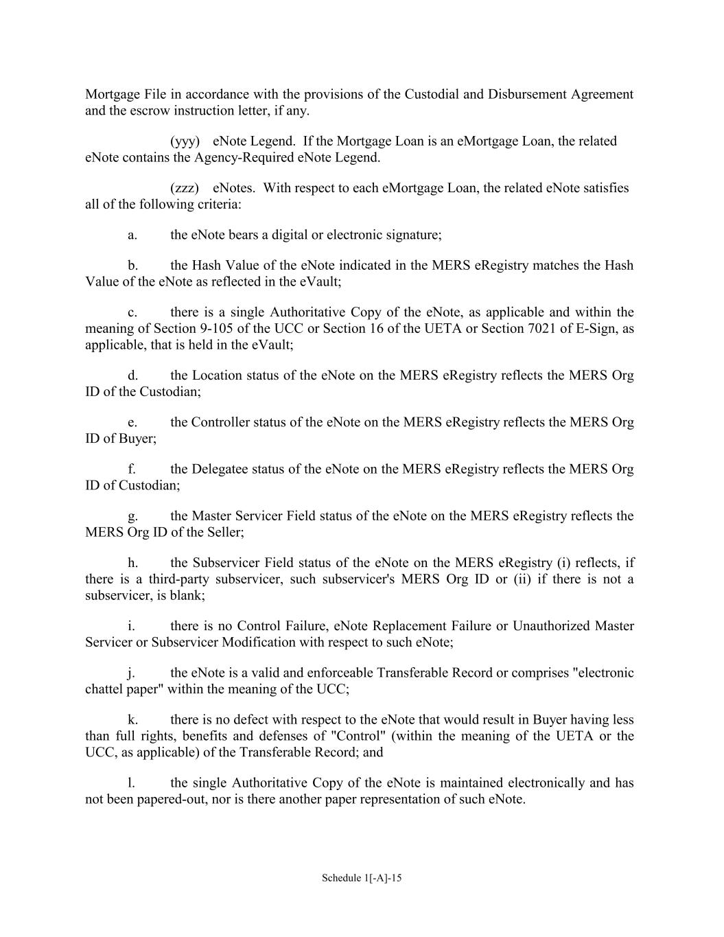Mortgage File in accordance with the provisions of the Custodial and Disbursement Agreement and the escrow instruction letter, if any. (yyy) eNote Legend. If the Mortgage Loan is an eMortgage Loan, the related eNote contains the Agency-Required eNote Legend. (zzz) eNotes. With respect to each eMortgage Loan, the related eNote satisfies all of the following criteria: a. the eNote bears a digital or electronic signature; b. the Hash Value of the eNote indicated in the MERS eRegistry matches the Hash Value of the eNote as reflected in the eVault; c. there is a single Authoritative Copy of the eNote, as applicable and within the meaning of Section 9-105 of the UCC or Section 16 of the UETA or Section 7021 of E-Sign, as applicable, that is held in the eVault; d. the Location status of the eNote on the MERS eRegistry reflects the MERS Org ID of the Custodian; e. the Controller status of the eNote on the MERS eRegistry reflects the MERS Org ID of Buyer; f. the Delegatee status of the eNote on the MERS eRegistry reflects the MERS Org ID of Custodian; g. the Master Servicer Field status of the eNote on the MERS eRegistry reflects the MERS Org ID of the Seller; h. the Subservicer Field status of the eNote on the MERS eRegistry (i) reflects, if there is a third-party subservicer, such subservicer's MERS Org ID or (ii) if there is not a subservicer, is blank; i. there is no Control Failure, eNote Replacement Failure or Unauthorized Master Servicer or Subservicer Modification with respect to such eNote; j. the eNote is a valid and enforceable Transferable Record or comprises "electronic chattel paper" within the meaning of the UCC; k. there is no defect with respect to the eNote that would result in Buyer having less than full rights, benefits and defenses of "Control" (within the meaning of the UETA or the UCC, as applicable) of the Transferable Record; and l. the single Authoritative Copy of the eNote is maintained electronically and has not been papered-out, nor is there another paper representation of such eNote. Schedule 1[-A]-15