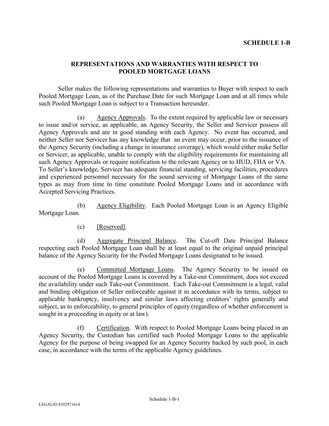 SCHEDULE 1-B REPRESENTATIONS AND WARRANTIES WITH RESPECT TO POOLED MORTGAGE LOANS Seller makes the following representations and warranties to Buyer with respect to each Pooled Mortgage Loan, as of the Purchase Date for such Mortgage Loan and at all times while such Pooled Mortgage Loan is subject to a Transaction hereunder. (a) Agency Approvals. To the extent required by applicable law or necessary to issue and/or service, as applicable, an Agency Security, the Seller and Servicer possess all Agency Approvals and are in good standing with each Agency. No event has occurred, and neither Seller nor Servicer has any knowledge that an event may occur, prior to the issuance of the Agency Security (including a change in insurance coverage), which would either make Seller or Servicer, as applicable, unable to comply with the eligibility requirements for maintaining all such Agency Approvals or require notification to the relevant Agency or to HUD, FHA or VA. To Seller’s knowledge, Servicer has adequate financial standing, servicing facilities, procedures and experienced personnel necessary for the sound servicing of Mortgage Loans of the same types as may from time to time constitute Pooled Mortgage Loans and in accordance with Accepted Servicing Practices. (b) Agency Eligibility. Each Pooled Mortgage Loan is an Agency Eligible Mortgage Loan. (c) [Reserved]. (d) Aggregate Principal Balance. The Cut-off Date Principal Balance respecting each Pooled Mortgage Loan shall be at least equal to the original unpaid principal balance of the Agency Security for the Pooled Mortgage Loans designated to be issued. (e) Committed Mortgage Loans. The Agency Security to be issued on account of the Pooled Mortgage Loans is covered by a Take-out Commitment, does not exceed the availability under such Take-out Commitment. Each Take-out Commitment is a legal, valid and binding obligation of Seller enforceable against it in accordance with its terms, subject to applicable bankruptcy, insolvency and similar laws affecting creditors’ rights generally and subject, as to enforceability, to general principles of equity (regardless of whether enforcement is sought in a proceeding in equity or at law). (f) Certification. With respect to Pooled Mortgage Loans being placed in an Agency Security, the Custodian has certified such Pooled Mortgage Loans to the applicable Agency for the purpose of being swapped for an Agency Security backed by such pool, in each case, in accordance with the terms of the applicable Agency guidelines. Schedule 1-B-1 LEGAL02/41029716v4