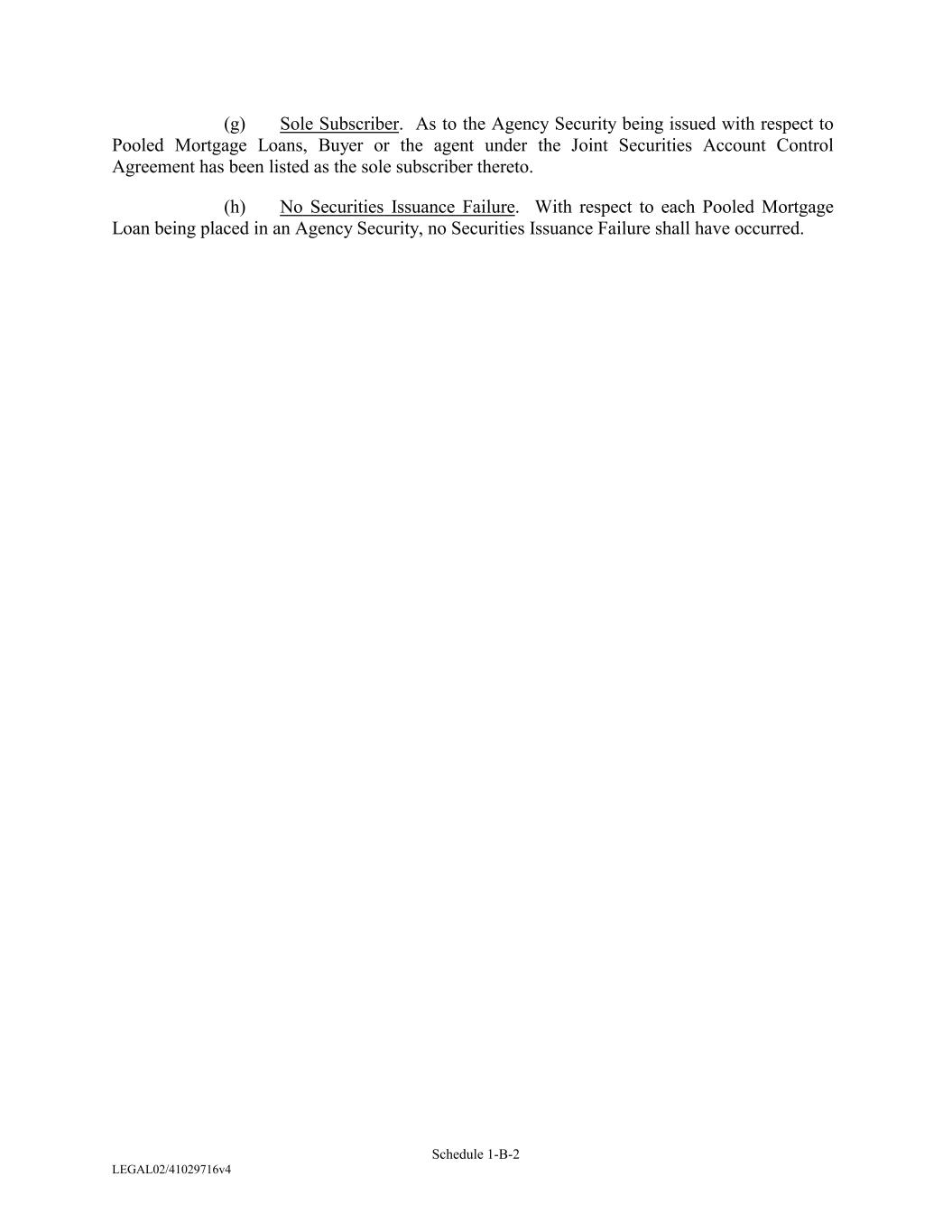 (g) Sole Subscriber. As to the Agency Security being issued with respect to Pooled Mortgage Loans, Buyer or the agent under the Joint Securities Account Control Agreement has been listed as the sole subscriber thereto. (h) No Securities Issuance Failure. With respect to each Pooled Mortgage Loan being placed in an Agency Security, no Securities Issuance Failure shall have occurred. Schedule 1-B-2 LEGAL02/41029716v4