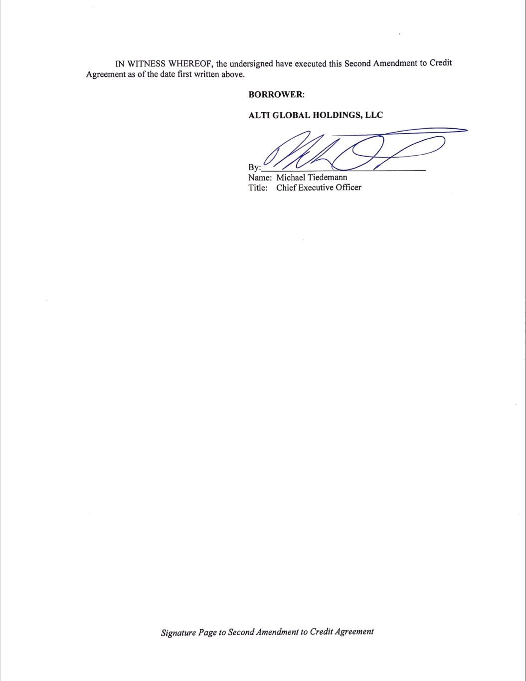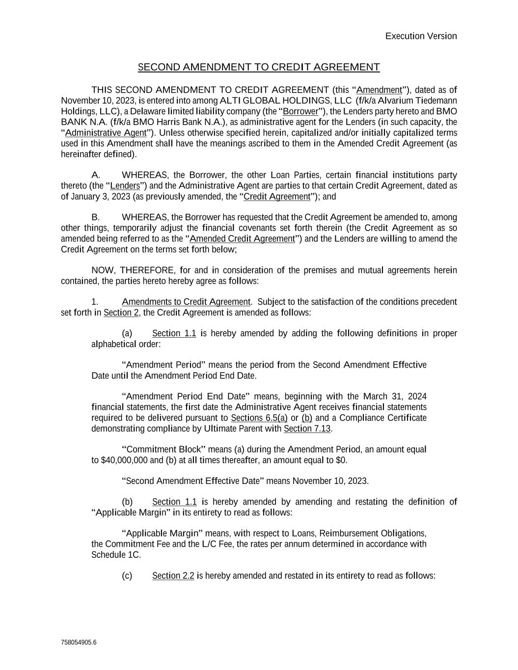 Execution Version 758054905.6 SECOND AMENDMENT TO CREDIT AGREEMENT THIS SECOND AMENDMENT TO CREDIT AGREEMENT (this “Amendment”), dated as of November 10, 2023, is entered into among ALTI GLOBAL HOLDINGS, LLC (f/k/a Alvarium Tiedemann Holdings, LLC), a Delaware limited liability company (the “Borrower”), the Lenders party hereto and BMO BANK N.A. (f/k/a BMO Harris Bank N.A.), as administrative agent for the Lenders (in such capacity, the “Administrative Agent”). Unless otherwise specified herein, capitalized and/or initially capitalized terms used in this Amendment shall have the meanings ascribed to them in the Amended Credit Agreement (as hereinafter defined). A. WHEREAS, the Borrower, the other Loan Parties, certain financial institutions party thereto (the “Lenders”) and the Administrative Agent are parties to that certain Credit Agreement, dated as of January 3, 2023 (as previously amended, the “Credit Agreement”); and B. WHEREAS, the Borrower has requested that the Credit Agreement be amended to, among other things, temporarily adjust the financial covenants set forth therein (the Credit Agreement as so amended being referred to as the “Amended Credit Agreement”) and the Lenders are willing to amend the Credit Agreement on the terms set forth below; NOW, THEREFORE, for and in consideration of the premises and mutual agreements herein contained, the parties hereto hereby agree as follows: 1. Amendments to Credit Agreement. Subject to the satisfaction of the conditions precedent set forth in Section 2, the Credit Agreement is amended as follows: (a) Section 1.1 is hereby amended by adding the following definitions in proper alphabetical order: “Amendment Period” means the period from the Second Amendment Effective Date until the Amendment Period End Date. “Amendment Period End Date” means, beginning with the March 31, 2024 financial statements, the first date the Administrative Agent receives financial statements required to be delivered pursuant to Sections 6.5(a) or (b) and a Compliance Certificate demonstrating compliance by Ultimate Parent with Section 7.13. “Commitment Block” means (a) during the Amendment Period, an amount equal to $40,000,000 and (b) at all times thereafter, an amount equal to $0. “Second Amendment Effective Date” means November 10, 2023. (b) Section 1.1 is hereby amended by amending and restating the definition of “Applicable Margin” in its entirety to read as follows: “Applicable Margin” means, with respect to Loans, Reimbursement Obligations, the Commitment Fee and the L/C Fee, the rates per annum determined in accordance with Schedule 1C. (c) Section 2.2 is hereby amended and restated in its entirety to read as follows: