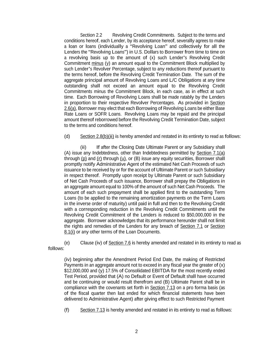 2 Section 2.2 Revolving Credit Commitments. Subject to the terms and conditions hereof, each Lender, by its acceptance hereof, severally agrees to make a loan or loans (individually a “Revolving Loan” and collectively for all the Lenders the “Revolving Loans”) in U.S. Dollars to Borrower from time to time on a revolving basis up to the amount of (x) such Lender’s Revolving Credit Commitment minus (y) an amount equal to the Commitment Block multiplied by such Lender’s Revolver Percentage, subject to any reductions thereof pursuant to the terms hereof, before the Revolving Credit Termination Date. The sum of the aggregate principal amount of Revolving Loans and L/C Obligations at any time outstanding shall not exceed an amount equal to the Revolving Credit Commitments minus the Commitment Block, in each case, as in effect at such time. Each Borrowing of Revolving Loans shall be made ratably by the Lenders in proportion to their respective Revolver Percentages. As provided in Section 2.6(a), Borrower may elect that each Borrowing of Revolving Loans be either Base Rate Loans or SOFR Loans. Revolving Loans may be repaid and the principal amount thereof reborrowed before the Revolving Credit Termination Date, subject to the terms and conditions hereof. (d) Section 2.8(b)(ii) is hereby amended and restated in its entirety to read as follows: (ii) If after the Closing Date Ultimate Parent or any Subsidiary shall (A) issue any Indebtedness, other than Indebtedness permitted by Section 7.1(a) through (p) and (r) through (u), or (B) issue any equity securities, Borrower shall promptly notify Administrative Agent of the estimated Net Cash Proceeds of such issuance to be received by or for the account of Ultimate Parent or such Subsidiary in respect thereof. Promptly upon receipt by Ultimate Parent or such Subsidiary of Net Cash Proceeds of such issuance, Borrower shall prepay the Obligations in an aggregate amount equal to 100% of the amount of such Net Cash Proceeds. The amount of each such prepayment shall be applied first to the outstanding Term Loans (to be applied to the remaining amortization payments on the Term Loans in the inverse order of maturity) until paid in full and then to the Revolving Credit with a corresponding reduction in the Revolving Credit Commitments until the Revolving Credit Commitment of the Lenders is reduced to $50,000,000 in the aggregate. Borrower acknowledges that its performance hereunder shall not limit the rights and remedies of the Lenders for any breach of Section 7.1 or Section 8.1(i) or any other terms of the Loan Documents. (e) Clause (iv) of Section 7.6 is hereby amended and restated in its entirety to read as follows: (iv) beginning after the Amendment Period End Date, the making of Restricted Payments in an aggregate amount not to exceed in any fiscal year the greater of (x) $12,000,000 and (y) 17.5% of Consolidated EBITDA for the most recently ended Test Period, provided that (A) no Default or Event of Default shall have occurred and be continuing or would result therefrom and (B) Ultimate Parent shall be in compliance with the covenants set forth in Section 7.13 on a pro forma basis (as of the fiscal quarter then last ended for which financial statements have been delivered to Administrative Agent) after giving effect to such Restricted Payment (f) Section 7.13 is hereby amended and restated in its entirety to read as follows: