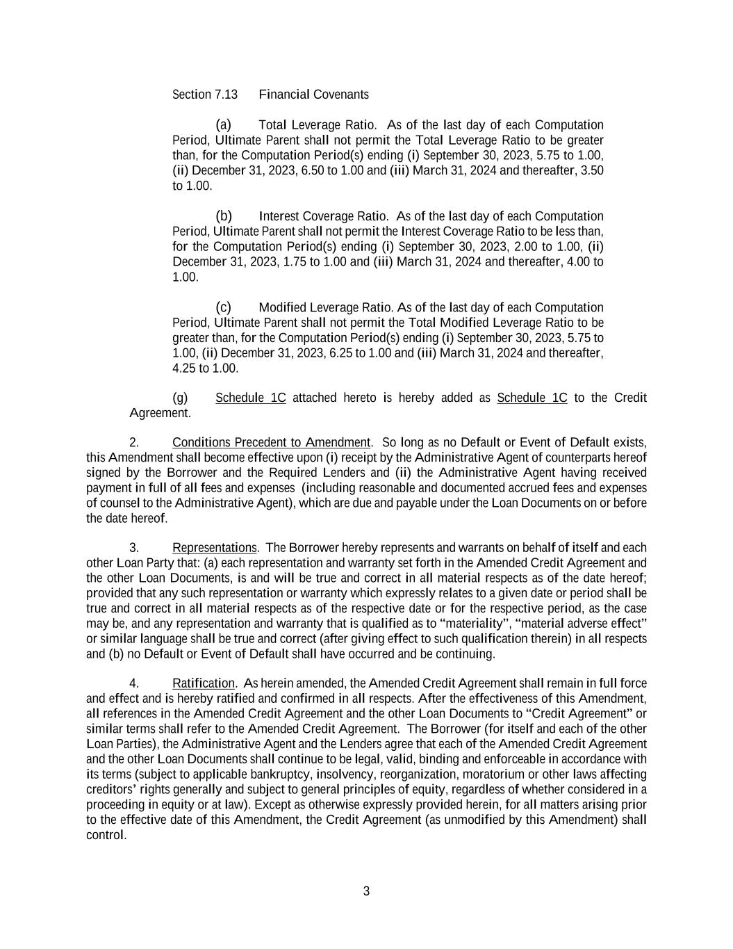 3 Section 7.13 Financial Covenants (a) Total Leverage Ratio. As of the last day of each Computation Period, Ultimate Parent shall not permit the Total Leverage Ratio to be greater than, for the Computation Period(s) ending (i) September 30, 2023, 5.75 to 1.00, (ii) December 31, 2023, 6.50 to 1.00 and (iii) March 31, 2024 and thereafter, 3.50 to 1.00. (b) Interest Coverage Ratio. As of the last day of each Computation Period, Ultimate Parent shall not permit the Interest Coverage Ratio to be less than, for the Computation Period(s) ending (i) September 30, 2023, 2.00 to 1.00, (ii) December 31, 2023, 1.75 to 1.00 and (iii) March 31, 2024 and thereafter, 4.00 to 1.00. (c) Modified Leverage Ratio. As of the last day of each Computation Period, Ultimate Parent shall not permit the Total Modified Leverage Ratio to be greater than, for the Computation Period(s) ending (i) September 30, 2023, 5.75 to 1.00, (ii) December 31, 2023, 6.25 to 1.00 and (iii) March 31, 2024 and thereafter, 4.25 to 1.00. (g) Schedule 1C attached hereto is hereby added as Schedule 1C to the Credit Agreement. 2. Conditions Precedent to Amendment. So long as no Default or Event of Default exists, this Amendment shall become effective upon (i) receipt by the Administrative Agent of counterparts hereof signed by the Borrower and the Required Lenders and (ii) the Administrative Agent having received payment in full of all fees and expenses (including reasonable and documented accrued fees and expenses of counsel to the Administrative Agent), which are due and payable under the Loan Documents on or before the date hereof. 3. Representations. The Borrower hereby represents and warrants on behalf of itself and each other Loan Party that: (a) each representation and warranty set forth in the Amended Credit Agreement and the other Loan Documents, is and will be true and correct in all material respects as of the date hereof; provided that any such representation or warranty which expressly relates to a given date or period shall be true and correct in all material respects as of the respective date or for the respective period, as the case may be, and any representation and warranty that is qualified as to “materiality”, “material adverse effect” or similar language shall be true and correct (after giving effect to such qualification therein) in all respects and (b) no Default or Event of Default shall have occurred and be continuing. 4. Ratification. As herein amended, the Amended Credit Agreement shall remain in full force and effect and is hereby ratified and confirmed in all respects. After the effectiveness of this Amendment, all references in the Amended Credit Agreement and the other Loan Documents to “Credit Agreement” or similar terms shall refer to the Amended Credit Agreement. The Borrower (for itself and each of the other Loan Parties), the Administrative Agent and the Lenders agree that each of the Amended Credit Agreement and the other Loan Documents shall continue to be legal, valid, binding and enforceable in accordance with its terms (subject to applicable bankruptcy, insolvency, reorganization, moratorium or other laws affecting creditors’ rights generally and subject to general principles of equity, regardless of whether considered in a proceeding in equity or at law). Except as otherwise expressly provided herein, for all matters arising prior to the effective date of this Amendment, the Credit Agreement (as unmodified by this Amendment) shall control.