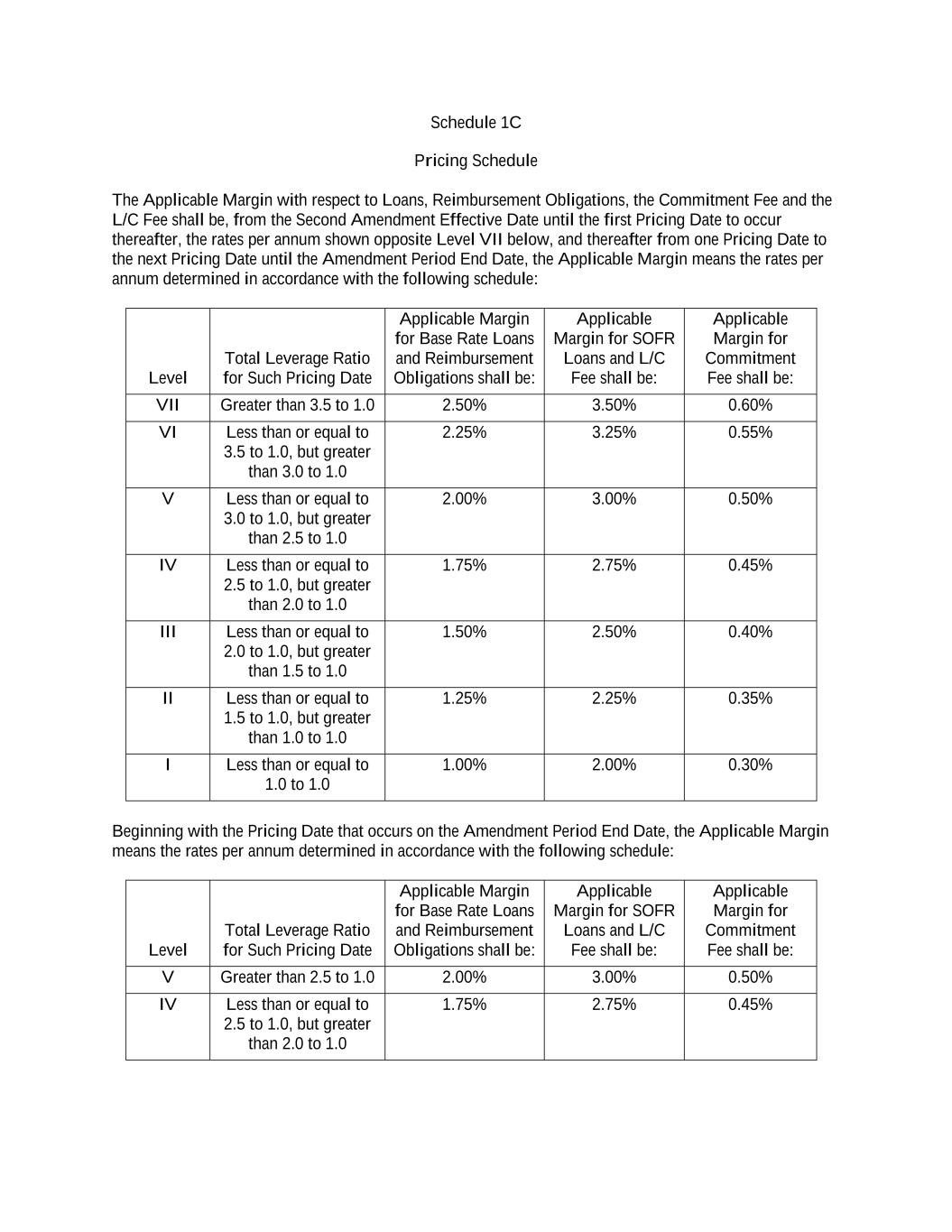 Schedule 1C Pricing Schedule The Applicable Margin with respect to Loans, Reimbursement Obligations, the Commitment Fee and the L/C Fee shall be, from the Second Amendment Effective Date until the first Pricing Date to occur thereafter, the rates per annum shown opposite Level VII below, and thereafter from one Pricing Date to the next Pricing Date until the Amendment Period End Date, the Applicable Margin means the rates per annum determined in accordance with the following schedule: Level Total Leverage Ratio for Such Pricing Date Applicable Margin for Base Rate Loans and Reimbursement Obligations shall be: Applicable Margin for SOFR Loans and L/C Fee shall be: Applicable Margin for Commitment Fee shall be: VII Greater than 3.5 to 1.0 2.50% 3.50% 0.60% VI Less than or equal to 3.5 to 1.0, but greater than 3.0 to 1.0 2.25% 3.25% 0.55% V Less than or equal to 3.0 to 1.0, but greater than 2.5 to 1.0 2.00% 3.00% 0.50% IV Less than or equal to 2.5 to 1.0, but greater than 2.0 to 1.0 1.75% 2.75% 0.45% III Less than or equal to 2.0 to 1.0, but greater than 1.5 to 1.0 1.50% 2.50% 0.40% II Less than or equal to 1.5 to 1.0, but greater than 1.0 to 1.0 1.25% 2.25% 0.35% I Less than or equal to 1.0 to 1.0 1.00% 2.00% 0.30% Beginning with the Pricing Date that occurs on the Amendment Period End Date, the Applicable Margin means the rates per annum determined in accordance with the following schedule: Level Total Leverage Ratio for Such Pricing Date Applicable Margin for Base Rate Loans and Reimbursement Obligations shall be: Applicable Margin for SOFR Loans and L/C Fee shall be: Applicable Margin for Commitment Fee shall be: V Greater than 2.5 to 1.0 2.00% 3.00% 0.50% IV Less than or equal to 2.5 to 1.0, but greater than 2.0 to 1.0 1.75% 2.75% 0.45%