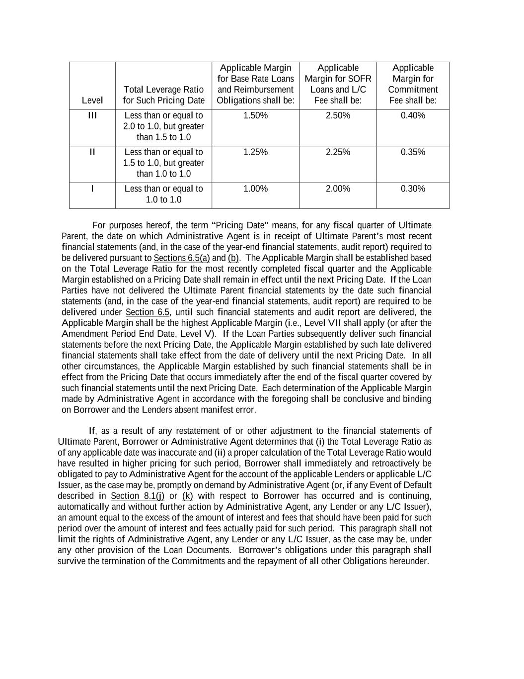 Level Total Leverage Ratio for Such Pricing Date Applicable Margin for Base Rate Loans and Reimbursement Obligations shall be: Applicable Margin for SOFR Loans and L/C Fee shall be: Applicable Margin for Commitment Fee shall be: III Less than or equal to 2.0 to 1.0, but greater than 1.5 to 1.0 1.50% 2.50% 0.40% II Less than or equal to 1.5 to 1.0, but greater than 1.0 to 1.0 1.25% 2.25% 0.35% I Less than or equal to 1.0 to 1.0 1.00% 2.00% 0.30% For purposes hereof, the term “Pricing Date” means, for any fiscal quarter of Ultimate Parent, the date on which Administrative Agent is in receipt of Ultimate Parent’s most recent financial statements (and, in the case of the year-end financial statements, audit report) required to be delivered pursuant to Sections 6.5(a) and (b). The Applicable Margin shall be established based on the Total Leverage Ratio for the most recently completed fiscal quarter and the Applicable Margin established on a Pricing Date shall remain in effect until the next Pricing Date. If the Loan Parties have not delivered the Ultimate Parent financial statements by the date such financial statements (and, in the case of the year-end financial statements, audit report) are required to be delivered under Section 6.5, until such financial statements and audit report are delivered, the Applicable Margin shall be the highest Applicable Margin (i.e., Level VII shall apply (or after the Amendment Period End Date, Level V). If the Loan Parties subsequently deliver such financial statements before the next Pricing Date, the Applicable Margin established by such late delivered financial statements shall take effect from the date of delivery until the next Pricing Date. In all other circumstances, the Applicable Margin established by such financial statements shall be in effect from the Pricing Date that occurs immediately after the end of the fiscal quarter covered by such financial statements until the next Pricing Date. Each determination of the Applicable Margin made by Administrative Agent in accordance with the foregoing shall be conclusive and binding on Borrower and the Lenders absent manifest error. If, as a result of any restatement of or other adjustment to the financial statements of Ultimate Parent, Borrower or Administrative Agent determines that (i) the Total Leverage Ratio as of any applicable date was inaccurate and (ii) a proper calculation of the Total Leverage Ratio would have resulted in higher pricing for such period, Borrower shall immediately and retroactively be obligated to pay to Administrative Agent for the account of the applicable Lenders or applicable L/C Issuer, as the case may be, promptly on demand by Administrative Agent (or, if any Event of Default described in Section 8.1(j) or (k) with respect to Borrower has occurred and is continuing, automatically and without further action by Administrative Agent, any Lender or any L/C Issuer), an amount equal to the excess of the amount of interest and fees that should have been paid for such period over the amount of interest and fees actually paid for such period. This paragraph shall not limit the rights of Administrative Agent, any Lender or any L/C Issuer, as the case may be, under any other provision of the Loan Documents. Borrower’s obligations under this paragraph shall survive the termination of the Commitments and the repayment of all other Obligations hereunder.