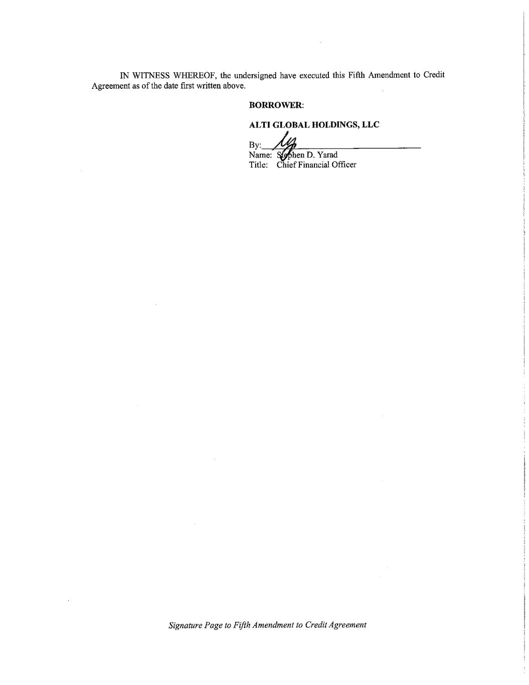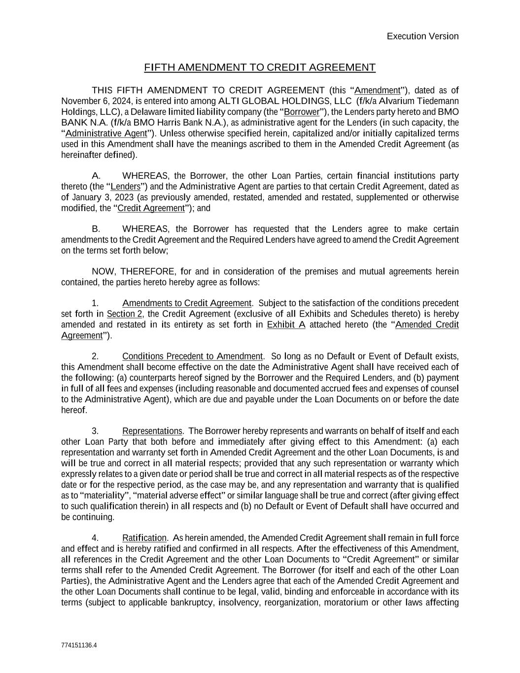 Execution Version 774151136.4 FIFTH AMENDMENT TO CREDIT AGREEMENT THIS FIFTH AMENDMENT TO CREDIT AGREEMENT (this “Amendment”), dated as of November 6, 2024, is entered into among ALTI GLOBAL HOLDINGS, LLC (f/k/a Alvarium Tiedemann Holdings, LLC), a Delaware limited liability company (the “Borrower”), the Lenders party hereto and BMO BANK N.A. (f/k/a BMO Harris Bank N.A.), as administrative agent for the Lenders (in such capacity, the “Administrative Agent”). Unless otherwise specified herein, capitalized and/or initially capitalized terms used in this Amendment shall have the meanings ascribed to them in the Amended Credit Agreement (as hereinafter defined). A. WHEREAS, the Borrower, the other Loan Parties, certain financial institutions party thereto (the “Lenders”) and the Administrative Agent are parties to that certain Credit Agreement, dated as of January 3, 2023 (as previously amended, restated, amended and restated, supplemented or otherwise modified, the “Credit Agreement”); and B. WHEREAS, the Borrower has requested that the Lenders agree to make certain amendments to the Credit Agreement and the Required Lenders have agreed to amend the Credit Agreement on the terms set forth below; NOW, THEREFORE, for and in consideration of the premises and mutual agreements herein contained, the parties hereto hereby agree as follows: 1. Amendments to Credit Agreement. Subject to the satisfaction of the conditions precedent set forth in Section 2, the Credit Agreement (exclusive of all Exhibits and Schedules thereto) is hereby amended and restated in its entirety as set forth in Exhibit A attached hereto (the “Amended Credit Agreement”). 2. Conditions Precedent to Amendment. So long as no Default or Event of Default exists, this Amendment shall become effective on the date the Administrative Agent shall have received each of the following: (a) counterparts hereof signed by the Borrower and the Required Lenders, and (b) payment in full of all fees and expenses (including reasonable and documented accrued fees and expenses of counsel to the Administrative Agent), which are due and payable under the Loan Documents on or before the date hereof. 3. Representations. The Borrower hereby represents and warrants on behalf of itself and each other Loan Party that both before and immediately after giving effect to this Amendment: (a) each representation and warranty set forth in Amended Credit Agreement and the other Loan Documents, is and will be true and correct in all material respects; provided that any such representation or warranty which expressly relates to a given date or period shall be true and correct in all material respects as of the respective date or for the respective period, as the case may be, and any representation and warranty that is qualified as to “materiality”, “material adverse effect” or similar language shall be true and correct (after giving effect to such qualification therein) in all respects and (b) no Default or Event of Default shall have occurred and be continuing. 4. Ratification. As herein amended, the Amended Credit Agreement shall remain in full force and effect and is hereby ratified and confirmed in all respects. After the effectiveness of this Amendment, all references in the Credit Agreement and the other Loan Documents to “Credit Agreement” or similar terms shall refer to the Amended Credit Agreement. The Borrower (for itself and each of the other Loan Parties), the Administrative Agent and the Lenders agree that each of the Amended Credit Agreement and the other Loan Documents shall continue to be legal, valid, binding and enforceable in accordance with its terms (subject to applicable bankruptcy, insolvency, reorganization, moratorium or other laws affecting