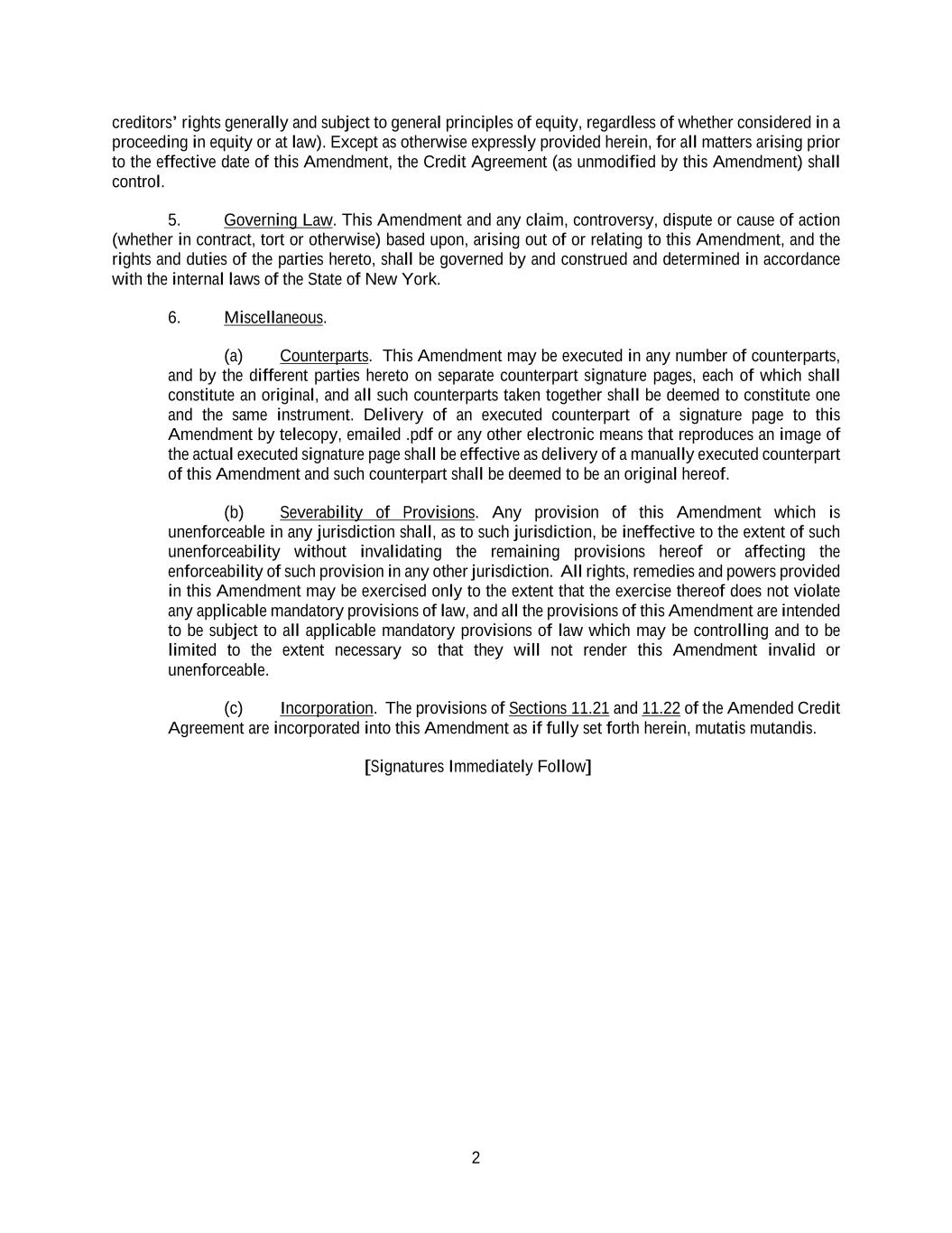 2 creditors’ rights generally and subject to general principles of equity, regardless of whether considered in a proceeding in equity or at law). Except as otherwise expressly provided herein, for all matters arising prior to the effective date of this Amendment, the Credit Agreement (as unmodified by this Amendment) shall control. 5. Governing Law. This Amendment and any claim, controversy, dispute or cause of action (whether in contract, tort or otherwise) based upon, arising out of or relating to this Amendment, and the rights and duties of the parties hereto, shall be governed by and construed and determined in accordance with the internal laws of the State of New York. 6. Miscellaneous. (a) Counterparts. This Amendment may be executed in any number of counterparts, and by the different parties hereto on separate counterpart signature pages, each of which shall constitute an original, and all such counterparts taken together shall be deemed to constitute one and the same instrument. Delivery of an executed counterpart of a signature page to this Amendment by telecopy, emailed .pdf or any other electronic means that reproduces an image of the actual executed signature page shall be effective as delivery of a manually executed counterpart of this Amendment and such counterpart shall be deemed to be an original hereof. (b) Severability of Provisions. Any provision of this Amendment which is unenforceable in any jurisdiction shall, as to such jurisdiction, be ineffective to the extent of such unenforceability without invalidating the remaining provisions hereof or affecting the enforceability of such provision in any other jurisdiction. All rights, remedies and powers provided in this Amendment may be exercised only to the extent that the exercise thereof does not violate any applicable mandatory provisions of law, and all the provisions of this Amendment are intended to be subject to all applicable mandatory provisions of law which may be controlling and to be limited to the extent necessary so that they will not render this Amendment invalid or unenforceable. (c) Incorporation. The provisions of Sections 11.21 and 11.22 of the Amended Credit Agreement are incorporated into this Amendment as if fully set forth herein, mutatis mutandis. [Signatures Immediately Follow]