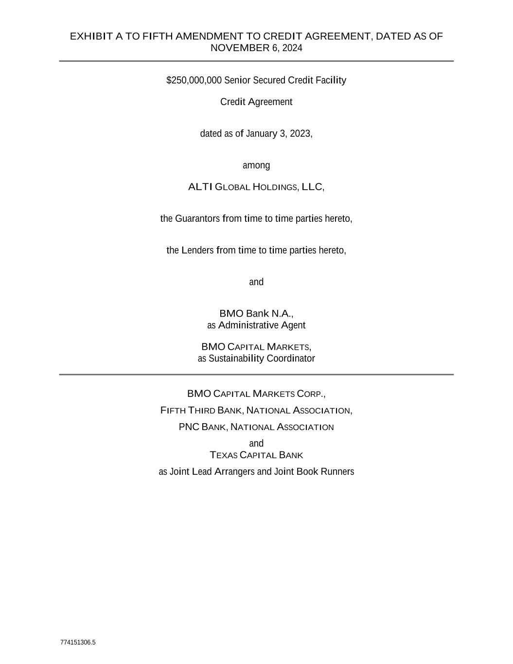 EXHIBIT A TO FIFTH AMENDMENT TO CREDIT AGREEMENT, DATED AS OF NOVEMBER 6, 2024 774151306.5 $250,000,000 Senior Secured Credit Facility Credit Agreement dated as of January 3, 2023, among ALTI GLOBAL HOLDINGS, LLC, the Guarantors from time to time parties hereto, the Lenders from time to time parties hereto, and BMO Bank N.A., as Administrative Agent BMO CAPITAL MARKETS, as Sustainability Coordinator BMO CAPITAL MARKETS CORP., FIFTH THIRD BANK, NATIONAL ASSOCIATION, PNC BANK, NATIONAL ASSOCIATION and TEXAS CAPITAL BANK as Joint Lead Arrangers and Joint Book Runners