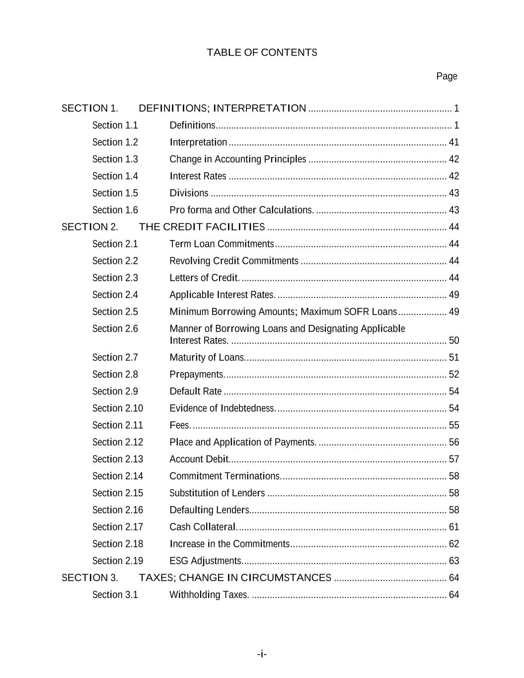 TABLE OF CONTENTS Page -i- SECTION 1. DEFINITIONS; INTERPRETATION ........................................................ 1 Section 1.1 Definitions ............................................................................................ 1 Section 1.2 Interpretation ..................................................................................... 41 Section 1.3 Change in Accounting Principles ...................................................... 42 Section 1.4 Interest Rates ..................................................................................... 42 Section 1.5 Divisions ............................................................................................ 43 Section 1.6 Pro forma and Other Calculations. ................................................... 43 SECTION 2. THE CREDIT FACILITIES ...................................................................... 44 Section 2.1 Term Loan Commitments ................................................................... 44 Section 2.2 Revolving Credit Commitments ......................................................... 44 Section 2.3 Letters of Credit. ................................................................................ 44 Section 2.4 Applicable Interest Rates. .................................................................. 49 Section 2.5 Minimum Borrowing Amounts; Maximum SOFR Loans ................... 49 Section 2.6 Manner of Borrowing Loans and Designating Applicable Interest Rates. .................................................................................... 50 Section 2.7 Maturity of Loans. .............................................................................. 51 Section 2.8 Prepayments. ...................................................................................... 52 Section 2.9 Default Rate ....................................................................................... 54 Section 2.10 Evidence of Indebtedness. .................................................................. 54 Section 2.11 Fees. ................................................................................................... 55 Section 2.12 Place and Application of Payments. .................................................. 56 Section 2.13 Account Debit..................................................................................... 57 Section 2.14 Commitment Terminations. ................................................................ 58 Section 2.15 Substitution of Lenders ...................................................................... 58 Section 2.16 Defaulting Lenders............................................................................. 58 Section 2.17 Cash Collateral. ................................................................................. 61 Section 2.18 Increase in the Commitments ............................................................. 62 Section 2.19 ESG Adjustments. ............................................................................... 63 SECTION 3. TAXES; CHANGE IN CIRCUMSTANCES ............................................ 64 Section 3.1 Withholding Taxes. ............................................................................ 64