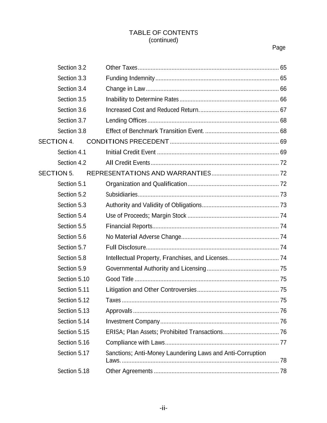 TABLE OF CONTENTS (continued) Page -ii- Section 3.2 Other Taxes ........................................................................................ 65 Section 3.3 Funding Indemnity ............................................................................. 65 Section 3.4 Change in Law ................................................................................... 66 Section 3.5 Inability to Determine Rates .............................................................. 66 Section 3.6 Increased Cost and Reduced Return. ................................................. 67 Section 3.7 Lending Offices .................................................................................. 68 Section 3.8 Effect of Benchmark Transition Event. .............................................. 68 SECTION 4. CONDITIONS PRECEDENT .................................................................... 69 Section 4.1 Initial Credit Event ............................................................................ 69 Section 4.2 All Credit Events ................................................................................ 72 SECTION 5. REPRESENTATIONS AND WARRANTIES .......................................... 72 Section 5.1 Organization and Qualification ......................................................... 72 Section 5.2 Subsidiaries ........................................................................................ 73 Section 5.3 Authority and Validity of Obligations ................................................ 73 Section 5.4 Use of Proceeds; Margin Stock ......................................................... 74 Section 5.5 Financial Reports............................................................................... 74 Section 5.6 No Material Adverse Change ............................................................. 74 Section 5.7 Full Disclosure................................................................................... 74 Section 5.8 Intellectual Property, Franchises, and Licenses................................ 74 Section 5.9 Governmental Authority and Licensing ............................................. 75 Section 5.10 Good Title .......................................................................................... 75 Section 5.11 Litigation and Other Controversies ................................................... 75 Section 5.12 Taxes .................................................................................................. 75 Section 5.13 Approvals ........................................................................................... 76 Section 5.14 Investment Company .......................................................................... 76 Section 5.15 ERISA; Plan Assets; Prohibited Transactions ................................... 76 Section 5.16 Compliance with Laws ....................................................................... 77 Section 5.17 Sanctions; Anti-Money Laundering Laws and Anti-Corruption Laws. .................................................................................................. 78 Section 5.18 Other Agreements .............................................................................. 78