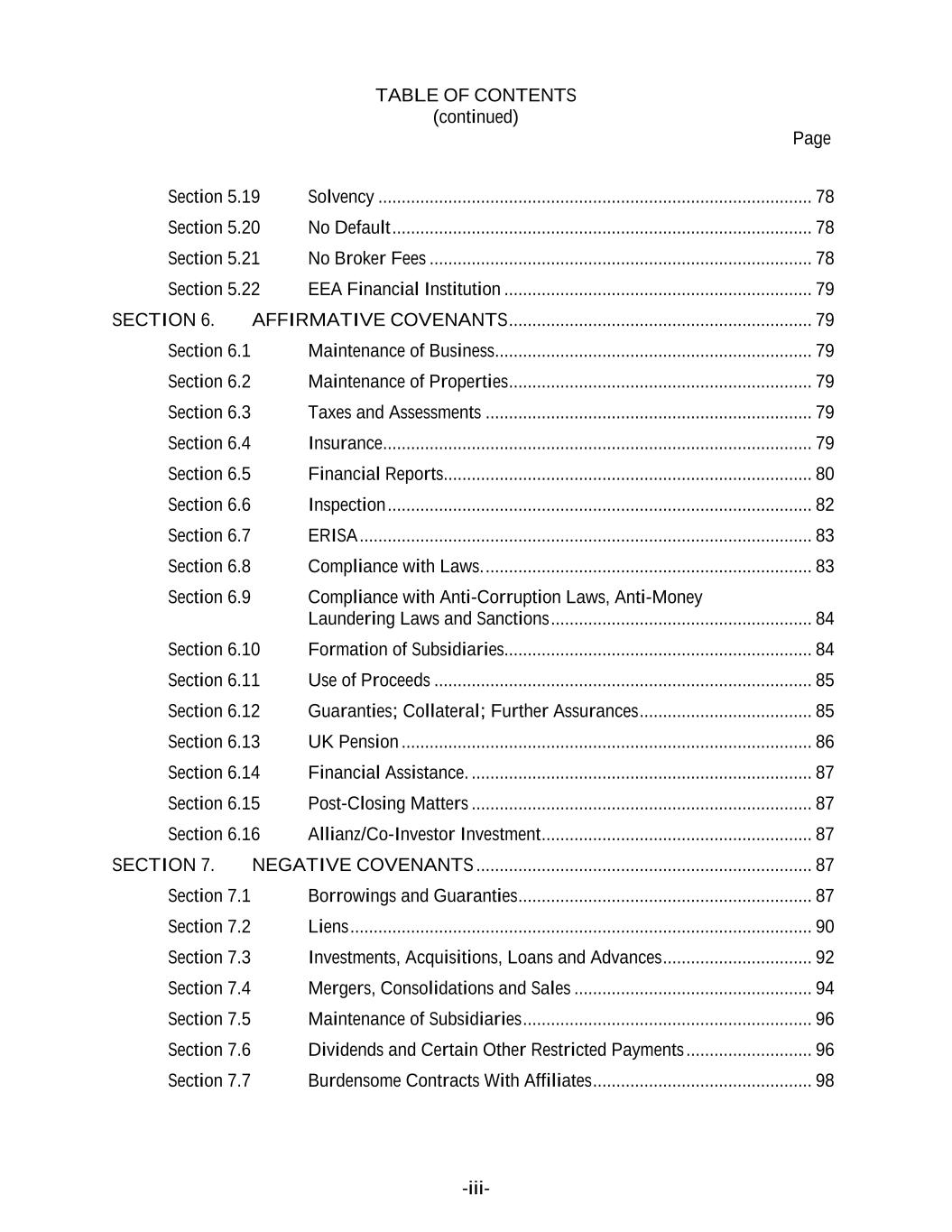 TABLE OF CONTENTS (continued) Page -iii- Section 5.19 Solvency ............................................................................................. 78 Section 5.20 No Default .......................................................................................... 78 Section 5.21 No Broker Fees .................................................................................. 78 Section 5.22 EEA Financial Institution .................................................................. 79 SECTION 6. AFFIRMATIVE COVENANTS ................................................................. 79 Section 6.1 Maintenance of Business.................................................................... 79 Section 6.2 Maintenance of Properties ................................................................. 79 Section 6.3 Taxes and Assessments ...................................................................... 79 Section 6.4 Insurance............................................................................................ 79 Section 6.5 Financial Reports............................................................................... 80 Section 6.6 Inspection ........................................................................................... 82 Section 6.7 ERISA ................................................................................................. 83 Section 6.8 Compliance with Laws. ...................................................................... 83 Section 6.9 Compliance with Anti-Corruption Laws, Anti-Money Laundering Laws and Sanctions ........................................................ 84 Section 6.10 Formation of Subsidiaries.................................................................. 84 Section 6.11 Use of Proceeds ................................................................................. 85 Section 6.12 Guaranties; Collateral; Further Assurances ..................................... 85 Section 6.13 UK Pension ........................................................................................ 86 Section 6.14 Financial Assistance. ......................................................................... 87 Section 6.15 Post-Closing Matters ......................................................................... 87 Section 6.16 Allianz/Co-Investor Investment .......................................................... 87 SECTION 7. NEGATIVE COVENANTS ........................................................................ 87 Section 7.1 Borrowings and Guaranties ............................................................... 87 Section 7.2 Liens ................................................................................................... 90 Section 7.3 Investments, Acquisitions, Loans and Advances ................................ 92 Section 7.4 Mergers, Consolidations and Sales ................................................... 94 Section 7.5 Maintenance of Subsidiaries .............................................................. 96 Section 7.6 Dividends and Certain Other Restricted Payments ........................... 96 Section 7.7 Burdensome Contracts With Affiliates ............................................... 98
