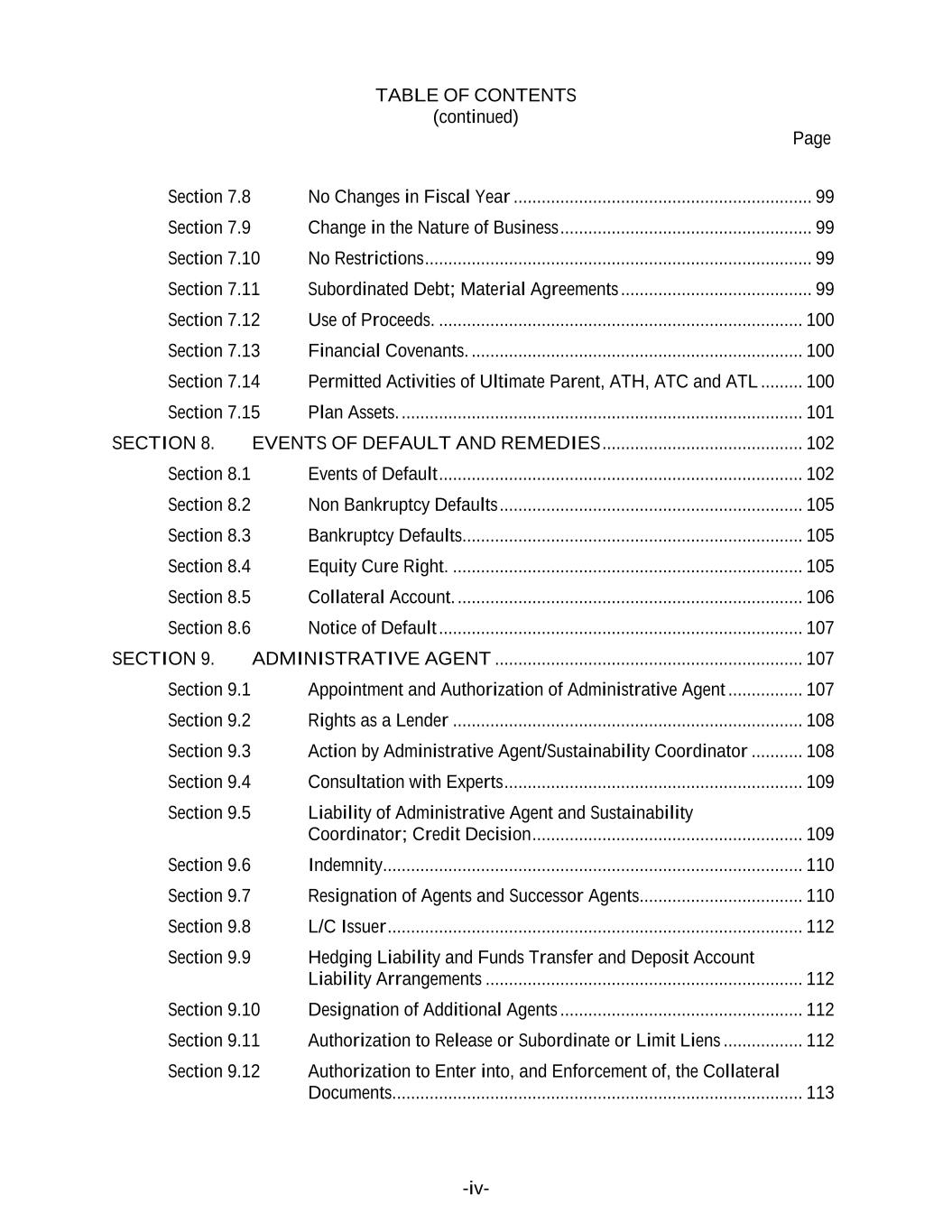 TABLE OF CONTENTS (continued) Page -iv- Section 7.8 No Changes in Fiscal Year ................................................................ 99 Section 7.9 Change in the Nature of Business ...................................................... 99 Section 7.10 No Restrictions ................................................................................... 99 Section 7.11 Subordinated Debt; Material Agreements ......................................... 99 Section 7.12 Use of Proceeds. .............................................................................. 100 Section 7.13 Financial Covenants. ....................................................................... 100 Section 7.14 Permitted Activities of Ultimate Parent, ATH, ATC and ATL ......... 100 Section 7.15 Plan Assets. ...................................................................................... 101 SECTION 8. EVENTS OF DEFAULT AND REMEDIES ........................................... 102 Section 8.1 Events of Default .............................................................................. 102 Section 8.2 Non Bankruptcy Defaults ................................................................. 105 Section 8.3 Bankruptcy Defaults......................................................................... 105 Section 8.4 Equity Cure Right. ........................................................................... 105 Section 8.5 Collateral Account. .......................................................................... 106 Section 8.6 Notice of Default .............................................................................. 107 SECTION 9. ADMINISTRATIVE AGENT .................................................................. 107 Section 9.1 Appointment and Authorization of Administrative Agent ................ 107 Section 9.2 Rights as a Lender ........................................................................... 108 Section 9.3 Action by Administrative Agent/Sustainability Coordinator ........... 108 Section 9.4 Consultation with Experts ................................................................ 109 Section 9.5 Liability of Administrative Agent and Sustainability Coordinator; Credit Decision .......................................................... 109 Section 9.6 Indemnity.......................................................................................... 110 Section 9.7 Resignation of Agents and Successor Agents................................... 110 Section 9.8 L/C Issuer ......................................................................................... 112 Section 9.9 Hedging Liability and Funds Transfer and Deposit Account Liability Arrangements .................................................................... 112 Section 9.10 Designation of Additional Agents .................................................... 112 Section 9.11 Authorization to Release or Subordinate or Limit Liens ................. 112 Section 9.12 Authorization to Enter into, and Enforcement of, the Collateral Documents........................................................................................ 113