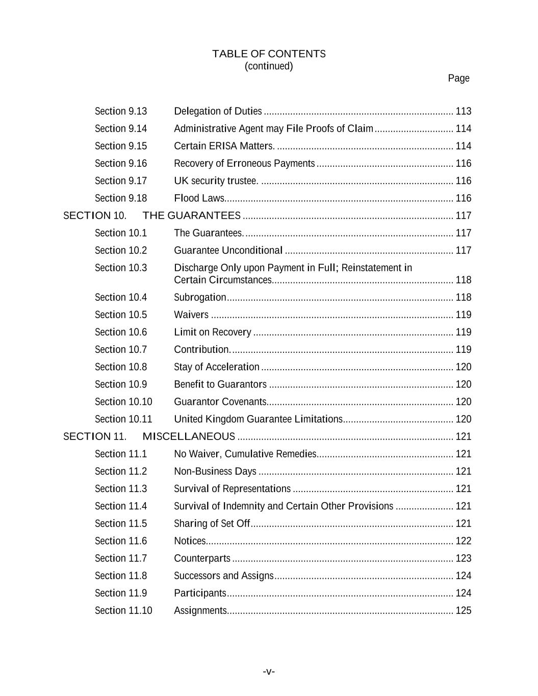 TABLE OF CONTENTS (continued) Page -v- Section 9.13 Delegation of Duties ........................................................................ 113 Section 9.14 Administrative Agent may File Proofs of Claim .............................. 114 Section 9.15 Certain ERISA Matters. ................................................................... 114 Section 9.16 Recovery of Erroneous Payments .................................................... 116 Section 9.17 UK security trustee. ......................................................................... 116 Section 9.18 Flood Laws....................................................................................... 116 SECTION 10. THE GUARANTEES ................................................................................ 117 Section 10.1 The Guarantees. ............................................................................... 117 Section 10.2 Guarantee Unconditional ................................................................ 117 Section 10.3 Discharge Only upon Payment in Full; Reinstatement in Certain Circumstances..................................................................... 118 Section 10.4 Subrogation ...................................................................................... 118 Section 10.5 Waivers ............................................................................................ 119 Section 10.6 Limit on Recovery ............................................................................ 119 Section 10.7 Contribution. .................................................................................... 119 Section 10.8 Stay of Acceleration ......................................................................... 120 Section 10.9 Benefit to Guarantors ...................................................................... 120 Section 10.10 Guarantor Covenants....................................................................... 120 Section 10.11 United Kingdom Guarantee Limitations .......................................... 120 SECTION 11. MISCELLANEOUS .................................................................................. 121 Section 11.1 No Waiver, Cumulative Remedies.................................................... 121 Section 11.2 Non-Business Days .......................................................................... 121 Section 11.3 Survival of Representations ............................................................. 121 Section 11.4 Survival of Indemnity and Certain Other Provisions ...................... 121 Section 11.5 Sharing of Set Off ............................................................................. 121 Section 11.6 Notices.............................................................................................. 122 Section 11.7 Counterparts .................................................................................... 123 Section 11.8 Successors and Assigns .................................................................... 124 Section 11.9 Participants ...................................................................................... 124 Section 11.10 Assignments...................................................................................... 125