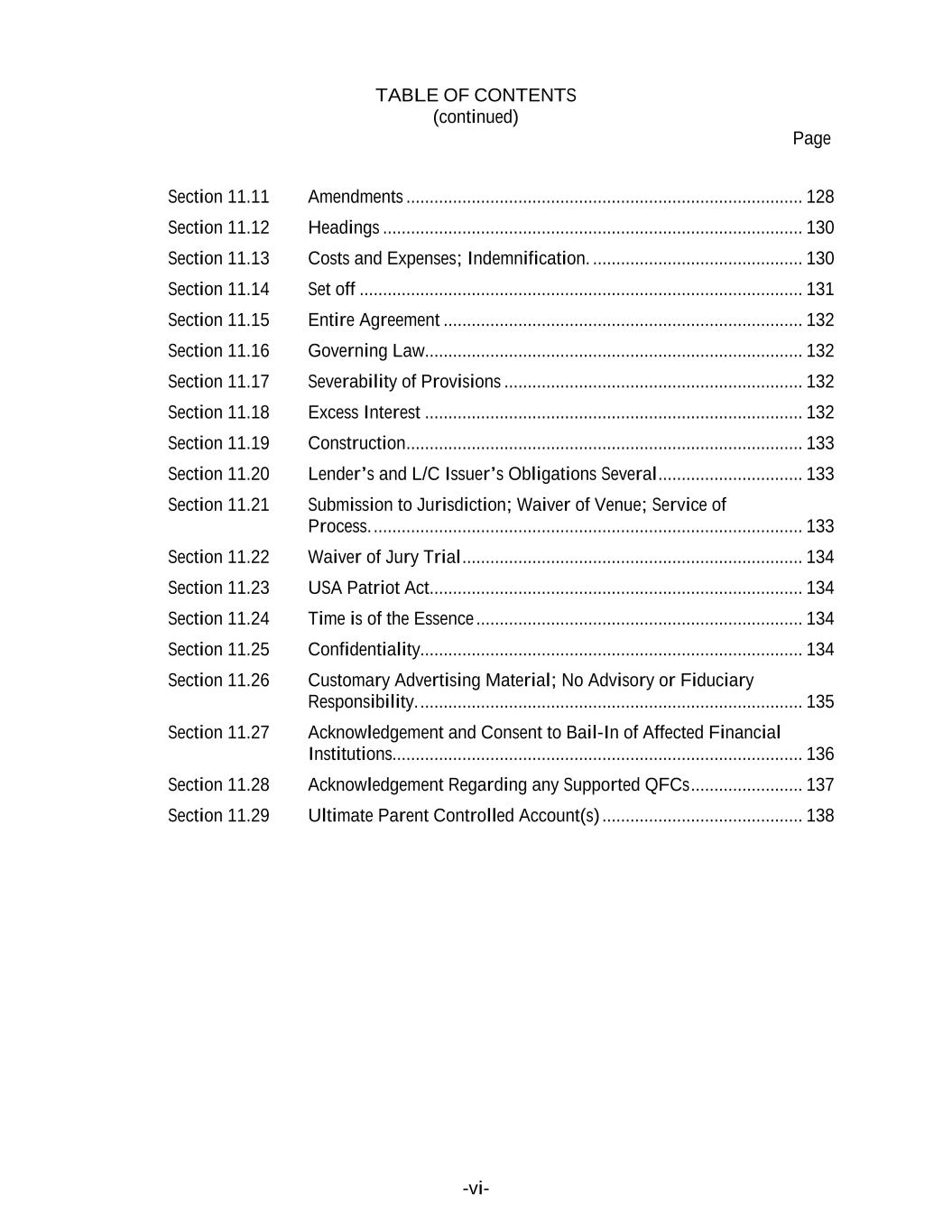 TABLE OF CONTENTS (continued) Page -vi- Section 11.11 Amendments ..................................................................................... 128 Section 11.12 Headings .......................................................................................... 130 Section 11.13 Costs and Expenses; Indemnification. ............................................. 130 Section 11.14 Set off ............................................................................................... 131 Section 11.15 Entire Agreement ............................................................................. 132 Section 11.16 Governing Law................................................................................. 132 Section 11.17 Severability of Provisions ................................................................ 132 Section 11.18 Excess Interest ................................................................................. 132 Section 11.19 Construction ..................................................................................... 133 Section 11.20 Lender’s and L/C Issuer’s Obligations Several ............................... 133 Section 11.21 Submission to Jurisdiction; Waiver of Venue; Service of Process. ............................................................................................ 133 Section 11.22 Waiver of Jury Trial ......................................................................... 134 Section 11.23 USA Patriot Act................................................................................ 134 Section 11.24 Time is of the Essence ...................................................................... 134 Section 11.25 Confidentiality.................................................................................. 134 Section 11.26 Customary Advertising Material; No Advisory or Fiduciary Responsibility. .................................................................................. 135 Section 11.27 Acknowledgement and Consent to Bail-In of Affected Financial Institutions........................................................................................ 136 Section 11.28 Acknowledgement Regarding any Supported QFCs ........................ 137 Section 11.29 Ultimate Parent Controlled Account(s) ........................................... 138