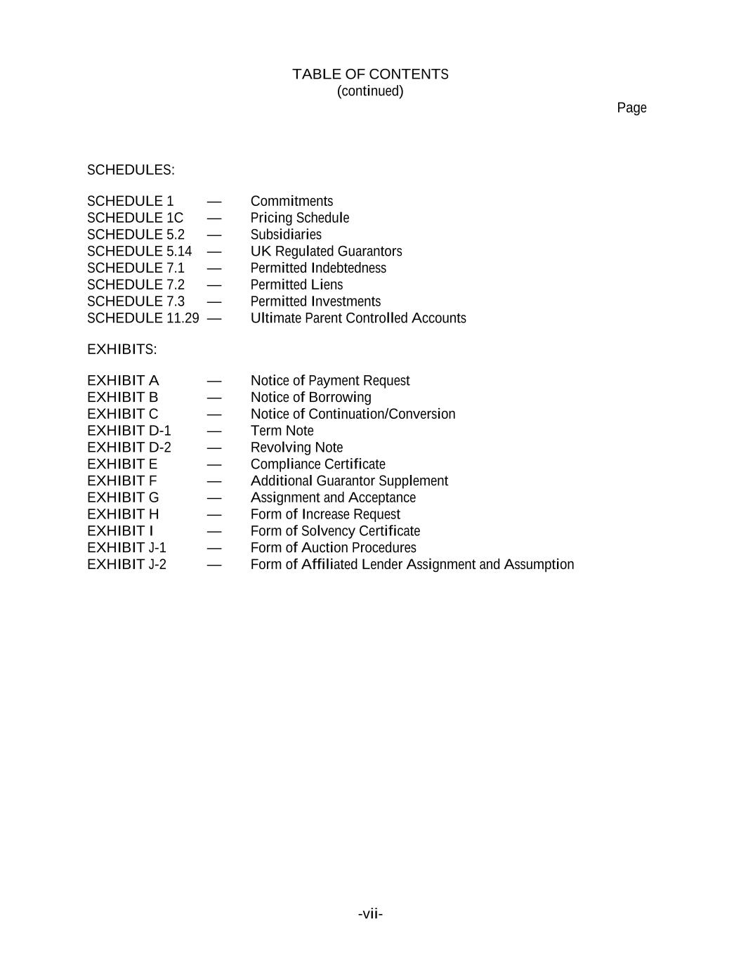 TABLE OF CONTENTS (continued) Page -vii- SCHEDULES: SCHEDULE 1 — Commitments SCHEDULE 1C — Pricing Schedule SCHEDULE 5.2 — Subsidiaries SCHEDULE 5.14 — UK Regulated Guarantors SCHEDULE 7.1 — Permitted Indebtedness SCHEDULE 7.2 — Permitted Liens SCHEDULE 7.3 — Permitted Investments SCHEDULE 11.29 — Ultimate Parent Controlled Accounts EXHIBITS: EXHIBIT A — Notice of Payment Request EXHIBIT B — Notice of Borrowing EXHIBIT C — Notice of Continuation/Conversion EXHIBIT D-1 — Term Note EXHIBIT D-2 — Revolving Note EXHIBIT E — Compliance Certificate EXHIBIT F — Additional Guarantor Supplement EXHIBIT G — Assignment and Acceptance EXHIBIT H — Form of Increase Request EXHIBIT I — Form of Solvency Certificate EXHIBIT J-1 — Form of Auction Procedures EXHIBIT J-2 — Form of Affiliated Lender Assignment and Assumption
