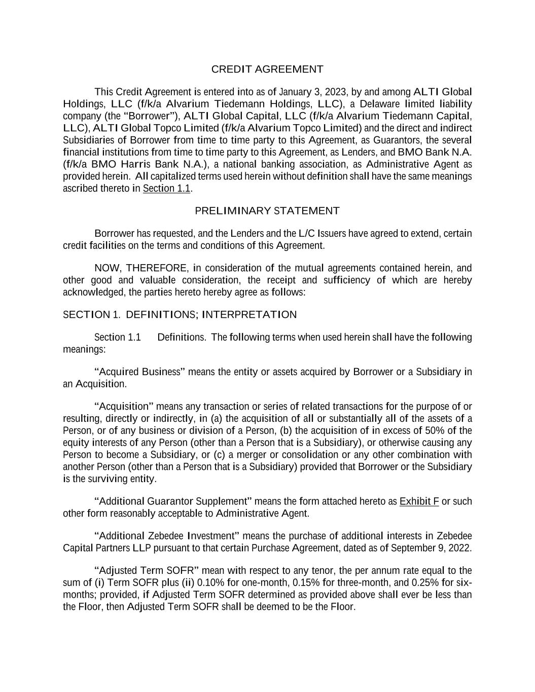 CREDIT AGREEMENT This Credit Agreement is entered into as of January 3, 2023, by and among ALTI Global Holdings, LLC (f/k/a Alvarium Tiedemann Holdings, LLC), a Delaware limited liability company (the “Borrower”), ALTI Global Capital, LLC (f/k/a Alvarium Tiedemann Capital, LLC), ALTI Global Topco Limited (f/k/a Alvarium Topco Limited) and the direct and indirect Subsidiaries of Borrower from time to time party to this Agreement, as Guarantors, the several financial institutions from time to time party to this Agreement, as Lenders, and BMO Bank N.A. (f/k/a BMO Harris Bank N.A.), a national banking association, as Administrative Agent as provided herein. All capitalized terms used herein without definition shall have the same meanings ascribed thereto in Section 1.1. PRELIMINARY STATEMENT Borrower has requested, and the Lenders and the L/C Issuers have agreed to extend, certain credit facilities on the terms and conditions of this Agreement. NOW, THEREFORE, in consideration of the mutual agreements contained herein, and other good and valuable consideration, the receipt and sufficiency of which are hereby acknowledged, the parties hereto hereby agree as follows: SECTION 1. DEFINITIONS; INTERPRETATION Section 1.1 Definitions. The following terms when used herein shall have the following meanings: “Acquired Business” means the entity or assets acquired by Borrower or a Subsidiary in an Acquisition. “Acquisition” means any transaction or series of related transactions for the purpose of or resulting, directly or indirectly, in (a) the acquisition of all or substantially all of the assets of a Person, or of any business or division of a Person, (b) the acquisition of in excess of 50% of the equity interests of any Person (other than a Person that is a Subsidiary), or otherwise causing any Person to become a Subsidiary, or (c) a merger or consolidation or any other combination with another Person (other than a Person that is a Subsidiary) provided that Borrower or the Subsidiary is the surviving entity. “Additional Guarantor Supplement” means the form attached hereto as Exhibit F or such other form reasonably acceptable to Administrative Agent. “Additional Zebedee Investment” means the purchase of additional interests in Zebedee Capital Partners LLP pursuant to that certain Purchase Agreement, dated as of September 9, 2022. “Adjusted Term SOFR” mean with respect to any tenor, the per annum rate equal to the sum of (i) Term SOFR plus (ii) 0.10% for one-month, 0.15% for three-month, and 0.25% for six- months; provided, if Adjusted Term SOFR determined as provided above shall ever be less than the Floor, then Adjusted Term SOFR shall be deemed to be the Floor.