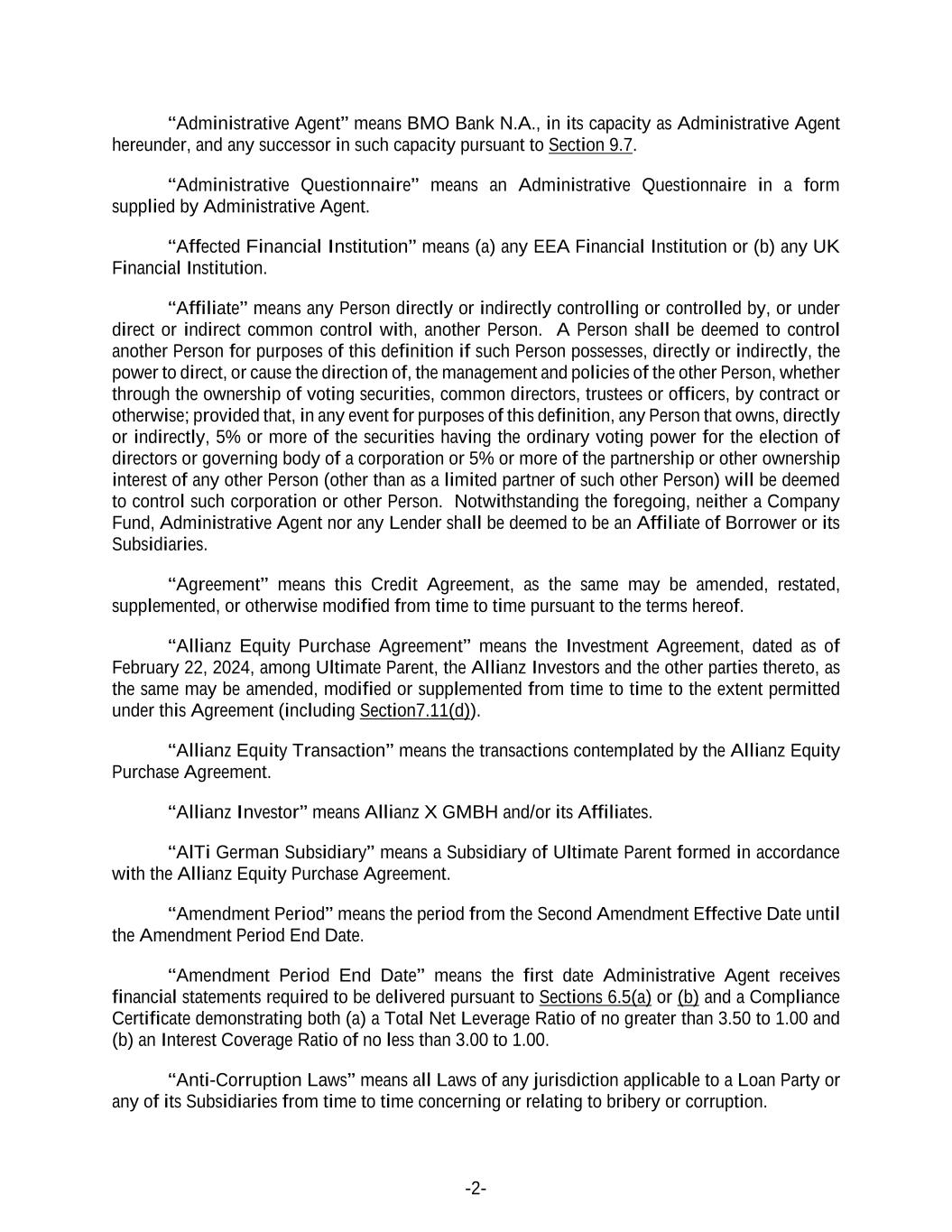 -2- “Administrative Agent” means BMO Bank N.A., in its capacity as Administrative Agent hereunder, and any successor in such capacity pursuant to Section 9.7. “Administrative Questionnaire” means an Administrative Questionnaire in a form supplied by Administrative Agent. “Affected Financial Institution” means (a) any EEA Financial Institution or (b) any UK Financial Institution. “Affiliate” means any Person directly or indirectly controlling or controlled by, or under direct or indirect common control with, another Person. A Person shall be deemed to control another Person for purposes of this definition if such Person possesses, directly or indirectly, the power to direct, or cause the direction of, the management and policies of the other Person, whether through the ownership of voting securities, common directors, trustees or officers, by contract or otherwise; provided that, in any event for purposes of this definition, any Person that owns, directly or indirectly, 5% or more of the securities having the ordinary voting power for the election of directors or governing body of a corporation or 5% or more of the partnership or other ownership interest of any other Person (other than as a limited partner of such other Person) will be deemed to control such corporation or other Person. Notwithstanding the foregoing, neither a Company Fund, Administrative Agent nor any Lender shall be deemed to be an Affiliate of Borrower or its Subsidiaries. “Agreement” means this Credit Agreement, as the same may be amended, restated, supplemented, or otherwise modified from time to time pursuant to the terms hereof. “Allianz Equity Purchase Agreement” means the Investment Agreement, dated as of February 22, 2024, among Ultimate Parent, the Allianz Investors and the other parties thereto, as the same may be amended, modified or supplemented from time to time to the extent permitted under this Agreement (including Section7.11(d)). “Allianz Equity Transaction” means the transactions contemplated by the Allianz Equity Purchase Agreement. “Allianz Investor” means Allianz X GMBH and/or its Affiliates. “AlTi German Subsidiary” means a Subsidiary of Ultimate Parent formed in accordance with the Allianz Equity Purchase Agreement. “Amendment Period” means the period from the Second Amendment Effective Date until the Amendment Period End Date. “Amendment Period End Date” means the first date Administrative Agent receives financial statements required to be delivered pursuant to Sections 6.5(a) or (b) and a Compliance Certificate demonstrating both (a) a Total Net Leverage Ratio of no greater than 3.50 to 1.00 and (b) an Interest Coverage Ratio of no less than 3.00 to 1.00. “Anti-Corruption Laws” means all Laws of any jurisdiction applicable to a Loan Party or any of its Subsidiaries from time to time concerning or relating to bribery or corruption.