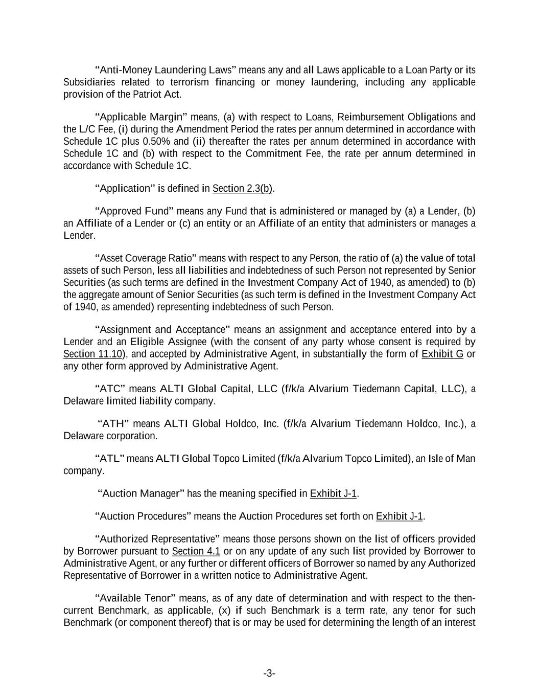 -3- “Anti-Money Laundering Laws” means any and all Laws applicable to a Loan Party or its Subsidiaries related to terrorism financing or money laundering, including any applicable provision of the Patriot Act. “Applicable Margin” means, (a) with respect to Loans, Reimbursement Obligations and the L/C Fee, (i) during the Amendment Period the rates per annum determined in accordance with Schedule 1C plus 0.50% and (ii) thereafter the rates per annum determined in accordance with Schedule 1C and (b) with respect to the Commitment Fee, the rate per annum determined in accordance with Schedule 1C. “Application” is defined in Section 2.3(b). “Approved Fund” means any Fund that is administered or managed by (a) a Lender, (b) an Affiliate of a Lender or (c) an entity or an Affiliate of an entity that administers or manages a Lender. “Asset Coverage Ratio” means with respect to any Person, the ratio of (a) the value of total assets of such Person, less all liabilities and indebtedness of such Person not represented by Senior Securities (as such terms are defined in the Investment Company Act of 1940, as amended) to (b) the aggregate amount of Senior Securities (as such term is defined in the Investment Company Act of 1940, as amended) representing indebtedness of such Person. “Assignment and Acceptance” means an assignment and acceptance entered into by a Lender and an Eligible Assignee (with the consent of any party whose consent is required by Section 11.10), and accepted by Administrative Agent, in substantially the form of Exhibit G or any other form approved by Administrative Agent. “ATC” means ALTI Global Capital, LLC (f/k/a Alvarium Tiedemann Capital, LLC), a Delaware limited liability company. “ATH” means ALTI Global Holdco, Inc. (f/k/a Alvarium Tiedemann Holdco, Inc.), a Delaware corporation. “ATL” means ALTI Global Topco Limited (f/k/a Alvarium Topco Limited), an Isle of Man company. “Auction Manager” has the meaning specified in Exhibit J-1. “Auction Procedures” means the Auction Procedures set forth on Exhibit J-1. “Authorized Representative” means those persons shown on the list of officers provided by Borrower pursuant to Section 4.1 or on any update of any such list provided by Borrower to Administrative Agent, or any further or different officers of Borrower so named by any Authorized Representative of Borrower in a written notice to Administrative Agent. “Available Tenor” means, as of any date of determination and with respect to the then- current Benchmark, as applicable, (x) if such Benchmark is a term rate, any tenor for such Benchmark (or component thereof) that is or may be used for determining the length of an interest
