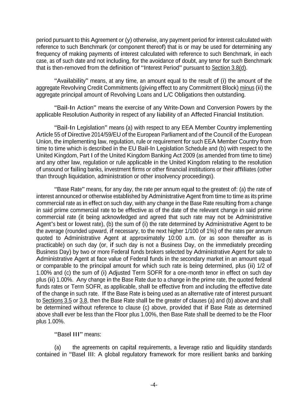 -4- period pursuant to this Agreement or (y) otherwise, any payment period for interest calculated with reference to such Benchmark (or component thereof) that is or may be used for determining any frequency of making payments of interest calculated with reference to such Benchmark, in each case, as of such date and not including, for the avoidance of doubt, any tenor for such Benchmark that is then-removed from the definition of “Interest Period” pursuant to Section 3.8(d). “Availability” means, at any time, an amount equal to the result of (i) the amount of the aggregate Revolving Credit Commitments (giving effect to any Commitment Block) minus (ii) the aggregate principal amount of Revolving Loans and L/C Obligations then outstanding. “Bail-In Action” means the exercise of any Write-Down and Conversion Powers by the applicable Resolution Authority in respect of any liability of an Affected Financial Institution. “Bail-In Legislation” means (a) with respect to any EEA Member Country implementing Article 55 of Directive 2014/59/EU of the European Parliament and of the Council of the European Union, the implementing law, regulation, rule or requirement for such EEA Member Country from time to time which is described in the EU Bail-In Legislation Schedule and (b) with respect to the United Kingdom, Part I of the United Kingdom Banking Act 2009 (as amended from time to time) and any other law, regulation or rule applicable in the United Kingdom relating to the resolution of unsound or failing banks, investment firms or other financial institutions or their affiliates (other than through liquidation, administration or other insolvency proceedings). “Base Rate” means, for any day, the rate per annum equal to the greatest of: (a) the rate of interest announced or otherwise established by Administrative Agent from time to time as its prime commercial rate as in effect on such day, with any change in the Base Rate resulting from a change in said prime commercial rate to be effective as of the date of the relevant change in said prime commercial rate (it being acknowledged and agreed that such rate may not be Administrative Agent’s best or lowest rate), (b) the sum of (i) the rate determined by Administrative Agent to be the average (rounded upward, if necessary, to the next higher 1/100 of 1%) of the rates per annum quoted to Administrative Agent at approximately 10:00 a.m. (or as soon thereafter as is practicable) on such day (or, if such day is not a Business Day, on the immediately preceding Business Day) by two or more Federal funds brokers selected by Administrative Agent for sale to Administrative Agent at face value of Federal funds in the secondary market in an amount equal or comparable to the principal amount for which such rate is being determined, plus (ii) 1/2 of 1.00% and (c) the sum of (i) Adjusted Term SOFR for a one-month tenor in effect on such day plus (ii) 1.00%. Any change in the Base Rate due to a change in the prime rate, the quoted federal funds rates or Term SOFR, as applicable, shall be effective from and including the effective date of the change in such rate. If the Base Rate is being used as an alternative rate of interest pursuant to Sections 3.5 or 3.8, then the Base Rate shall be the greater of clauses (a) and (b) above and shall be determined without reference to clause (c) above, provided that if Base Rate as determined above shall ever be less than the Floor plus 1.00%, then Base Rate shall be deemed to be the Floor plus 1.00%. “Basel III” means: (a) the agreements on capital requirements, a leverage ratio and liquidity standards contained in “Basel III: A global regulatory framework for more resilient banks and banking