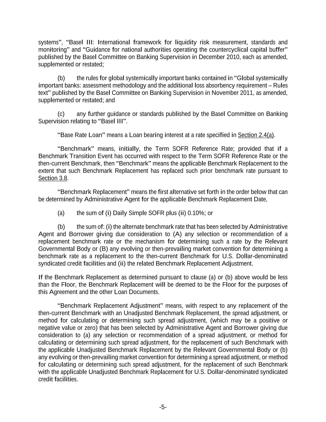-5- systems”, “Basel III: International framework for liquidity risk measurement, standards and monitoring” and “Guidance for national authorities operating the countercyclical capital buffer” published by the Basel Committee on Banking Supervision in December 2010, each as amended, supplemented or restated; (b) the rules for global systemically important banks contained in “Global systemically important banks: assessment methodology and the additional loss absorbency requirement – Rules text” published by the Basel Committee on Banking Supervision in November 2011, as amended, supplemented or restated; and (c) any further guidance or standards published by the Basel Committee on Banking Supervision relating to “Basel III”. “Base Rate Loan” means a Loan bearing interest at a rate specified in Section 2.4(a). “Benchmark” means, initially, the Term SOFR Reference Rate; provided that if a Benchmark Transition Event has occurred with respect to the Term SOFR Reference Rate or the then-current Benchmark, then “Benchmark” means the applicable Benchmark Replacement to the extent that such Benchmark Replacement has replaced such prior benchmark rate pursuant to Section 3.8. “Benchmark Replacement” means the first alternative set forth in the order below that can be determined by Administrative Agent for the applicable Benchmark Replacement Date, (a) the sum of (i) Daily Simple SOFR plus (ii) 0.10%; or (b) the sum of: (i) the alternate benchmark rate that has been selected by Administrative Agent and Borrower giving due consideration to (A) any selection or recommendation of a replacement benchmark rate or the mechanism for determining such a rate by the Relevant Governmental Body or (B) any evolving or then-prevailing market convention for determining a benchmark rate as a replacement to the then-current Benchmark for U.S. Dollar-denominated syndicated credit facilities and (ii) the related Benchmark Replacement Adjustment. If the Benchmark Replacement as determined pursuant to clause (a) or (b) above would be less than the Floor, the Benchmark Replacement will be deemed to be the Floor for the purposes of this Agreement and the other Loan Documents. “Benchmark Replacement Adjustment” means, with respect to any replacement of the then-current Benchmark with an Unadjusted Benchmark Replacement, the spread adjustment, or method for calculating or determining such spread adjustment, (which may be a positive or negative value or zero) that has been selected by Administrative Agent and Borrower giving due consideration to (a) any selection or recommendation of a spread adjustment, or method for calculating or determining such spread adjustment, for the replacement of such Benchmark with the applicable Unadjusted Benchmark Replacement by the Relevant Governmental Body or (b) any evolving or then-prevailing market convention for determining a spread adjustment, or method for calculating or determining such spread adjustment, for the replacement of such Benchmark with the applicable Unadjusted Benchmark Replacement for U.S. Dollar-denominated syndicated credit facilities.