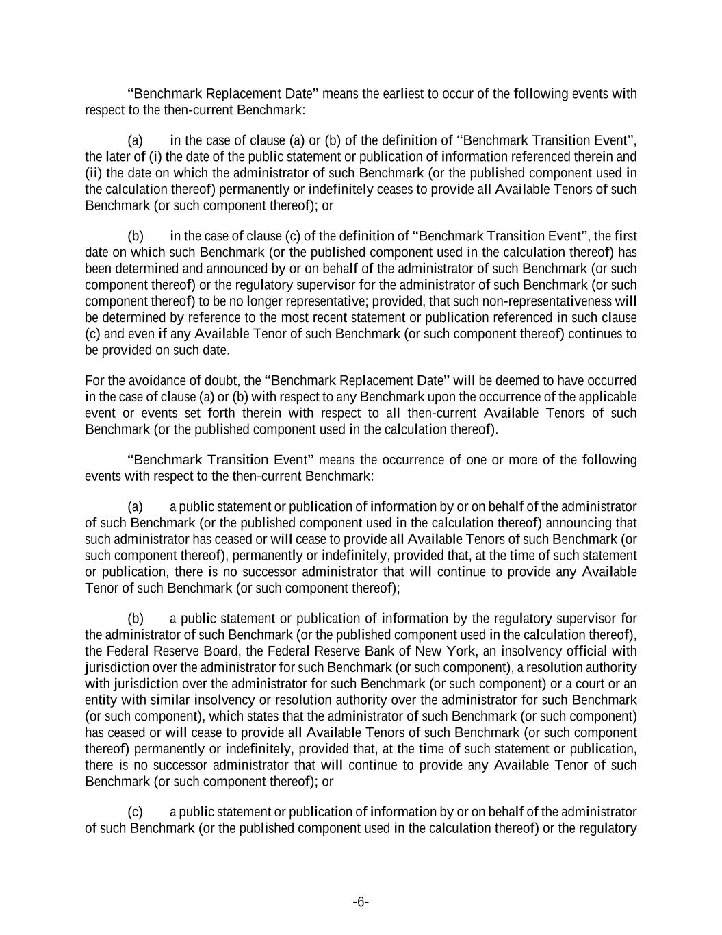 -6- “Benchmark Replacement Date” means the earliest to occur of the following events with respect to the then-current Benchmark: (a) in the case of clause (a) or (b) of the definition of “Benchmark Transition Event”, the later of (i) the date of the public statement or publication of information referenced therein and (ii) the date on which the administrator of such Benchmark (or the published component used in the calculation thereof) permanently or indefinitely ceases to provide all Available Tenors of such Benchmark (or such component thereof); or (b) in the case of clause (c) of the definition of “Benchmark Transition Event”, the first date on which such Benchmark (or the published component used in the calculation thereof) has been determined and announced by or on behalf of the administrator of such Benchmark (or such component thereof) or the regulatory supervisor for the administrator of such Benchmark (or such component thereof) to be no longer representative; provided, that such non-representativeness will be determined by reference to the most recent statement or publication referenced in such clause (c) and even if any Available Tenor of such Benchmark (or such component thereof) continues to be provided on such date. For the avoidance of doubt, the “Benchmark Replacement Date” will be deemed to have occurred in the case of clause (a) or (b) with respect to any Benchmark upon the occurrence of the applicable event or events set forth therein with respect to all then-current Available Tenors of such Benchmark (or the published component used in the calculation thereof). “Benchmark Transition Event” means the occurrence of one or more of the following events with respect to the then-current Benchmark: (a) a public statement or publication of information by or on behalf of the administrator of such Benchmark (or the published component used in the calculation thereof) announcing that such administrator has ceased or will cease to provide all Available Tenors of such Benchmark (or such component thereof), permanently or indefinitely, provided that, at the time of such statement or publication, there is no successor administrator that will continue to provide any Available Tenor of such Benchmark (or such component thereof); (b) a public statement or publication of information by the regulatory supervisor for the administrator of such Benchmark (or the published component used in the calculation thereof), the Federal Reserve Board, the Federal Reserve Bank of New York, an insolvency official with jurisdiction over the administrator for such Benchmark (or such component), a resolution authority with jurisdiction over the administrator for such Benchmark (or such component) or a court or an entity with similar insolvency or resolution authority over the administrator for such Benchmark (or such component), which states that the administrator of such Benchmark (or such component) has ceased or will cease to provide all Available Tenors of such Benchmark (or such component thereof) permanently or indefinitely, provided that, at the time of such statement or publication, there is no successor administrator that will continue to provide any Available Tenor of such Benchmark (or such component thereof); or (c) a public statement or publication of information by or on behalf of the administrator of such Benchmark (or the published component used in the calculation thereof) or the regulatory