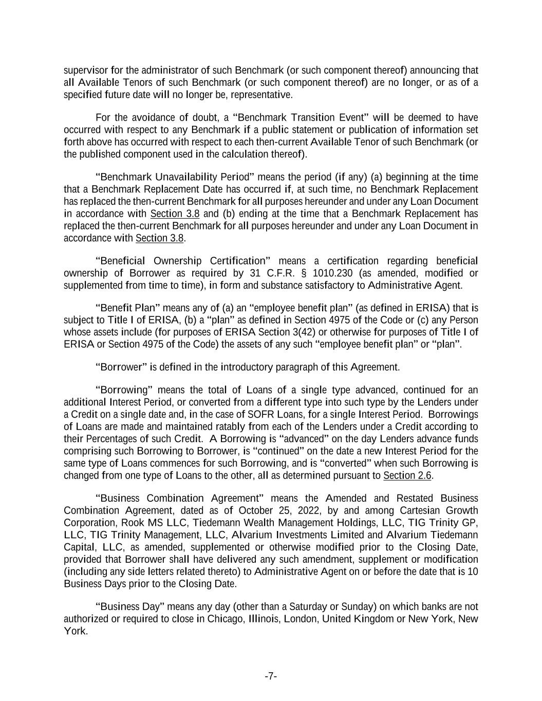 -7- supervisor for the administrator of such Benchmark (or such component thereof) announcing that all Available Tenors of such Benchmark (or such component thereof) are no longer, or as of a specified future date will no longer be, representative. For the avoidance of doubt, a “Benchmark Transition Event” will be deemed to have occurred with respect to any Benchmark if a public statement or publication of information set forth above has occurred with respect to each then-current Available Tenor of such Benchmark (or the published component used in the calculation thereof). “Benchmark Unavailability Period” means the period (if any) (a) beginning at the time that a Benchmark Replacement Date has occurred if, at such time, no Benchmark Replacement has replaced the then-current Benchmark for all purposes hereunder and under any Loan Document in accordance with Section 3.8 and (b) ending at the time that a Benchmark Replacement has replaced the then-current Benchmark for all purposes hereunder and under any Loan Document in accordance with Section 3.8. “Beneficial Ownership Certification” means a certification regarding beneficial ownership of Borrower as required by 31 C.F.R. § 1010.230 (as amended, modified or supplemented from time to time), in form and substance satisfactory to Administrative Agent. “Benefit Plan” means any of (a) an “employee benefit plan” (as defined in ERISA) that is subject to Title I of ERISA, (b) a “plan” as defined in Section 4975 of the Code or (c) any Person whose assets include (for purposes of ERISA Section 3(42) or otherwise for purposes of Title I of ERISA or Section 4975 of the Code) the assets of any such “employee benefit plan” or “plan”. “Borrower” is defined in the introductory paragraph of this Agreement. “Borrowing” means the total of Loans of a single type advanced, continued for an additional Interest Period, or converted from a different type into such type by the Lenders under a Credit on a single date and, in the case of SOFR Loans, for a single Interest Period. Borrowings of Loans are made and maintained ratably from each of the Lenders under a Credit according to their Percentages of such Credit. A Borrowing is “advanced” on the day Lenders advance funds comprising such Borrowing to Borrower, is “continued” on the date a new Interest Period for the same type of Loans commences for such Borrowing, and is “converted” when such Borrowing is changed from one type of Loans to the other, all as determined pursuant to Section 2.6. “Business Combination Agreement” means the Amended and Restated Business Combination Agreement, dated as of October 25, 2022, by and among Cartesian Growth Corporation, Rook MS LLC, Tiedemann Wealth Management Holdings, LLC, TIG Trinity GP, LLC, TIG Trinity Management, LLC, Alvarium Investments Limited and Alvarium Tiedemann Capital, LLC, as amended, supplemented or otherwise modified prior to the Closing Date, provided that Borrower shall have delivered any such amendment, supplement or modification (including any side letters related thereto) to Administrative Agent on or before the date that is 10 Business Days prior to the Closing Date. “Business Day” means any day (other than a Saturday or Sunday) on which banks are not authorized or required to close in Chicago, Illinois, London, United Kingdom or New York, New York.