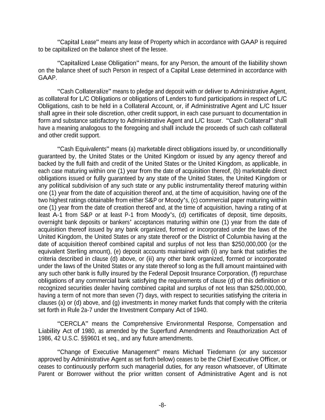 -8- “Capital Lease” means any lease of Property which in accordance with GAAP is required to be capitalized on the balance sheet of the lessee. “Capitalized Lease Obligation” means, for any Person, the amount of the liability shown on the balance sheet of such Person in respect of a Capital Lease determined in accordance with GAAP. “Cash Collateralize” means to pledge and deposit with or deliver to Administrative Agent, as collateral for L/C Obligations or obligations of Lenders to fund participations in respect of L/C Obligations, cash to be held in a Collateral Account, or, if Administrative Agent and L/C Issuer shall agree in their sole discretion, other credit support, in each case pursuant to documentation in form and substance satisfactory to Administrative Agent and L/C Issuer. “Cash Collateral” shall have a meaning analogous to the foregoing and shall include the proceeds of such cash collateral and other credit support. “Cash Equivalents” means (a) marketable direct obligations issued by, or unconditionally guaranteed by, the United States or the United Kingdom or issued by any agency thereof and backed by the full faith and credit of the United States or the United Kingdom, as applicable, in each case maturing within one (1) year from the date of acquisition thereof, (b) marketable direct obligations issued or fully guaranteed by any state of the United States, the United Kingdom or any political subdivision of any such state or any public instrumentality thereof maturing within one (1) year from the date of acquisition thereof and, at the time of acquisition, having one of the two highest ratings obtainable from either S&P or Moody’s, (c) commercial paper maturing within one (1) year from the date of creation thereof and, at the time of acquisition, having a rating of at least A-1 from S&P or at least P-1 from Moody’s, (d) certificates of deposit, time deposits, overnight bank deposits or bankers’ acceptances maturing within one (1) year from the date of acquisition thereof issued by any bank organized, formed or incorporated under the laws of the United Kingdom, the United States or any state thereof or the District of Columbia having at the date of acquisition thereof combined capital and surplus of not less than $250,000,000 (or the equivalent Sterling amount), (e) deposit accounts maintained with (i) any bank that satisfies the criteria described in clause (d) above, or (ii) any other bank organized, formed or incorporated under the laws of the United States or any state thereof so long as the full amount maintained with any such other bank is fully insured by the Federal Deposit Insurance Corporation, (f) repurchase obligations of any commercial bank satisfying the requirements of clause (d) of this definition or recognized securities dealer having combined capital and surplus of not less than $250,000,000, having a term of not more than seven (7) days, with respect to securities satisfying the criteria in clauses (a) or (d) above, and (g) investments in money market funds that comply with the criteria set forth in Rule 2a-7 under the Investment Company Act of 1940. “CERCLA” means the Comprehensive Environmental Response, Compensation and Liability Act of 1980, as amended by the Superfund Amendments and Reauthorization Act of 1986, 42 U.S.C. §§9601 et seq., and any future amendments. “Change of Executive Management” means Michael Tiedemann (or any successor approved by Administrative Agent as set forth below) ceases to be the Chief Executive Officer, or ceases to continuously perform such managerial duties, for any reason whatsoever, of Ultimate Parent or Borrower without the prior written consent of Administrative Agent and is not