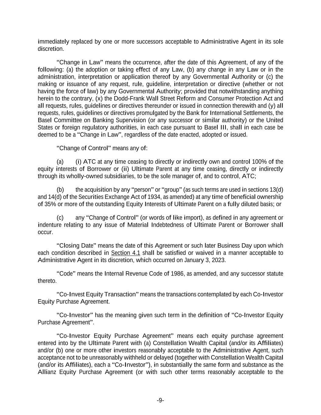-9- immediately replaced by one or more successors acceptable to Administrative Agent in its sole discretion. “Change in Law” means the occurrence, after the date of this Agreement, of any of the following: (a) the adoption or taking effect of any Law, (b) any change in any Law or in the administration, interpretation or application thereof by any Governmental Authority or (c) the making or issuance of any request, rule, guideline, interpretation or directive (whether or not having the force of law) by any Governmental Authority; provided that notwithstanding anything herein to the contrary, (x) the Dodd-Frank Wall Street Reform and Consumer Protection Act and all requests, rules, guidelines or directives thereunder or issued in connection therewith and (y) all requests, rules, guidelines or directives promulgated by the Bank for International Settlements, the Basel Committee on Banking Supervision (or any successor or similar authority) or the United States or foreign regulatory authorities, in each case pursuant to Basel III, shall in each case be deemed to be a “Change in Law”, regardless of the date enacted, adopted or issued. “Change of Control” means any of: (a) (i) ATC at any time ceasing to directly or indirectly own and control 100% of the equity interests of Borrower or (ii) Ultimate Parent at any time ceasing, directly or indirectly through its wholly-owned subsidiaries, to be the sole manager of, and to control, ATC; (b) the acquisition by any “person” or “group” (as such terms are used in sections 13(d) and 14(d) of the Securities Exchange Act of 1934, as amended) at any time of beneficial ownership of 35% or more of the outstanding Equity Interests of Ultimate Parent on a fully diluted basis; or (c) any “Change of Control” (or words of like import), as defined in any agreement or indenture relating to any issue of Material Indebtedness of Ultimate Parent or Borrower shall occur. “Closing Date” means the date of this Agreement or such later Business Day upon which each condition described in Section 4.1 shall be satisfied or waived in a manner acceptable to Administrative Agent in its discretion, which occurred on January 3, 2023. “Code” means the Internal Revenue Code of 1986, as amended, and any successor statute thereto. “Co-Invest Equity Transaction” means the transactions contemplated by each Co-Investor Equity Purchase Agreement. “Co-Investor” has the meaning given such term in the definition of “Co-Investor Equity Purchase Agreement”. “Co-Investor Equity Purchase Agreement” means each equity purchase agreement entered into by the Ultimate Parent with (a) Constellation Wealth Capital (and/or its Affiliates) and/or (b) one or more other investors reasonably acceptable to the Administrative Agent, such acceptance not to be unreasonably withheld or delayed (together with Constellation Wealth Capital (and/or its Affiliates), each a “Co-Investor”), in substantially the same form and substance as the Allianz Equity Purchase Agreement (or with such other terms reasonably acceptable to the
