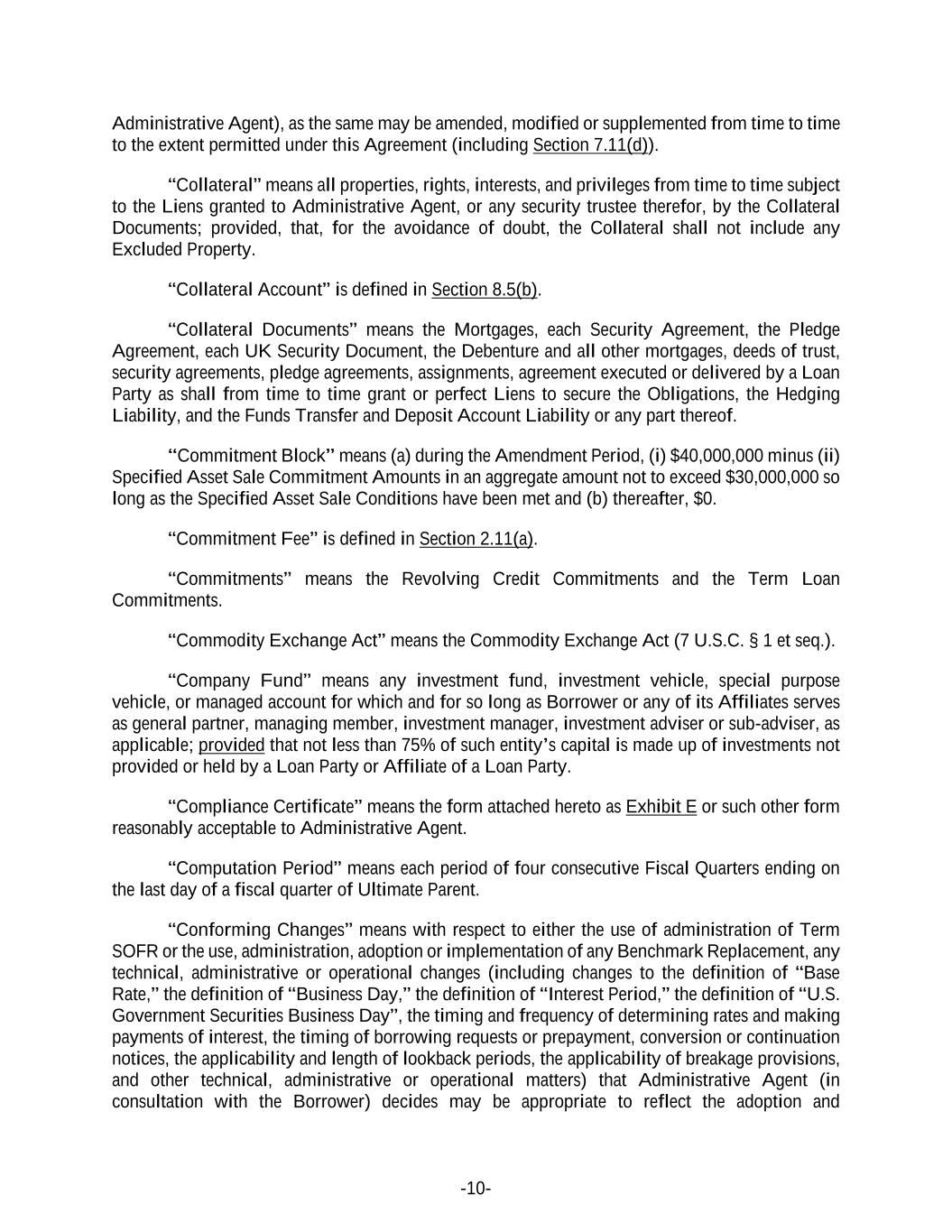 -10- Administrative Agent), as the same may be amended, modified or supplemented from time to time to the extent permitted under this Agreement (including Section 7.11(d)). “Collateral” means all properties, rights, interests, and privileges from time to time subject to the Liens granted to Administrative Agent, or any security trustee therefor, by the Collateral Documents; provided, that, for the avoidance of doubt, the Collateral shall not include any Excluded Property. “Collateral Account” is defined in Section 8.5(b). “Collateral Documents” means the Mortgages, each Security Agreement, the Pledge Agreement, each UK Security Document, the Debenture and all other mortgages, deeds of trust, security agreements, pledge agreements, assignments, agreement executed or delivered by a Loan Party as shall from time to time grant or perfect Liens to secure the Obligations, the Hedging Liability, and the Funds Transfer and Deposit Account Liability or any part thereof. “Commitment Block” means (a) during the Amendment Period, (i) $40,000,000 minus (ii) Specified Asset Sale Commitment Amounts in an aggregate amount not to exceed $30,000,000 so long as the Specified Asset Sale Conditions have been met and (b) thereafter, $0. “Commitment Fee” is defined in Section 2.11(a). “Commitments” means the Revolving Credit Commitments and the Term Loan Commitments. “Commodity Exchange Act” means the Commodity Exchange Act (7 U.S.C. § 1 et seq.). “Company Fund” means any investment fund, investment vehicle, special purpose vehicle, or managed account for which and for so long as Borrower or any of its Affiliates serves as general partner, managing member, investment manager, investment adviser or sub-adviser, as applicable; provided that not less than 75% of such entity’s capital is made up of investments not provided or held by a Loan Party or Affiliate of a Loan Party. “Compliance Certificate” means the form attached hereto as Exhibit E or such other form reasonably acceptable to Administrative Agent. “Computation Period” means each period of four consecutive Fiscal Quarters ending on the last day of a fiscal quarter of Ultimate Parent. “Conforming Changes” means with respect to either the use of administration of Term SOFR or the use, administration, adoption or implementation of any Benchmark Replacement, any technical, administrative or operational changes (including changes to the definition of “Base Rate,” the definition of “Business Day,” the definition of “Interest Period,” the definition of “U.S. Government Securities Business Day”, the timing and frequency of determining rates and making payments of interest, the timing of borrowing requests or prepayment, conversion or continuation notices, the applicability and length of lookback periods, the applicability of breakage provisions, and other technical, administrative or operational matters) that Administrative Agent (in consultation with the Borrower) decides may be appropriate to reflect the adoption and