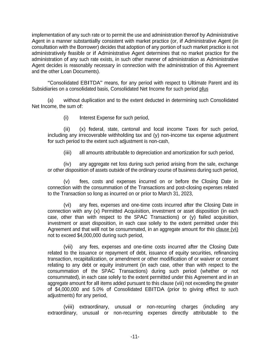 -11- implementation of any such rate or to permit the use and administration thereof by Administrative Agent in a manner substantially consistent with market practice (or, if Administrative Agent (in consultation with the Borrower) decides that adoption of any portion of such market practice is not administratively feasible or if Administrative Agent determines that no market practice for the administration of any such rate exists, in such other manner of administration as Administrative Agent decides is reasonably necessary in connection with the administration of this Agreement and the other Loan Documents). “Consolidated EBITDA” means, for any period with respect to Ultimate Parent and its Subsidiaries on a consolidated basis, Consolidated Net Income for such period plus (a) without duplication and to the extent deducted in determining such Consolidated Net Income, the sum of: (i) Interest Expense for such period, (ii) (x) federal, state, cantonal and local income Taxes for such period, including any irrecoverable withholding tax and (y) non-income tax expense adjustment for such period to the extent such adjustment is non-cash, (iii) all amounts attributable to depreciation and amortization for such period, (iv) any aggregate net loss during such period arising from the sale, exchange or other disposition of assets outside of the ordinary course of business during such period, (v) fees, costs and expenses incurred on or before the Closing Date in connection with the consummation of the Transactions and post-closing expenses related to the Transaction so long as incurred on or prior to March 31, 2023, (vi) any fees, expenses and one-time costs incurred after the Closing Date in connection with any (x) Permitted Acquisition, investment or asset disposition (in each case, other than with respect to the SPAC Transactions) or (y) failed acquisition, investment or asset disposition, in each case solely to the extent permitted under this Agreement and that will not be consummated, in an aggregate amount for this clause (vi) not to exceed $4,000,000 during such period, (vii) any fees, expenses and one-time costs incurred after the Closing Date related to the issuance or repayment of debt, issuance of equity securities, refinancing transaction, recapitalization, or amendment or other modification of or waiver or consent relating to any debt or equity instrument (in each case, other than with respect to the consummation of the SPAC Transactions) during such period (whether or not consummated), in each case solely to the extent permitted under this Agreement and in an aggregate amount for all items added pursuant to this clause (vii) not exceeding the greater of $4,000,000 and 5.0% of Consolidated EBITDA (prior to giving effect to such adjustments) for any period, (viii) extraordinary, unusual or non-recurring charges (including any extraordinary, unusual or non-recurring expenses directly attributable to the