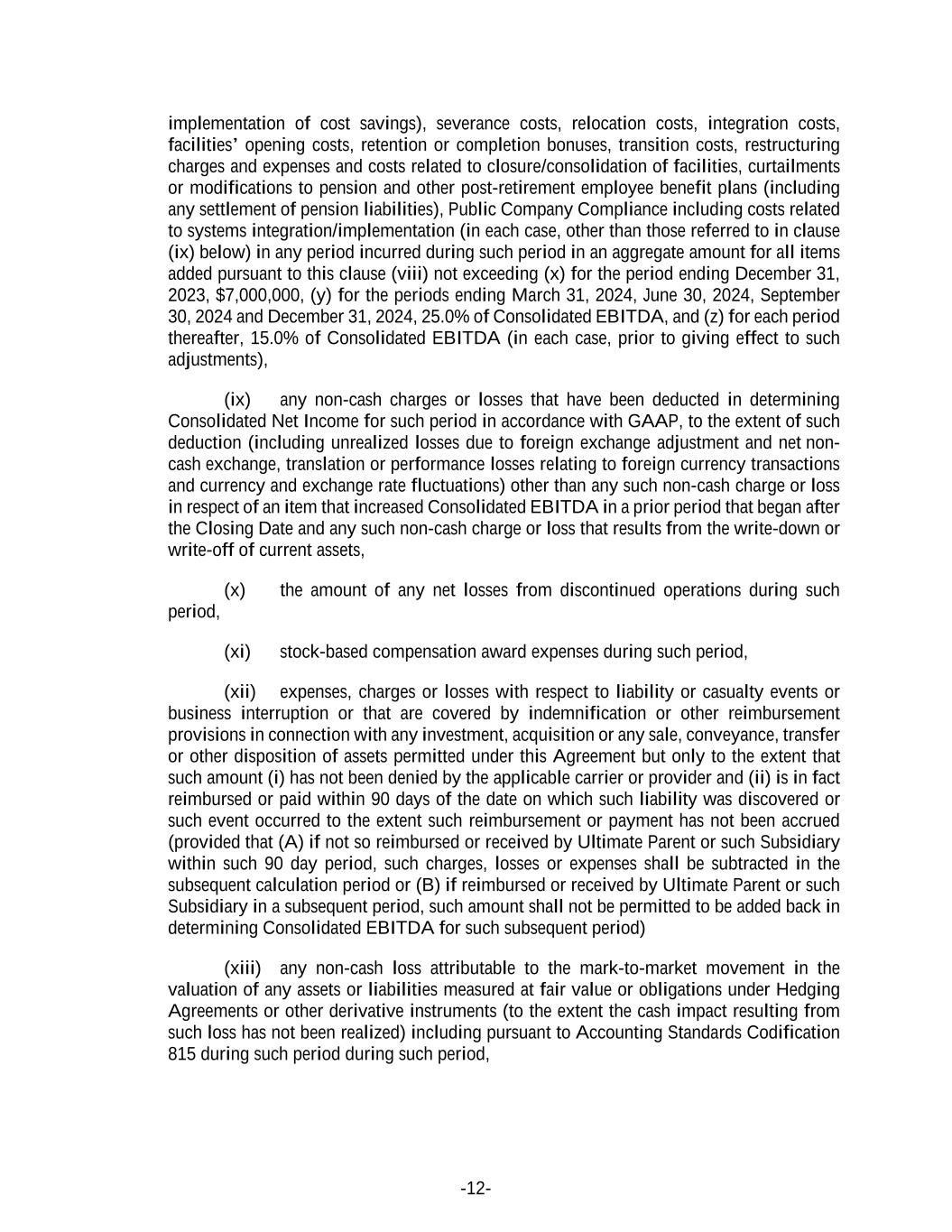 -12- implementation of cost savings), severance costs, relocation costs, integration costs, facilities’ opening costs, retention or completion bonuses, transition costs, restructuring charges and expenses and costs related to closure/consolidation of facilities, curtailments or modifications to pension and other post-retirement employee benefit plans (including any settlement of pension liabilities), Public Company Compliance including costs related to systems integration/implementation (in each case, other than those referred to in clause (ix) below) in any period incurred during such period in an aggregate amount for all items added pursuant to this clause (viii) not exceeding (x) for the period ending December 31, 2023, $7,000,000, (y) for the periods ending March 31, 2024, June 30, 2024, September 30, 2024 and December 31, 2024, 25.0% of Consolidated EBITDA, and (z) for each period thereafter, 15.0% of Consolidated EBITDA (in each case, prior to giving effect to such adjustments), (ix) any non-cash charges or losses that have been deducted in determining Consolidated Net Income for such period in accordance with GAAP, to the extent of such deduction (including unrealized losses due to foreign exchange adjustment and net non- cash exchange, translation or performance losses relating to foreign currency transactions and currency and exchange rate fluctuations) other than any such non-cash charge or loss in respect of an item that increased Consolidated EBITDA in a prior period that began after the Closing Date and any such non-cash charge or loss that results from the write-down or write-off of current assets, (x) the amount of any net losses from discontinued operations during such period, (xi) stock-based compensation award expenses during such period, (xii) expenses, charges or losses with respect to liability or casualty events or business interruption or that are covered by indemnification or other reimbursement provisions in connection with any investment, acquisition or any sale, conveyance, transfer or other disposition of assets permitted under this Agreement but only to the extent that such amount (i) has not been denied by the applicable carrier or provider and (ii) is in fact reimbursed or paid within 90 days of the date on which such liability was discovered or such event occurred to the extent such reimbursement or payment has not been accrued (provided that (A) if not so reimbursed or received by Ultimate Parent or such Subsidiary within such 90 day period, such charges, losses or expenses shall be subtracted in the subsequent calculation period or (B) if reimbursed or received by Ultimate Parent or such Subsidiary in a subsequent period, such amount shall not be permitted to be added back in determining Consolidated EBITDA for such subsequent period) (xiii) any non-cash loss attributable to the mark-to-market movement in the valuation of any assets or liabilities measured at fair value or obligations under Hedging Agreements or other derivative instruments (to the extent the cash impact resulting from such loss has not been realized) including pursuant to Accounting Standards Codification 815 during such period during such period,