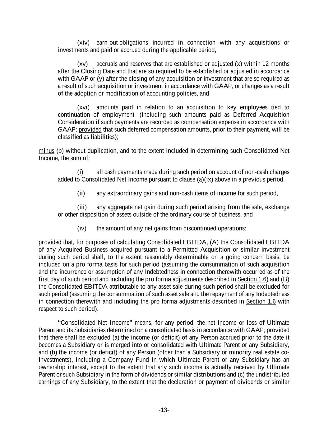 -13- (xiv) earn-out obligations incurred in connection with any acquisitions or investments and paid or accrued during the applicable period, (xv) accruals and reserves that are established or adjusted (x) within 12 months after the Closing Date and that are so required to be established or adjusted in accordance with GAAP or (y) after the closing of any acquisition or investment that are so required as a result of such acquisition or investment in accordance with GAAP, or changes as a result of the adoption or modification of accounting policies, and (xvi) amounts paid in relation to an acquisition to key employees tied to continuation of employment (including such amounts paid as Deferred Acquisition Consideration if such payments are recorded as compensation expense in accordance with GAAP; provided that such deferred compensation amounts, prior to their payment, will be classified as liabilities); minus (b) without duplication, and to the extent included in determining such Consolidated Net Income, the sum of: (i) all cash payments made during such period on account of non-cash charges added to Consolidated Net Income pursuant to clause (a)(ix) above in a previous period, (ii) any extraordinary gains and non-cash items of income for such period, (iii) any aggregate net gain during such period arising from the sale, exchange or other disposition of assets outside of the ordinary course of business, and (iv) the amount of any net gains from discontinued operations; provided that, for purposes of calculating Consolidated EBITDA, (A) the Consolidated EBITDA of any Acquired Business acquired pursuant to a Permitted Acquisition or similar investment during such period shall, to the extent reasonably determinable on a going concern basis, be included on a pro forma basis for such period (assuming the consummation of such acquisition and the incurrence or assumption of any Indebtedness in connection therewith occurred as of the first day of such period and including the pro forma adjustments described in Section 1.6) and (B) the Consolidated EBITDA attributable to any asset sale during such period shall be excluded for such period (assuming the consummation of such asset sale and the repayment of any Indebtedness in connection therewith and including the pro forma adjustments described in Section 1.6 with respect to such period). “Consolidated Net Income” means, for any period, the net income or loss of Ultimate Parent and its Subsidiaries determined on a consolidated basis in accordance with GAAP; provided that there shall be excluded (a) the income (or deficit) of any Person accrued prior to the date it becomes a Subsidiary or is merged into or consolidated with Ultimate Parent or any Subsidiary, and (b) the income (or deficit) of any Person (other than a Subsidiary or minority real estate co- investments), including a Company Fund in which Ultimate Parent or any Subsidiary has an ownership interest, except to the extent that any such income is actually received by Ultimate Parent or such Subsidiary in the form of dividends or similar distributions and (c) the undistributed earnings of any Subsidiary, to the extent that the declaration or payment of dividends or similar