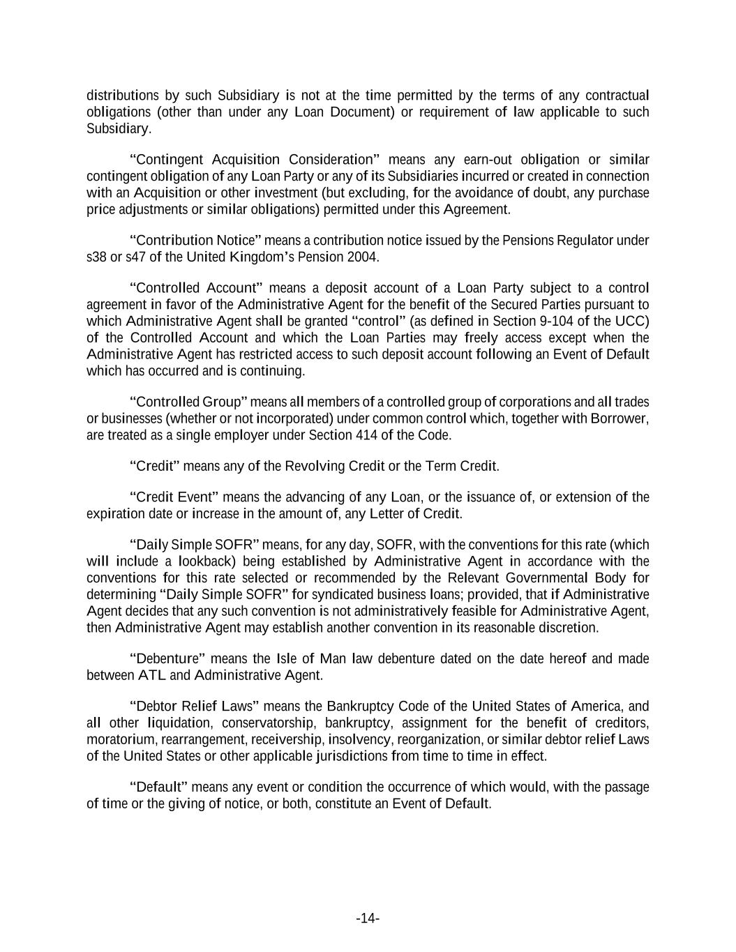 -14- distributions by such Subsidiary is not at the time permitted by the terms of any contractual obligations (other than under any Loan Document) or requirement of law applicable to such Subsidiary. “Contingent Acquisition Consideration” means any earn-out obligation or similar contingent obligation of any Loan Party or any of its Subsidiaries incurred or created in connection with an Acquisition or other investment (but excluding, for the avoidance of doubt, any purchase price adjustments or similar obligations) permitted under this Agreement. “Contribution Notice” means a contribution notice issued by the Pensions Regulator under s38 or s47 of the United Kingdom’s Pension 2004. “Controlled Account” means a deposit account of a Loan Party subject to a control agreement in favor of the Administrative Agent for the benefit of the Secured Parties pursuant to which Administrative Agent shall be granted “control” (as defined in Section 9-104 of the UCC) of the Controlled Account and which the Loan Parties may freely access except when the Administrative Agent has restricted access to such deposit account following an Event of Default which has occurred and is continuing. “Controlled Group” means all members of a controlled group of corporations and all trades or businesses (whether or not incorporated) under common control which, together with Borrower, are treated as a single employer under Section 414 of the Code. “Credit” means any of the Revolving Credit or the Term Credit. “Credit Event” means the advancing of any Loan, or the issuance of, or extension of the expiration date or increase in the amount of, any Letter of Credit. “Daily Simple SOFR” means, for any day, SOFR, with the conventions for this rate (which will include a lookback) being established by Administrative Agent in accordance with the conventions for this rate selected or recommended by the Relevant Governmental Body for determining “Daily Simple SOFR” for syndicated business loans; provided, that if Administrative Agent decides that any such convention is not administratively feasible for Administrative Agent, then Administrative Agent may establish another convention in its reasonable discretion. “Debenture” means the Isle of Man law debenture dated on the date hereof and made between ATL and Administrative Agent. “Debtor Relief Laws” means the Bankruptcy Code of the United States of America, and all other liquidation, conservatorship, bankruptcy, assignment for the benefit of creditors, moratorium, rearrangement, receivership, insolvency, reorganization, or similar debtor relief Laws of the United States or other applicable jurisdictions from time to time in effect. “Default” means any event or condition the occurrence of which would, with the passage of time or the giving of notice, or both, constitute an Event of Default.