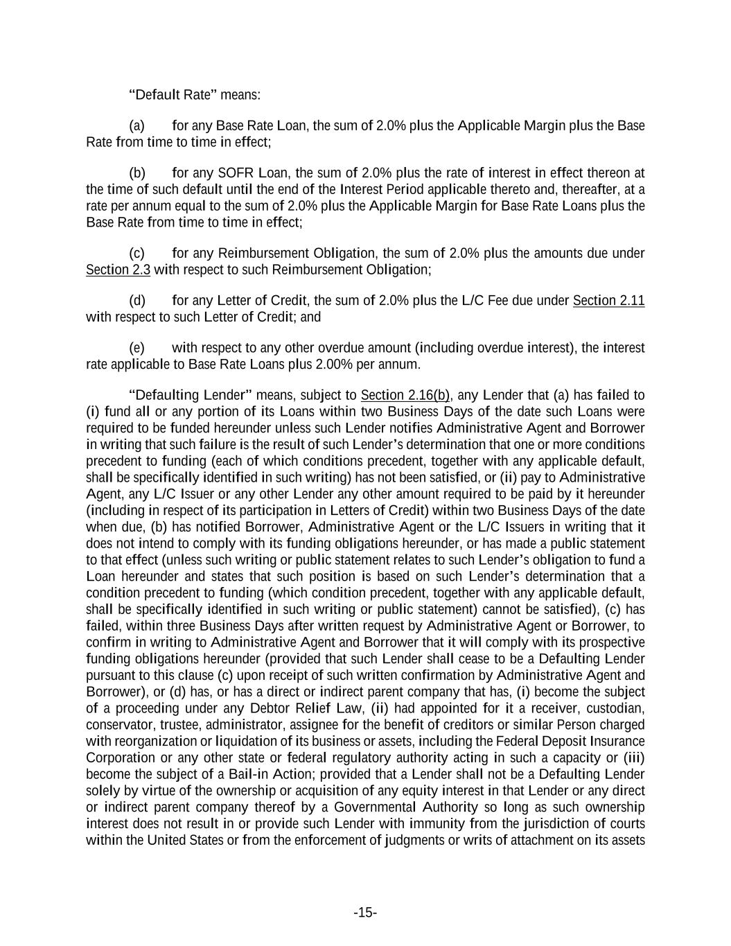 -15- “Default Rate” means: (a) for any Base Rate Loan, the sum of 2.0% plus the Applicable Margin plus the Base Rate from time to time in effect; (b) for any SOFR Loan, the sum of 2.0% plus the rate of interest in effect thereon at the time of such default until the end of the Interest Period applicable thereto and, thereafter, at a rate per annum equal to the sum of 2.0% plus the Applicable Margin for Base Rate Loans plus the Base Rate from time to time in effect; (c) for any Reimbursement Obligation, the sum of 2.0% plus the amounts due under Section 2.3 with respect to such Reimbursement Obligation; (d) for any Letter of Credit, the sum of 2.0% plus the L/C Fee due under Section 2.11 with respect to such Letter of Credit; and (e) with respect to any other overdue amount (including overdue interest), the interest rate applicable to Base Rate Loans plus 2.00% per annum. “Defaulting Lender” means, subject to Section 2.16(b), any Lender that (a) has failed to (i) fund all or any portion of its Loans within two Business Days of the date such Loans were required to be funded hereunder unless such Lender notifies Administrative Agent and Borrower in writing that such failure is the result of such Lender’s determination that one or more conditions precedent to funding (each of which conditions precedent, together with any applicable default, shall be specifically identified in such writing) has not been satisfied, or (ii) pay to Administrative Agent, any L/C Issuer or any other Lender any other amount required to be paid by it hereunder (including in respect of its participation in Letters of Credit) within two Business Days of the date when due, (b) has notified Borrower, Administrative Agent or the L/C Issuers in writing that it does not intend to comply with its funding obligations hereunder, or has made a public statement to that effect (unless such writing or public statement relates to such Lender’s obligation to fund a Loan hereunder and states that such position is based on such Lender’s determination that a condition precedent to funding (which condition precedent, together with any applicable default, shall be specifically identified in such writing or public statement) cannot be satisfied), (c) has failed, within three Business Days after written request by Administrative Agent or Borrower, to confirm in writing to Administrative Agent and Borrower that it will comply with its prospective funding obligations hereunder (provided that such Lender shall cease to be a Defaulting Lender pursuant to this clause (c) upon receipt of such written confirmation by Administrative Agent and Borrower), or (d) has, or has a direct or indirect parent company that has, (i) become the subject of a proceeding under any Debtor Relief Law, (ii) had appointed for it a receiver, custodian, conservator, trustee, administrator, assignee for the benefit of creditors or similar Person charged with reorganization or liquidation of its business or assets, including the Federal Deposit Insurance Corporation or any other state or federal regulatory authority acting in such a capacity or (iii) become the subject of a Bail-in Action; provided that a Lender shall not be a Defaulting Lender solely by virtue of the ownership or acquisition of any equity interest in that Lender or any direct or indirect parent company thereof by a Governmental Authority so long as such ownership interest does not result in or provide such Lender with immunity from the jurisdiction of courts within the United States or from the enforcement of judgments or writs of attachment on its assets