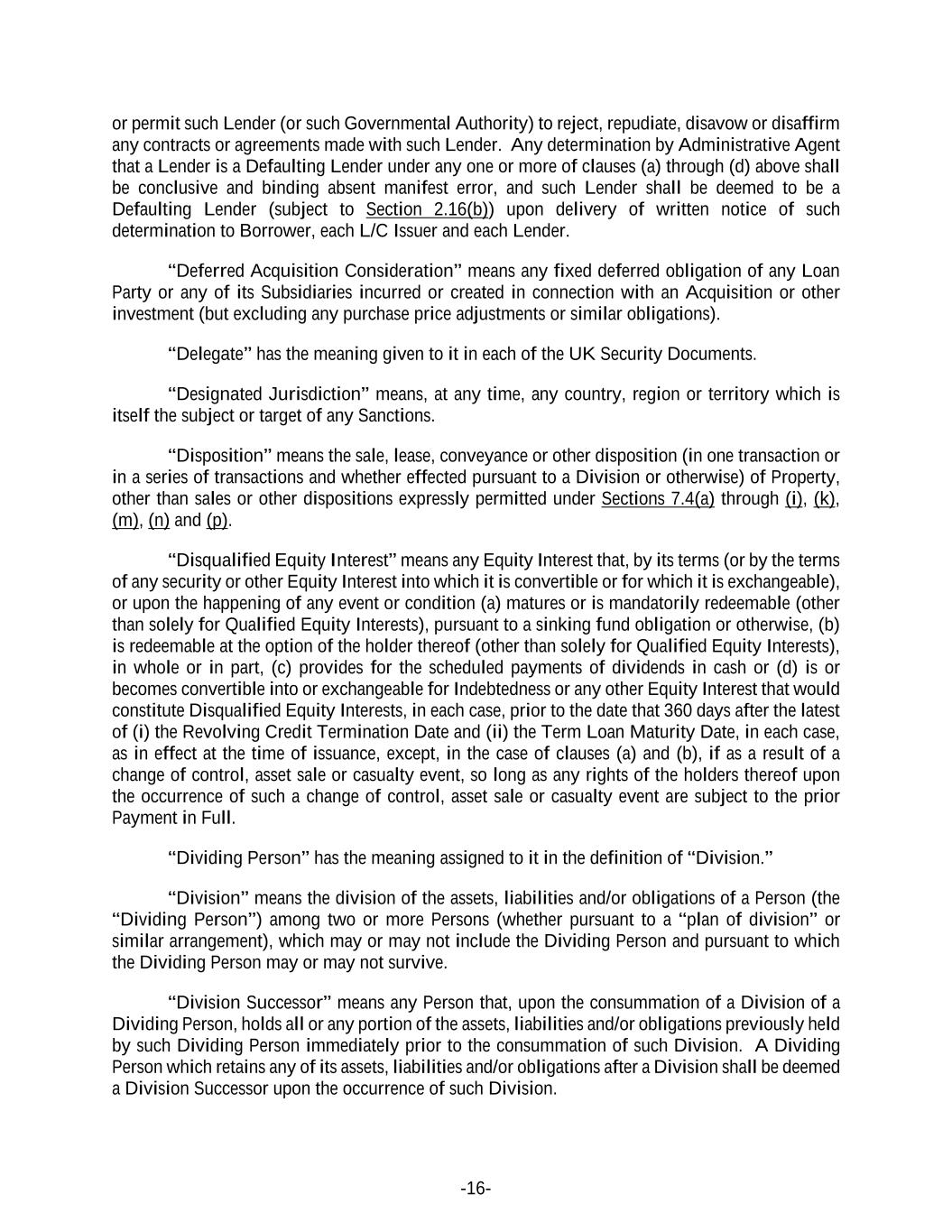 -16- or permit such Lender (or such Governmental Authority) to reject, repudiate, disavow or disaffirm any contracts or agreements made with such Lender. Any determination by Administrative Agent that a Lender is a Defaulting Lender under any one or more of clauses (a) through (d) above shall be conclusive and binding absent manifest error, and such Lender shall be deemed to be a Defaulting Lender (subject to Section 2.16(b)) upon delivery of written notice of such determination to Borrower, each L/C Issuer and each Lender. “Deferred Acquisition Consideration” means any fixed deferred obligation of any Loan Party or any of its Subsidiaries incurred or created in connection with an Acquisition or other investment (but excluding any purchase price adjustments or similar obligations). “Delegate” has the meaning given to it in each of the UK Security Documents. “Designated Jurisdiction” means, at any time, any country, region or territory which is itself the subject or target of any Sanctions. “Disposition” means the sale, lease, conveyance or other disposition (in one transaction or in a series of transactions and whether effected pursuant to a Division or otherwise) of Property, other than sales or other dispositions expressly permitted under Sections 7.4(a) through (i), (k), (m), (n) and (p). “Disqualified Equity Interest” means any Equity Interest that, by its terms (or by the terms of any security or other Equity Interest into which it is convertible or for which it is exchangeable), or upon the happening of any event or condition (a) matures or is mandatorily redeemable (other than solely for Qualified Equity Interests), pursuant to a sinking fund obligation or otherwise, (b) is redeemable at the option of the holder thereof (other than solely for Qualified Equity Interests), in whole or in part, (c) provides for the scheduled payments of dividends in cash or (d) is or becomes convertible into or exchangeable for Indebtedness or any other Equity Interest that would constitute Disqualified Equity Interests, in each case, prior to the date that 360 days after the latest of (i) the Revolving Credit Termination Date and (ii) the Term Loan Maturity Date, in each case, as in effect at the time of issuance, except, in the case of clauses (a) and (b), if as a result of a change of control, asset sale or casualty event, so long as any rights of the holders thereof upon the occurrence of such a change of control, asset sale or casualty event are subject to the prior Payment in Full. “Dividing Person” has the meaning assigned to it in the definition of “Division.” “Division” means the division of the assets, liabilities and/or obligations of a Person (the “Dividing Person”) among two or more Persons (whether pursuant to a “plan of division” or similar arrangement), which may or may not include the Dividing Person and pursuant to which the Dividing Person may or may not survive. “Division Successor” means any Person that, upon the consummation of a Division of a Dividing Person, holds all or any portion of the assets, liabilities and/or obligations previously held by such Dividing Person immediately prior to the consummation of such Division. A Dividing Person which retains any of its assets, liabilities and/or obligations after a Division shall be deemed a Division Successor upon the occurrence of such Division.