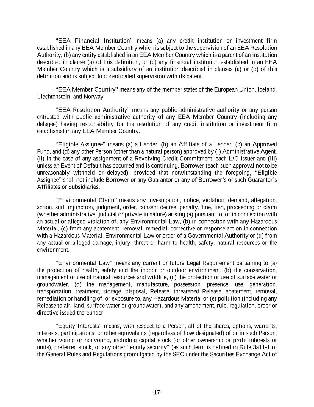 -17- “EEA Financial Institution” means (a) any credit institution or investment firm established in any EEA Member Country which is subject to the supervision of an EEA Resolution Authority, (b) any entity established in an EEA Member Country which is a parent of an institution described in clause (a) of this definition, or (c) any financial institution established in an EEA Member Country which is a subsidiary of an institution described in clauses (a) or (b) of this definition and is subject to consolidated supervision with its parent. “EEA Member Country” means any of the member states of the European Union, Iceland, Liechtenstein, and Norway. “EEA Resolution Authority” means any public administrative authority or any person entrusted with public administrative authority of any EEA Member Country (including any delegee) having responsibility for the resolution of any credit institution or investment firm established in any EEA Member Country. “Eligible Assignee” means (a) a Lender, (b) an Affiliate of a Lender, (c) an Approved Fund, and (d) any other Person (other than a natural person) approved by (i) Administrative Agent, (ii) in the case of any assignment of a Revolving Credit Commitment, each L/C Issuer and (iii) unless an Event of Default has occurred and is continuing, Borrower (each such approval not to be unreasonably withheld or delayed); provided that notwithstanding the foregoing, “Eligible Assignee” shall not include Borrower or any Guarantor or any of Borrower’s or such Guarantor’s Affiliates or Subsidiaries. “Environmental Claim” means any investigation, notice, violation, demand, allegation, action, suit, injunction, judgment, order, consent decree, penalty, fine, lien, proceeding or claim (whether administrative, judicial or private in nature) arising (a) pursuant to, or in connection with an actual or alleged violation of, any Environmental Law, (b) in connection with any Hazardous Material, (c) from any abatement, removal, remedial, corrective or response action in connection with a Hazardous Material, Environmental Law or order of a Governmental Authority or (d) from any actual or alleged damage, injury, threat or harm to health, safety, natural resources or the environment. “Environmental Law” means any current or future Legal Requirement pertaining to (a) the protection of health, safety and the indoor or outdoor environment, (b) the conservation, management or use of natural resources and wildlife, (c) the protection or use of surface water or groundwater, (d) the management, manufacture, possession, presence, use, generation, transportation, treatment, storage, disposal, Release, threatened Release, abatement, removal, remediation or handling of, or exposure to, any Hazardous Material or (e) pollution (including any Release to air, land, surface water or groundwater), and any amendment, rule, regulation, order or directive issued thereunder. “Equity Interests” means, with respect to a Person, all of the shares, options, warrants, interests, participations, or other equivalents (regardless of how designated) of or in such Person, whether voting or nonvoting, including capital stock (or other ownership or profit interests or units), preferred stock, or any other “equity security” (as such term is defined in Rule 3a11-1 of the General Rules and Regulations promulgated by the SEC under the Securities Exchange Act of