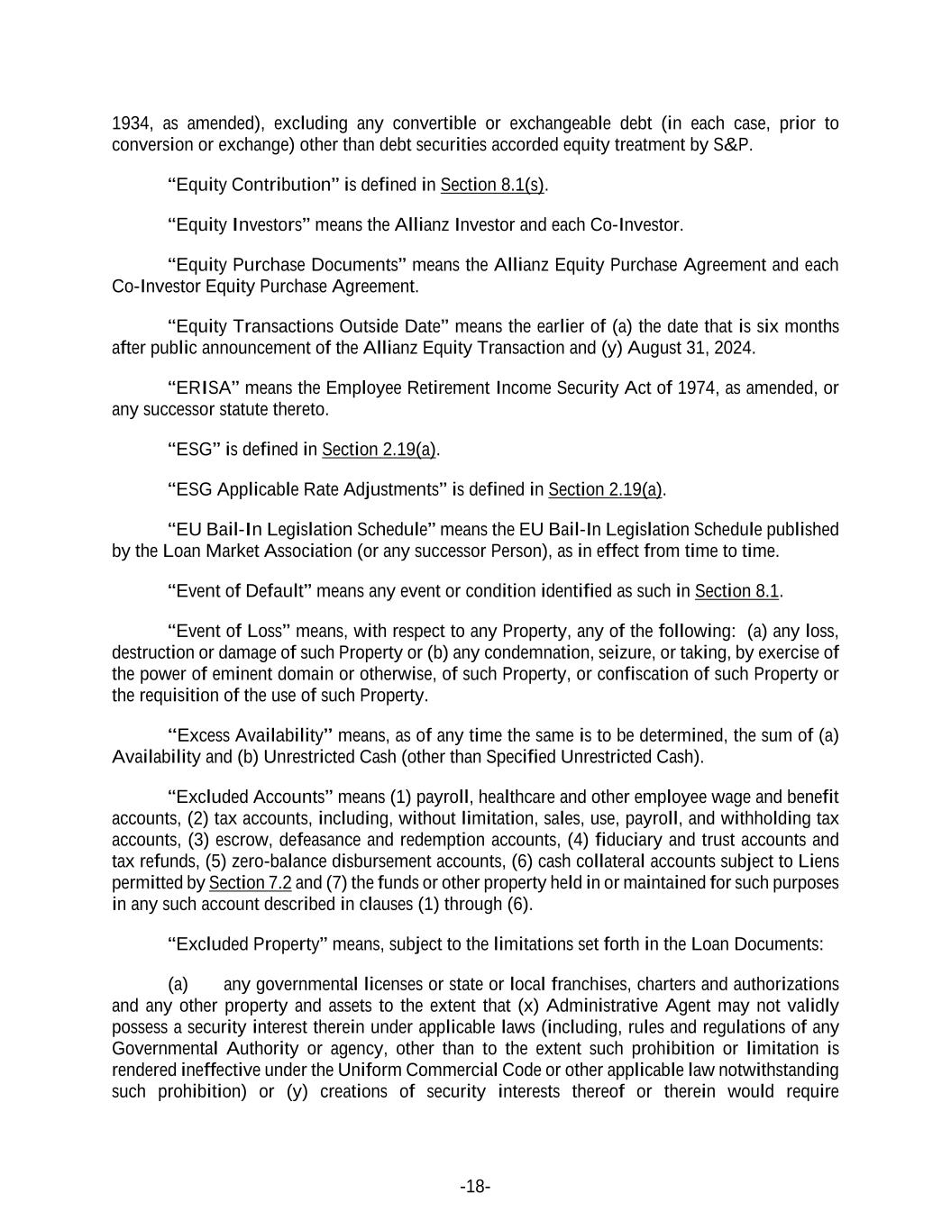 -18- 1934, as amended), excluding any convertible or exchangeable debt (in each case, prior to conversion or exchange) other than debt securities accorded equity treatment by S&P. “Equity Contribution” is defined in Section 8.1(s). “Equity Investors” means the Allianz Investor and each Co-Investor. “Equity Purchase Documents” means the Allianz Equity Purchase Agreement and each Co-Investor Equity Purchase Agreement. “Equity Transactions Outside Date” means the earlier of (a) the date that is six months after public announcement of the Allianz Equity Transaction and (y) August 31, 2024. “ERISA” means the Employee Retirement Income Security Act of 1974, as amended, or any successor statute thereto. “ESG” is defined in Section 2.19(a). “ESG Applicable Rate Adjustments” is defined in Section 2.19(a). “EU Bail-In Legislation Schedule” means the EU Bail-In Legislation Schedule published by the Loan Market Association (or any successor Person), as in effect from time to time. “Event of Default” means any event or condition identified as such in Section 8.1. “Event of Loss” means, with respect to any Property, any of the following: (a) any loss, destruction or damage of such Property or (b) any condemnation, seizure, or taking, by exercise of the power of eminent domain or otherwise, of such Property, or confiscation of such Property or the requisition of the use of such Property. “Excess Availability” means, as of any time the same is to be determined, the sum of (a) Availability and (b) Unrestricted Cash (other than Specified Unrestricted Cash). “Excluded Accounts” means (1) payroll, healthcare and other employee wage and benefit accounts, (2) tax accounts, including, without limitation, sales, use, payroll, and withholding tax accounts, (3) escrow, defeasance and redemption accounts, (4) fiduciary and trust accounts and tax refunds, (5) zero-balance disbursement accounts, (6) cash collateral accounts subject to Liens permitted by Section 7.2 and (7) the funds or other property held in or maintained for such purposes in any such account described in clauses (1) through (6). “Excluded Property” means, subject to the limitations set forth in the Loan Documents: (a) any governmental licenses or state or local franchises, charters and authorizations and any other property and assets to the extent that (x) Administrative Agent may not validly possess a security interest therein under applicable laws (including, rules and regulations of any Governmental Authority or agency, other than to the extent such prohibition or limitation is rendered ineffective under the Uniform Commercial Code or other applicable law notwithstanding such prohibition) or (y) creations of security interests thereof or therein would require