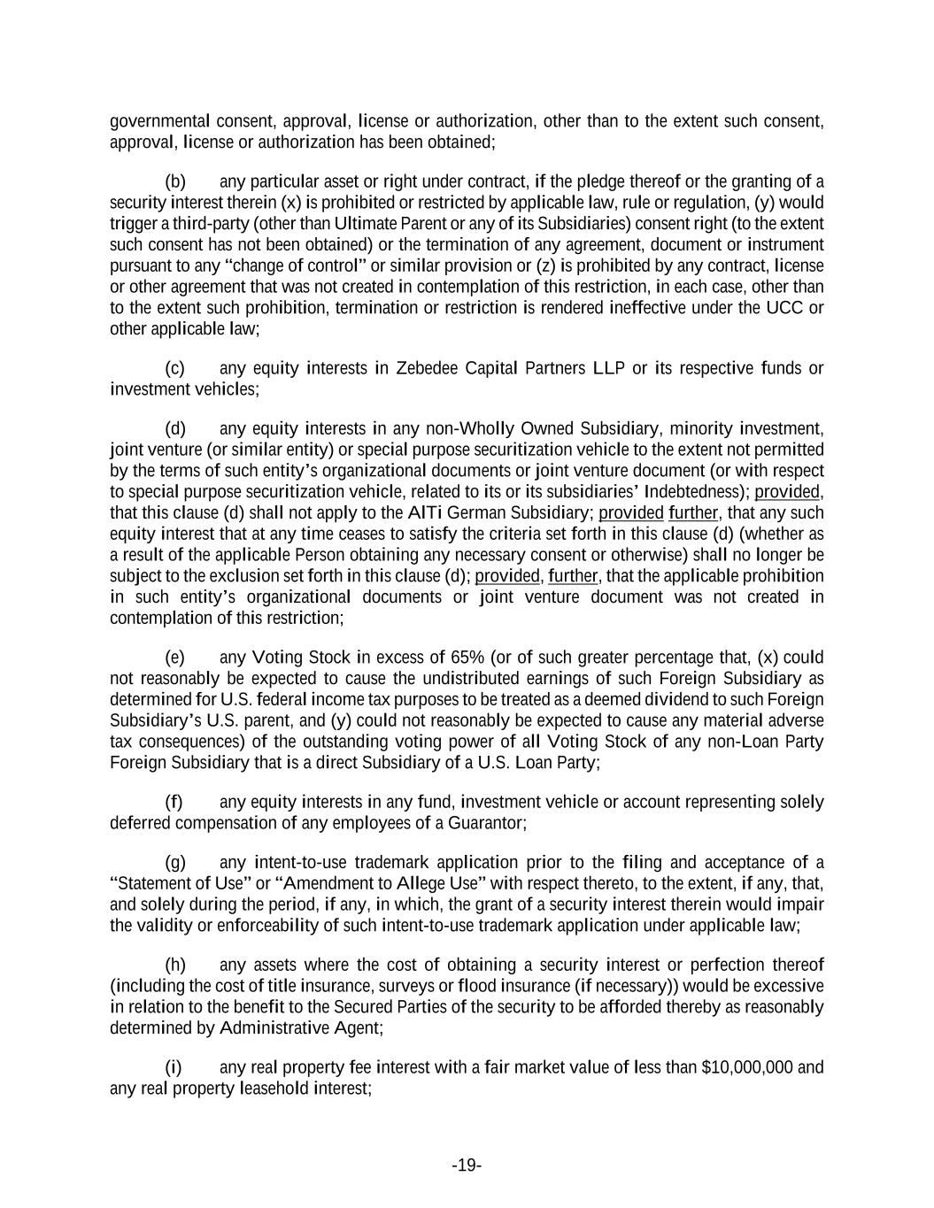 -19- governmental consent, approval, license or authorization, other than to the extent such consent, approval, license or authorization has been obtained; (b) any particular asset or right under contract, if the pledge thereof or the granting of a security interest therein (x) is prohibited or restricted by applicable law, rule or regulation, (y) would trigger a third-party (other than Ultimate Parent or any of its Subsidiaries) consent right (to the extent such consent has not been obtained) or the termination of any agreement, document or instrument pursuant to any “change of control” or similar provision or (z) is prohibited by any contract, license or other agreement that was not created in contemplation of this restriction, in each case, other than to the extent such prohibition, termination or restriction is rendered ineffective under the UCC or other applicable law; (c) any equity interests in Zebedee Capital Partners LLP or its respective funds or investment vehicles; (d) any equity interests in any non-Wholly Owned Subsidiary, minority investment, joint venture (or similar entity) or special purpose securitization vehicle to the extent not permitted by the terms of such entity’s organizational documents or joint venture document (or with respect to special purpose securitization vehicle, related to its or its subsidiaries’ Indebtedness); provided, that this clause (d) shall not apply to the AlTi German Subsidiary; provided further, that any such equity interest that at any time ceases to satisfy the criteria set forth in this clause (d) (whether as a result of the applicable Person obtaining any necessary consent or otherwise) shall no longer be subject to the exclusion set forth in this clause (d); provided, further, that the applicable prohibition in such entity’s organizational documents or joint venture document was not created in contemplation of this restriction; (e) any Voting Stock in excess of 65% (or of such greater percentage that, (x) could not reasonably be expected to cause the undistributed earnings of such Foreign Subsidiary as determined for U.S. federal income tax purposes to be treated as a deemed dividend to such Foreign Subsidiary’s U.S. parent, and (y) could not reasonably be expected to cause any material adverse tax consequences) of the outstanding voting power of all Voting Stock of any non-Loan Party Foreign Subsidiary that is a direct Subsidiary of a U.S. Loan Party; (f) any equity interests in any fund, investment vehicle or account representing solely deferred compensation of any employees of a Guarantor; (g) any intent-to-use trademark application prior to the filing and acceptance of a “Statement of Use” or “Amendment to Allege Use” with respect thereto, to the extent, if any, that, and solely during the period, if any, in which, the grant of a security interest therein would impair the validity or enforceability of such intent-to-use trademark application under applicable law; (h) any assets where the cost of obtaining a security interest or perfection thereof (including the cost of title insurance, surveys or flood insurance (if necessary)) would be excessive in relation to the benefit to the Secured Parties of the security to be afforded thereby as reasonably determined by Administrative Agent; (i) any real property fee interest with a fair market value of less than $10,000,000 and any real property leasehold interest;