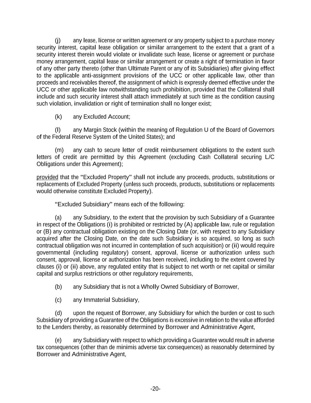 -20- (j) any lease, license or written agreement or any property subject to a purchase money security interest, capital lease obligation or similar arrangement to the extent that a grant of a security interest therein would violate or invalidate such lease, license or agreement or purchase money arrangement, capital lease or similar arrangement or create a right of termination in favor of any other party thereto (other than Ultimate Parent or any of its Subsidiaries) after giving effect to the applicable anti-assignment provisions of the UCC or other applicable law, other than proceeds and receivables thereof, the assignment of which is expressly deemed effective under the UCC or other applicable law notwithstanding such prohibition, provided that the Collateral shall include and such security interest shall attach immediately at such time as the condition causing such violation, invalidation or right of termination shall no longer exist; (k) any Excluded Account; (l) any Margin Stock (within the meaning of Regulation U of the Board of Governors of the Federal Reserve System of the United States); and (m) any cash to secure letter of credit reimbursement obligations to the extent such letters of credit are permitted by this Agreement (excluding Cash Collateral securing L/C Obligations under this Agreement); provided that the “Excluded Property” shall not include any proceeds, products, substitutions or replacements of Excluded Property (unless such proceeds, products, substitutions or replacements would otherwise constitute Excluded Property). “Excluded Subsidiary” means each of the following: (a) any Subsidiary, to the extent that the provision by such Subsidiary of a Guarantee in respect of the Obligations (i) is prohibited or restricted by (A) applicable law, rule or regulation or (B) any contractual obligation existing on the Closing Date (or, with respect to any Subsidiary acquired after the Closing Date, on the date such Subsidiary is so acquired, so long as such contractual obligation was not incurred in contemplation of such acquisition) or (ii) would require governmental (including regulatory) consent, approval, license or authorization unless such consent, approval, license or authorization has been received, including to the extent covered by clauses (i) or (ii) above, any regulated entity that is subject to net worth or net capital or similar capital and surplus restrictions or other regulatory requirements, (b) any Subsidiary that is not a Wholly Owned Subsidiary of Borrower, (c) any Immaterial Subsidiary, (d) upon the request of Borrower, any Subsidiary for which the burden or cost to such Subsidiary of providing a Guarantee of the Obligations is excessive in relation to the value afforded to the Lenders thereby, as reasonably determined by Borrower and Administrative Agent, (e) any Subsidiary with respect to which providing a Guarantee would result in adverse tax consequences (other than de minimis adverse tax consequences) as reasonably determined by Borrower and Administrative Agent,