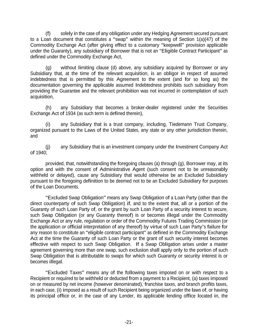 -21- (f) solely in the case of any obligation under any Hedging Agreement secured pursuant to a Loan document that constitutes a “swap” within the meaning of Section 1(a)(47) of the Commodity Exchange Act (after giving effect to a customary “keepwell” provision applicable under the Guaranty), any subsidiary of Borrower that is not an “Eligible Contract Participant” as defined under the Commodity Exchange Act, (g) without limiting clause (d) above, any subsidiary acquired by Borrower or any Subsidiary that, at the time of the relevant acquisition, is an obligor in respect of assumed indebtedness that is permitted by this Agreement to the extent (and for so long as) the documentation governing the applicable assumed Indebtedness prohibits such subsidiary from providing the Guarantee and the relevant prohibition was not incurred in contemplation of such acquisition, (h) any Subsidiary that becomes a broker-dealer registered under the Securities Exchange Act of 1934 (as such term is defined therein), (i) any Subsidiary that is a trust company, including, Tiedemann Trust Company, organized pursuant to the Laws of the United States, any state or any other jurisdiction therein, and (j) any Subsidiary that is an investment company under the Investment Company Act of 1940; provided, that, notwithstanding the foregoing clauses (a) through (g), Borrower may, at its option and with the consent of Administrative Agent (such consent not to be unreasonably withheld or delayed), cause any Subsidiary that would otherwise be an Excluded Subsidiary pursuant to the foregoing definition to be deemed not to be an Excluded Subsidiary for purposes of the Loan Documents. “Excluded Swap Obligation” means any Swap Obligation of a Loan Party (other than the direct counterparty of such Swap Obligation) if, and to the extent that, all or a portion of the Guaranty of such Loan Party of, or the grant by such Loan Party of a security interest to secure, such Swap Obligation (or any Guaranty thereof) is or becomes illegal under the Commodity Exchange Act or any rule, regulation or order of the Commodity Futures Trading Commission (or the application or official interpretation of any thereof) by virtue of such Loan Party’s failure for any reason to constitute an “eligible contract participant” as defined in the Commodity Exchange Act at the time the Guaranty of such Loan Party or the grant of such security interest becomes effective with respect to such Swap Obligation. If a Swap Obligation arises under a master agreement governing more than one swap, such exclusion shall apply only to the portion of such Swap Obligation that is attributable to swaps for which such Guaranty or security interest is or becomes illegal. “Excluded Taxes” means any of the following taxes imposed on or with respect to a Recipient or required to be withheld or deducted from a payment to a Recipient, (a) taxes imposed on or measured by net income (however denominated), franchise taxes, and branch profits taxes, in each case, (i) imposed as a result of such Recipient being organized under the laws of, or having its principal office or, in the case of any Lender, its applicable lending office located in, the