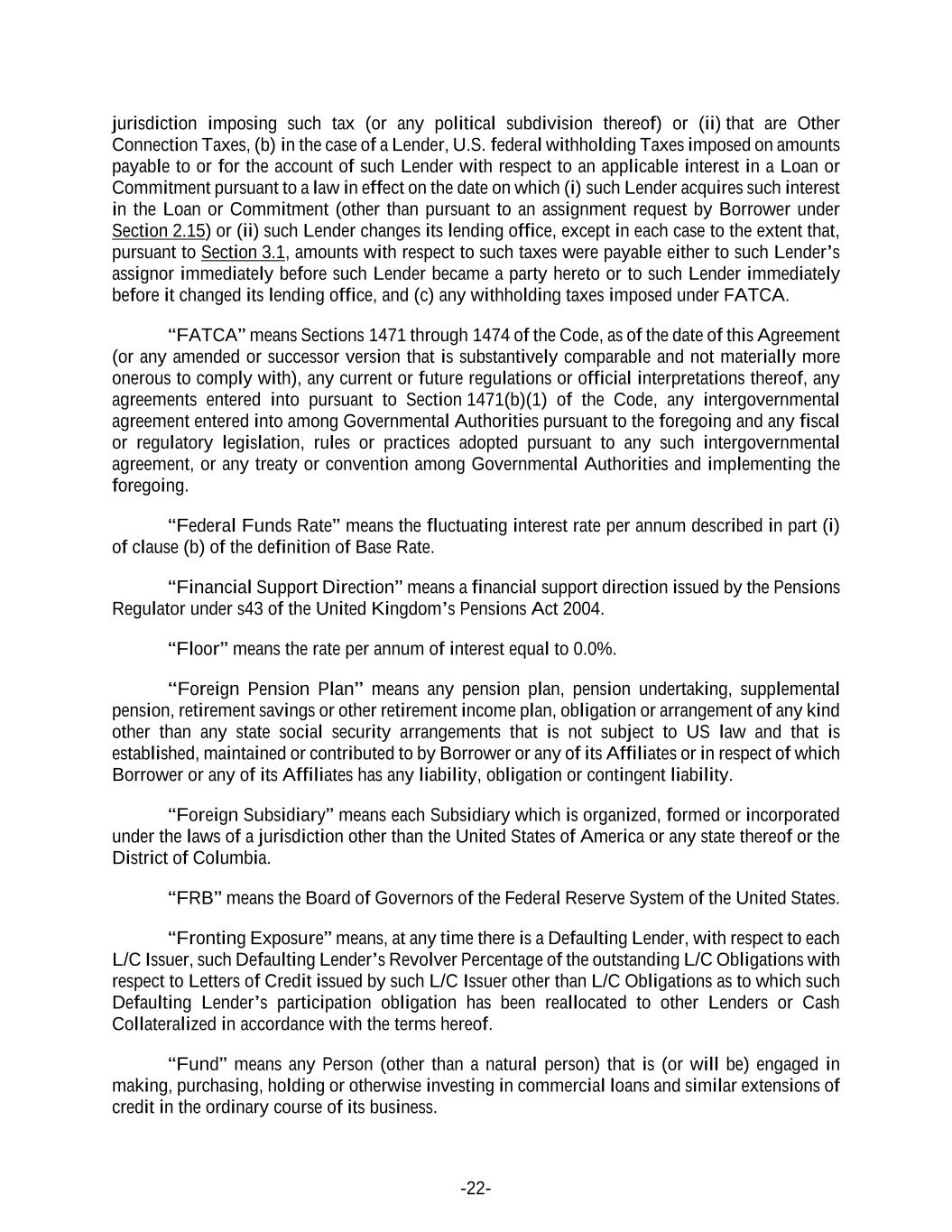 -22- jurisdiction imposing such tax (or any political subdivision thereof) or (ii) that are Other Connection Taxes, (b) in the case of a Lender, U.S. federal withholding Taxes imposed on amounts payable to or for the account of such Lender with respect to an applicable interest in a Loan or Commitment pursuant to a law in effect on the date on which (i) such Lender acquires such interest in the Loan or Commitment (other than pursuant to an assignment request by Borrower under Section 2.15) or (ii) such Lender changes its lending office, except in each case to the extent that, pursuant to Section 3.1, amounts with respect to such taxes were payable either to such Lender’s assignor immediately before such Lender became a party hereto or to such Lender immediately before it changed its lending office, and (c) any withholding taxes imposed under FATCA. “FATCA” means Sections 1471 through 1474 of the Code, as of the date of this Agreement (or any amended or successor version that is substantively comparable and not materially more onerous to comply with), any current or future regulations or official interpretations thereof, any agreements entered into pursuant to Section 1471(b)(1) of the Code, any intergovernmental agreement entered into among Governmental Authorities pursuant to the foregoing and any fiscal or regulatory legislation, rules or practices adopted pursuant to any such intergovernmental agreement, or any treaty or convention among Governmental Authorities and implementing the foregoing. “Federal Funds Rate” means the fluctuating interest rate per annum described in part (i) of clause (b) of the definition of Base Rate. “Financial Support Direction” means a financial support direction issued by the Pensions Regulator under s43 of the United Kingdom’s Pensions Act 2004. “Floor” means the rate per annum of interest equal to 0.0%. “Foreign Pension Plan” means any pension plan, pension undertaking, supplemental pension, retirement savings or other retirement income plan, obligation or arrangement of any kind other than any state social security arrangements that is not subject to US law and that is established, maintained or contributed to by Borrower or any of its Affiliates or in respect of which Borrower or any of its Affiliates has any liability, obligation or contingent liability. “Foreign Subsidiary” means each Subsidiary which is organized, formed or incorporated under the laws of a jurisdiction other than the United States of America or any state thereof or the District of Columbia. “FRB” means the Board of Governors of the Federal Reserve System of the United States. “Fronting Exposure” means, at any time there is a Defaulting Lender, with respect to each L/C Issuer, such Defaulting Lender’s Revolver Percentage of the outstanding L/C Obligations with respect to Letters of Credit issued by such L/C Issuer other than L/C Obligations as to which such Defaulting Lender’s participation obligation has been reallocated to other Lenders or Cash Collateralized in accordance with the terms hereof. “Fund” means any Person (other than a natural person) that is (or will be) engaged in making, purchasing, holding or otherwise investing in commercial loans and similar extensions of credit in the ordinary course of its business.