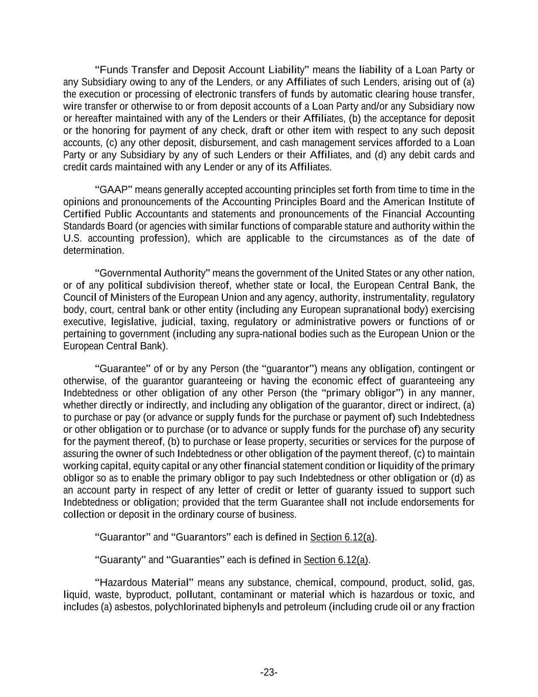 -23- “Funds Transfer and Deposit Account Liability” means the liability of a Loan Party or any Subsidiary owing to any of the Lenders, or any Affiliates of such Lenders, arising out of (a) the execution or processing of electronic transfers of funds by automatic clearing house transfer, wire transfer or otherwise to or from deposit accounts of a Loan Party and/or any Subsidiary now or hereafter maintained with any of the Lenders or their Affiliates, (b) the acceptance for deposit or the honoring for payment of any check, draft or other item with respect to any such deposit accounts, (c) any other deposit, disbursement, and cash management services afforded to a Loan Party or any Subsidiary by any of such Lenders or their Affiliates, and (d) any debit cards and credit cards maintained with any Lender or any of its Affiliates. “GAAP” means generally accepted accounting principles set forth from time to time in the opinions and pronouncements of the Accounting Principles Board and the American Institute of Certified Public Accountants and statements and pronouncements of the Financial Accounting Standards Board (or agencies with similar functions of comparable stature and authority within the U.S. accounting profession), which are applicable to the circumstances as of the date of determination. “Governmental Authority” means the government of the United States or any other nation, or of any political subdivision thereof, whether state or local, the European Central Bank, the Council of Ministers of the European Union and any agency, authority, instrumentality, regulatory body, court, central bank or other entity (including any European supranational body) exercising executive, legislative, judicial, taxing, regulatory or administrative powers or functions of or pertaining to government (including any supra-national bodies such as the European Union or the European Central Bank). “Guarantee” of or by any Person (the “guarantor”) means any obligation, contingent or otherwise, of the guarantor guaranteeing or having the economic effect of guaranteeing any Indebtedness or other obligation of any other Person (the “primary obligor”) in any manner, whether directly or indirectly, and including any obligation of the guarantor, direct or indirect, (a) to purchase or pay (or advance or supply funds for the purchase or payment of) such Indebtedness or other obligation or to purchase (or to advance or supply funds for the purchase of) any security for the payment thereof, (b) to purchase or lease property, securities or services for the purpose of assuring the owner of such Indebtedness or other obligation of the payment thereof, (c) to maintain working capital, equity capital or any other financial statement condition or liquidity of the primary obligor so as to enable the primary obligor to pay such Indebtedness or other obligation or (d) as an account party in respect of any letter of credit or letter of guaranty issued to support such Indebtedness or obligation; provided that the term Guarantee shall not include endorsements for collection or deposit in the ordinary course of business. “Guarantor” and “Guarantors” each is defined in Section 6.12(a). “Guaranty” and “Guaranties” each is defined in Section 6.12(a). “Hazardous Material” means any substance, chemical, compound, product, solid, gas, liquid, waste, byproduct, pollutant, contaminant or material which is hazardous or toxic, and includes (a) asbestos, polychlorinated biphenyls and petroleum (including crude oil or any fraction